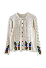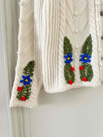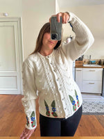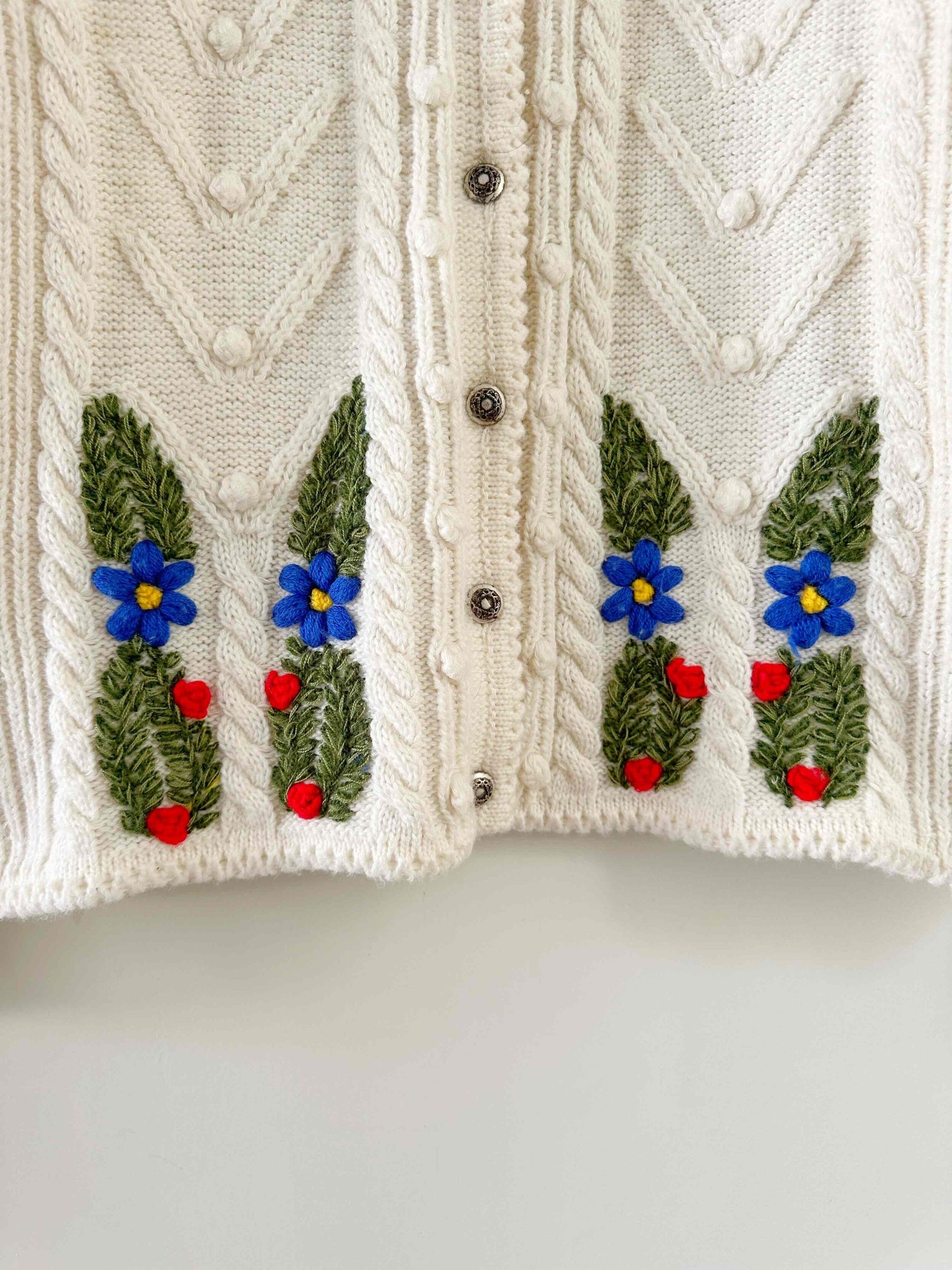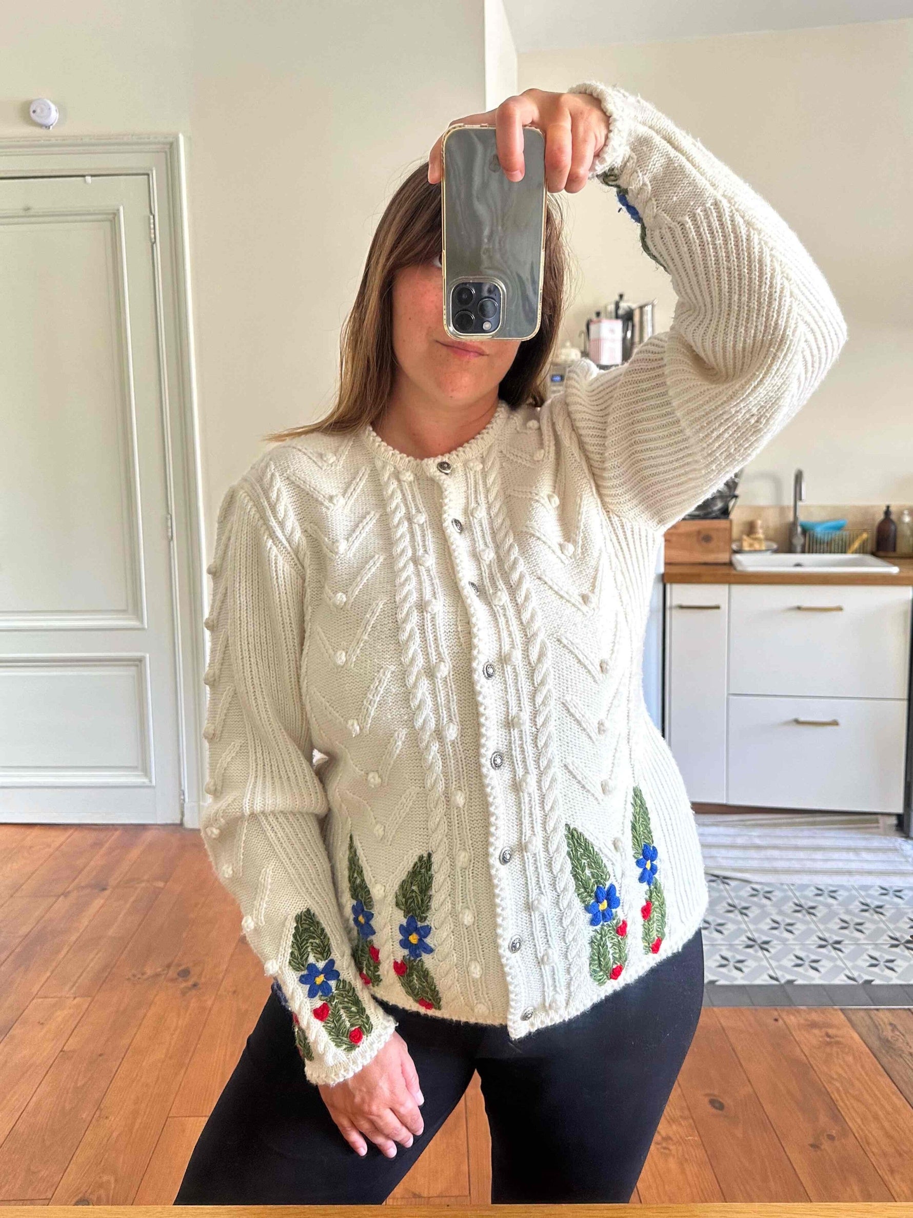 Prix unitaire parCardigan autrichien, en laine mélangée ecrue, maille popcorn pompons brodés, torsades, et fleurs brodées mains en bas et bas de manches rouges, bleues, jaunes et vertes, boutons bijoux argentés, fabriqué en Autriche, convient aux tailles 40 et 42, porté ici sur une personne T40.