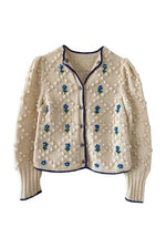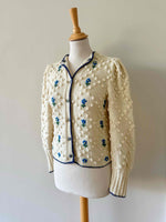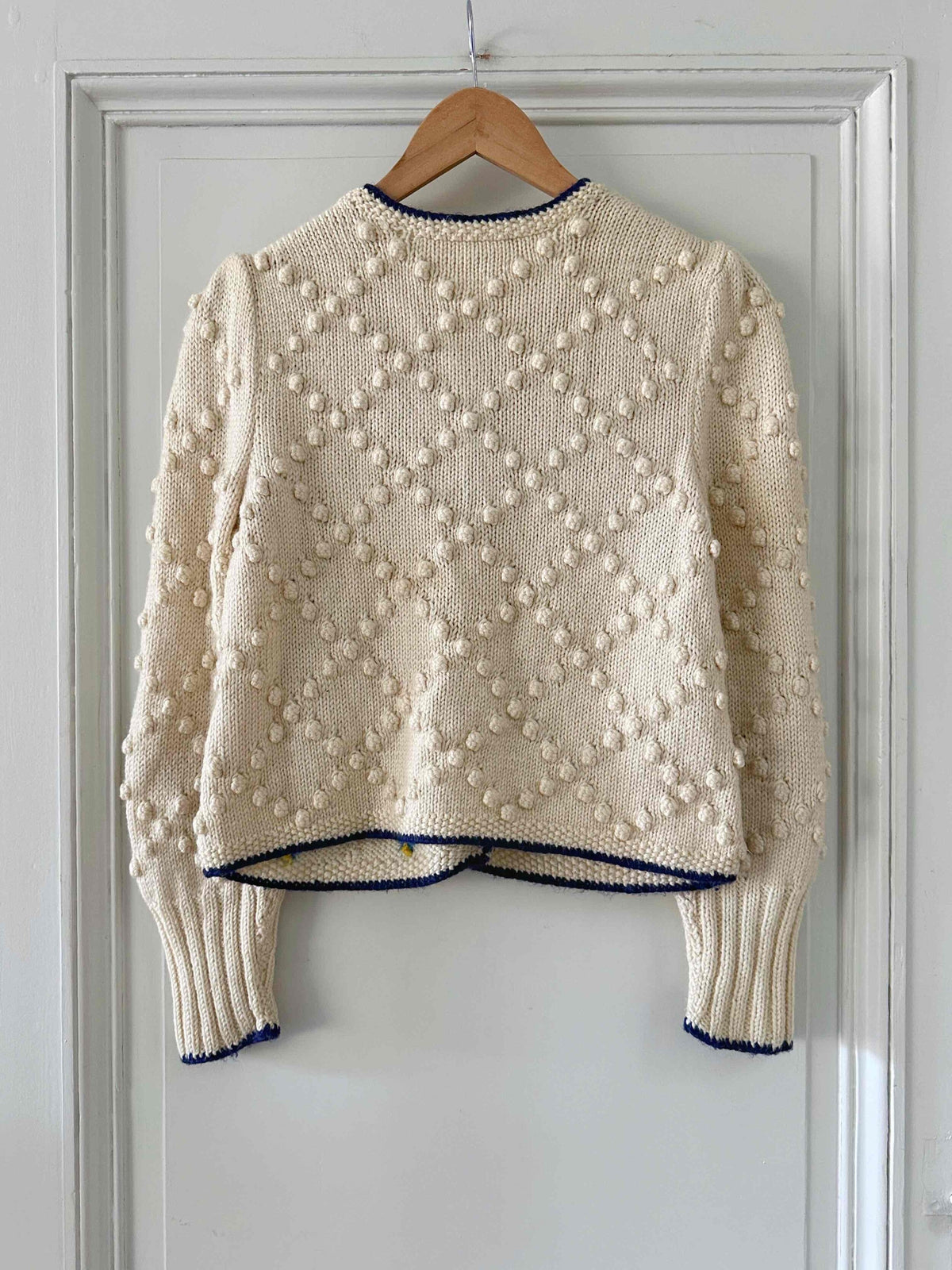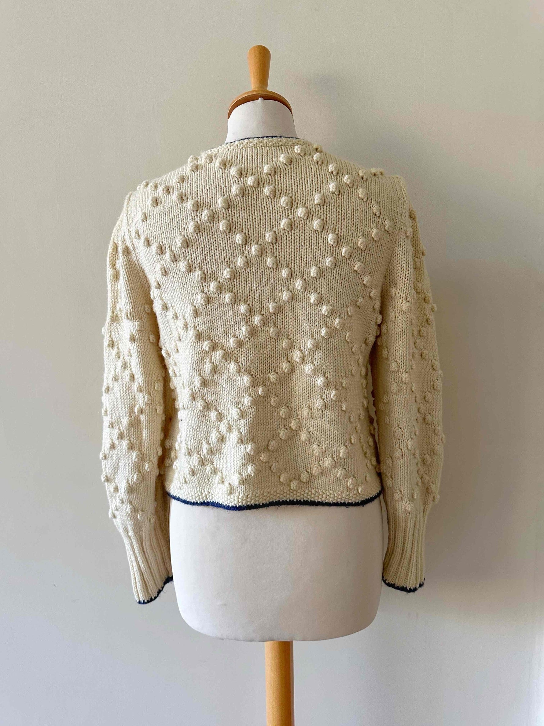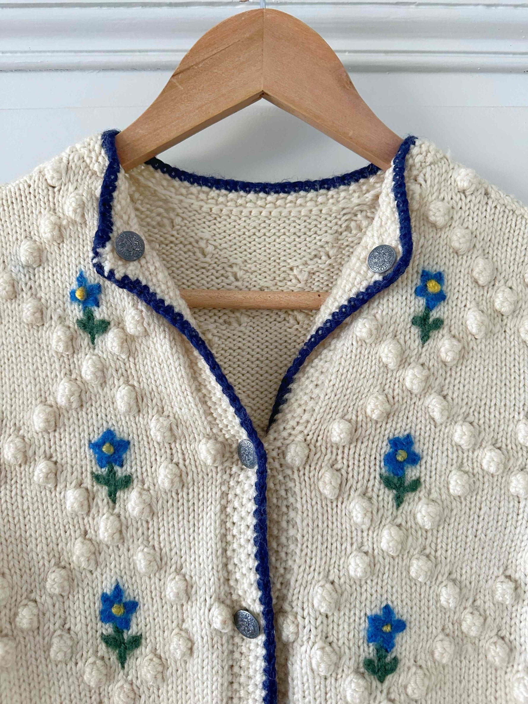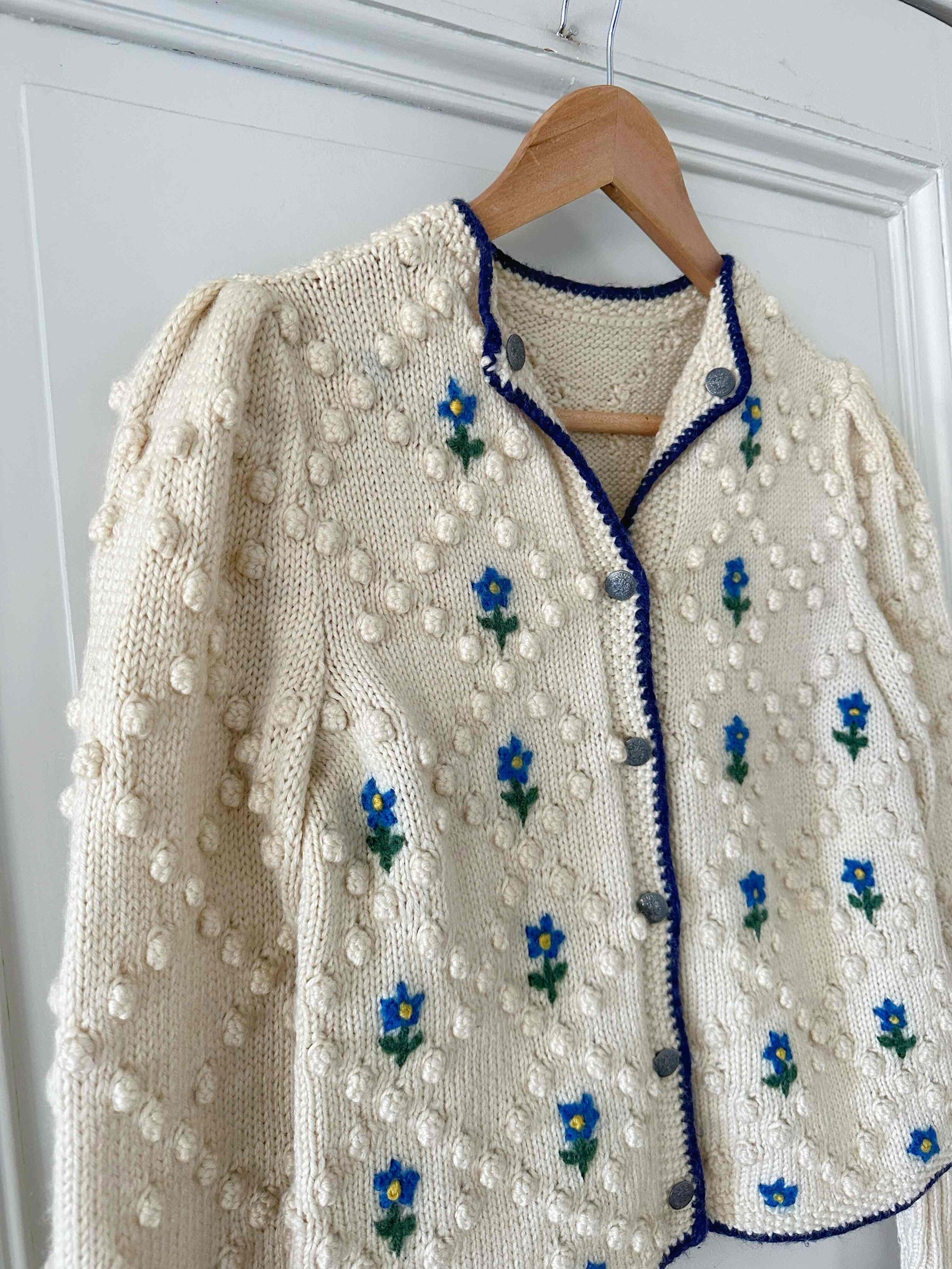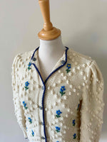 Prix unitaire parCardigan autrichien en pure laine écrue, maille popcorn pompons brodés, fleurs brodées bleues, jaunes et vertes, col à revers boutonnés, manches ballons, tricoté mains en Autriche, taille 36 porté ici sur un mannequin T36.
