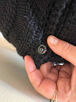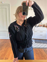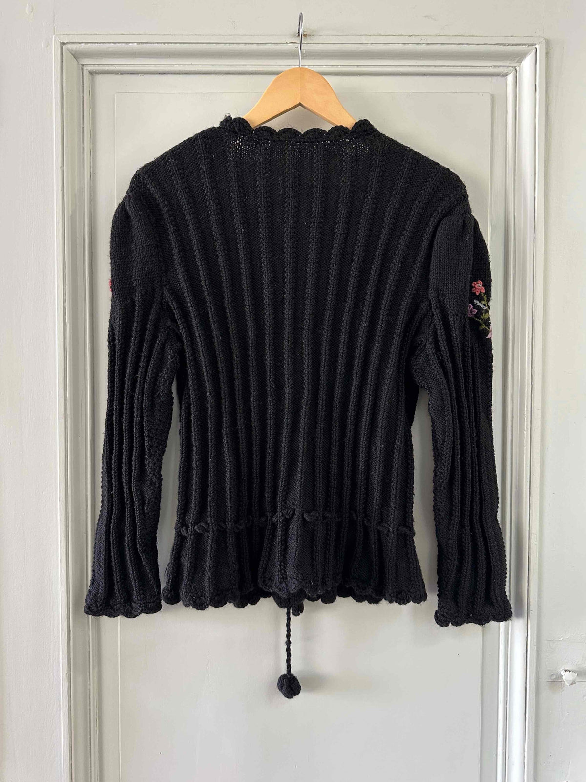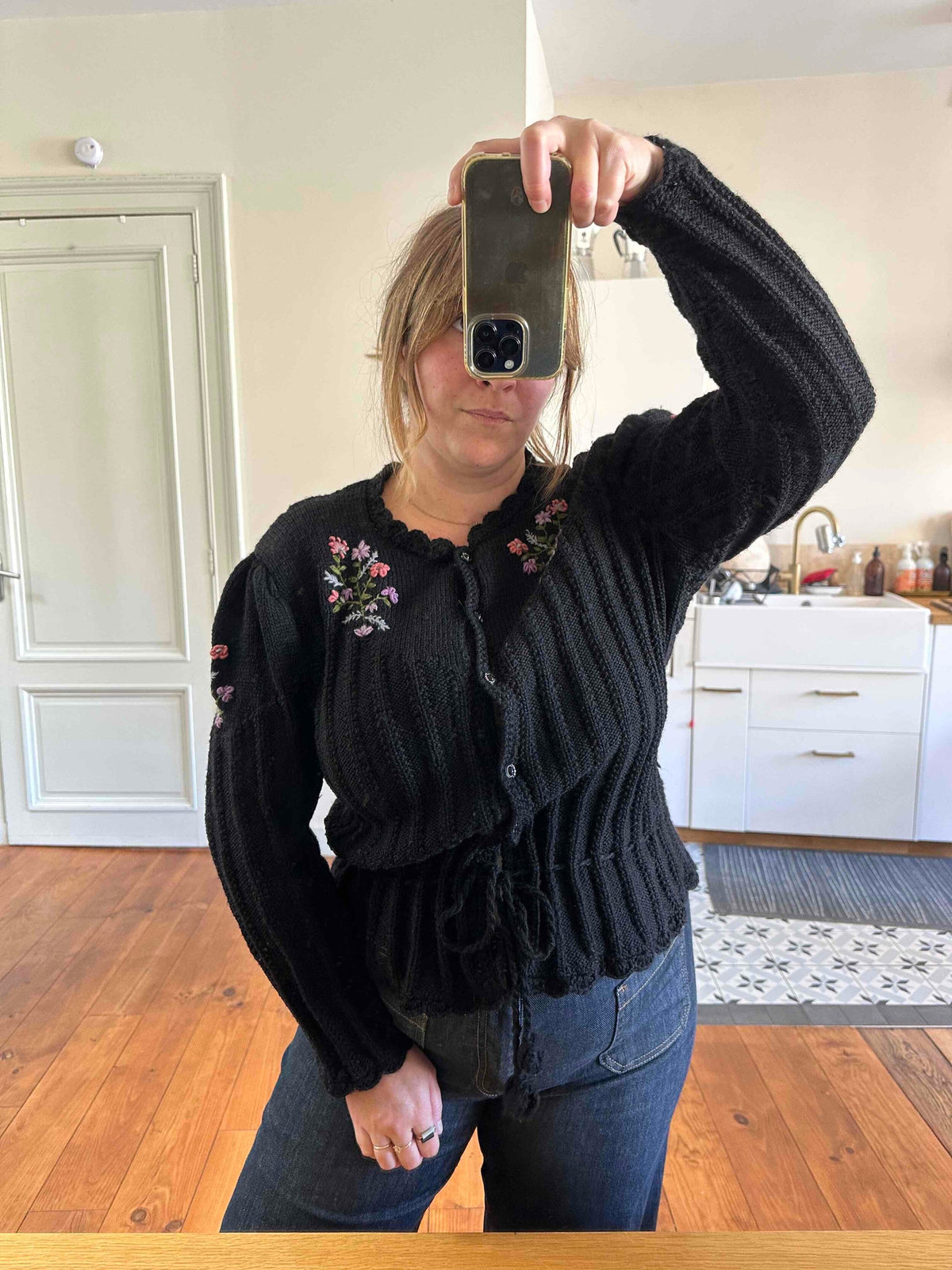 Cardigan autrichien, en laine noire maille côtes anglaises, brodé de fleurs multicolores, manches ballons gigots brodées, boutons bijoux fleuris, taille à nouer par un cordon aux embouts fleurs, tricoté mains, convient aux tailles 38 et 40 porté ici sur une personne T40.