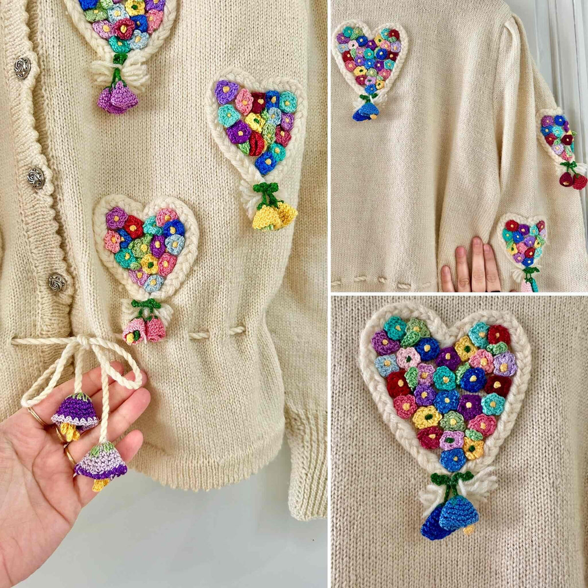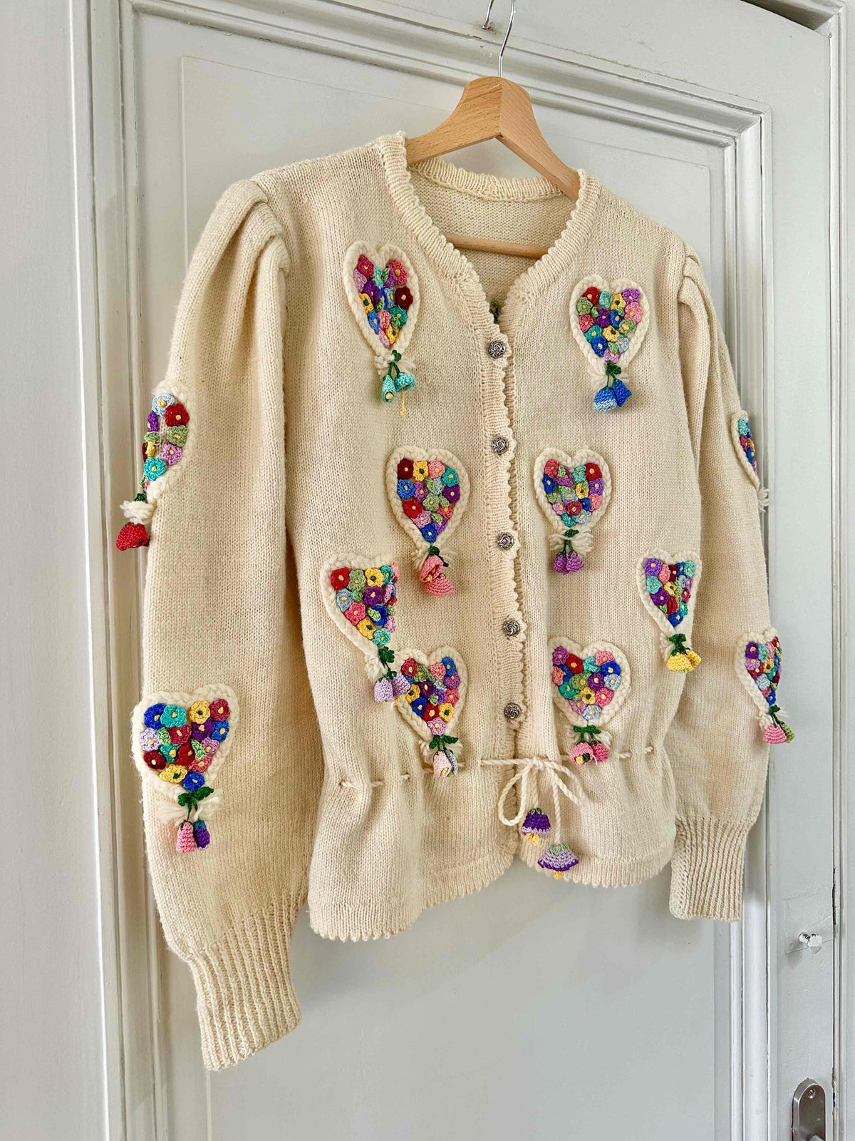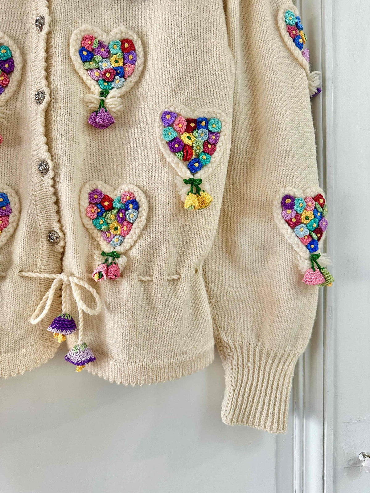 Cardigan Autrichien, en laine écrue, maille torsadée en forme de coeurs brodé de petites fleurs multicolores au crochet, taille à nouer par cordon et embouts fleurs.