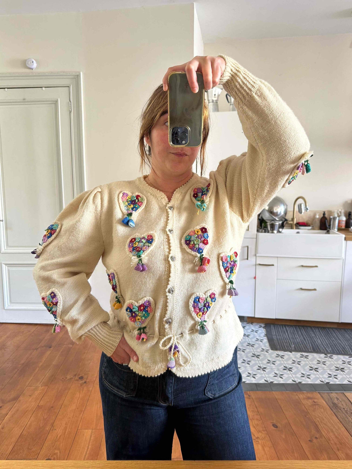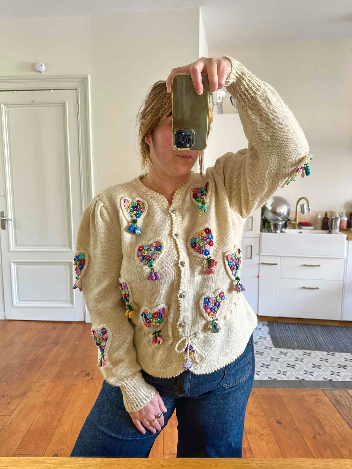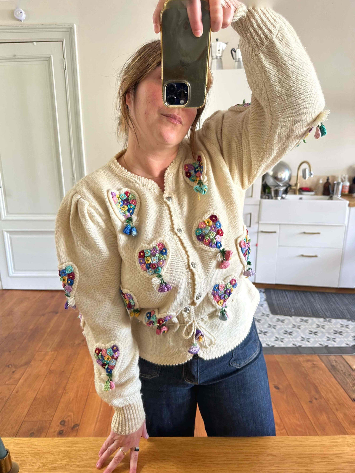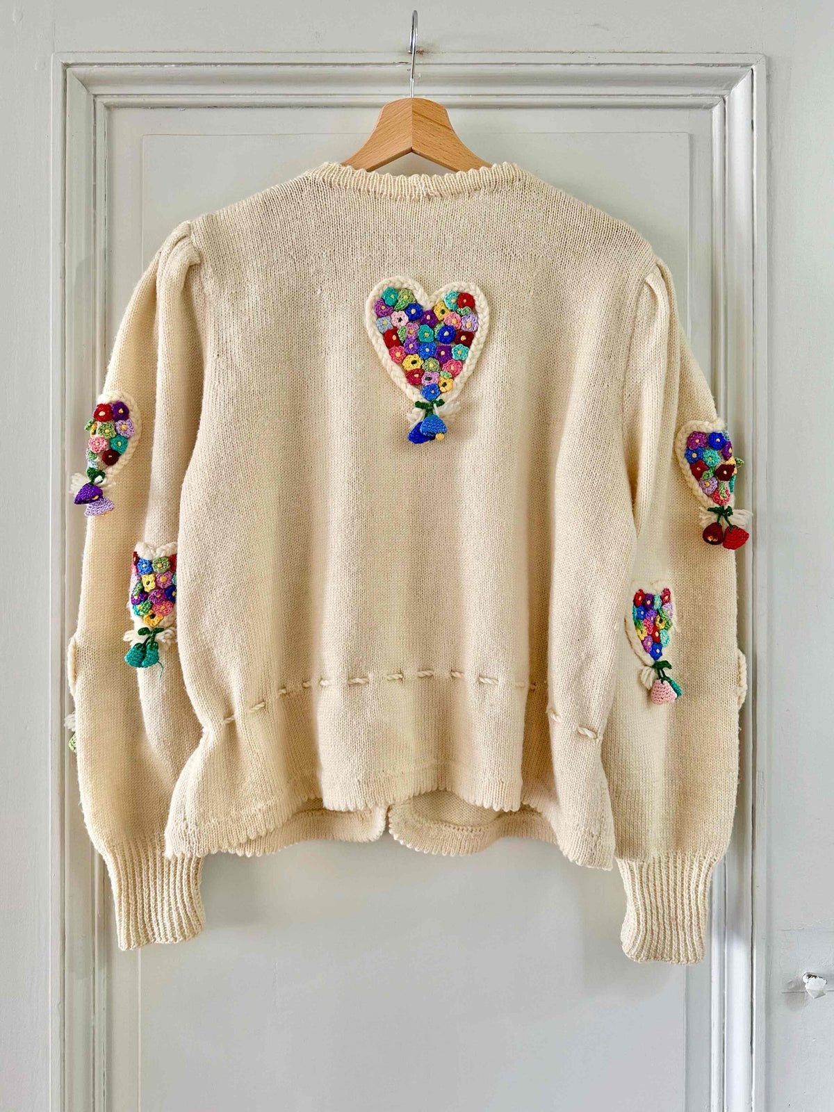 Cardigan Autrichien, en laine écrue, maille torsadée en forme de coeurs brodé de petites fleurs multicolores au crochet, taille à nouer par cordon et embouts fleurs.