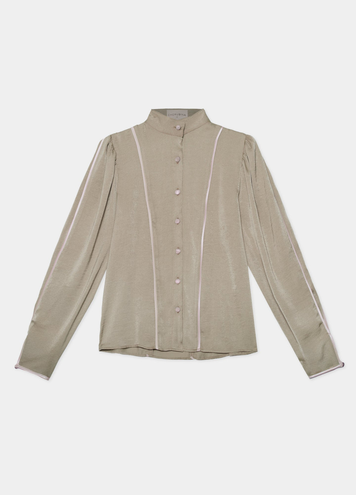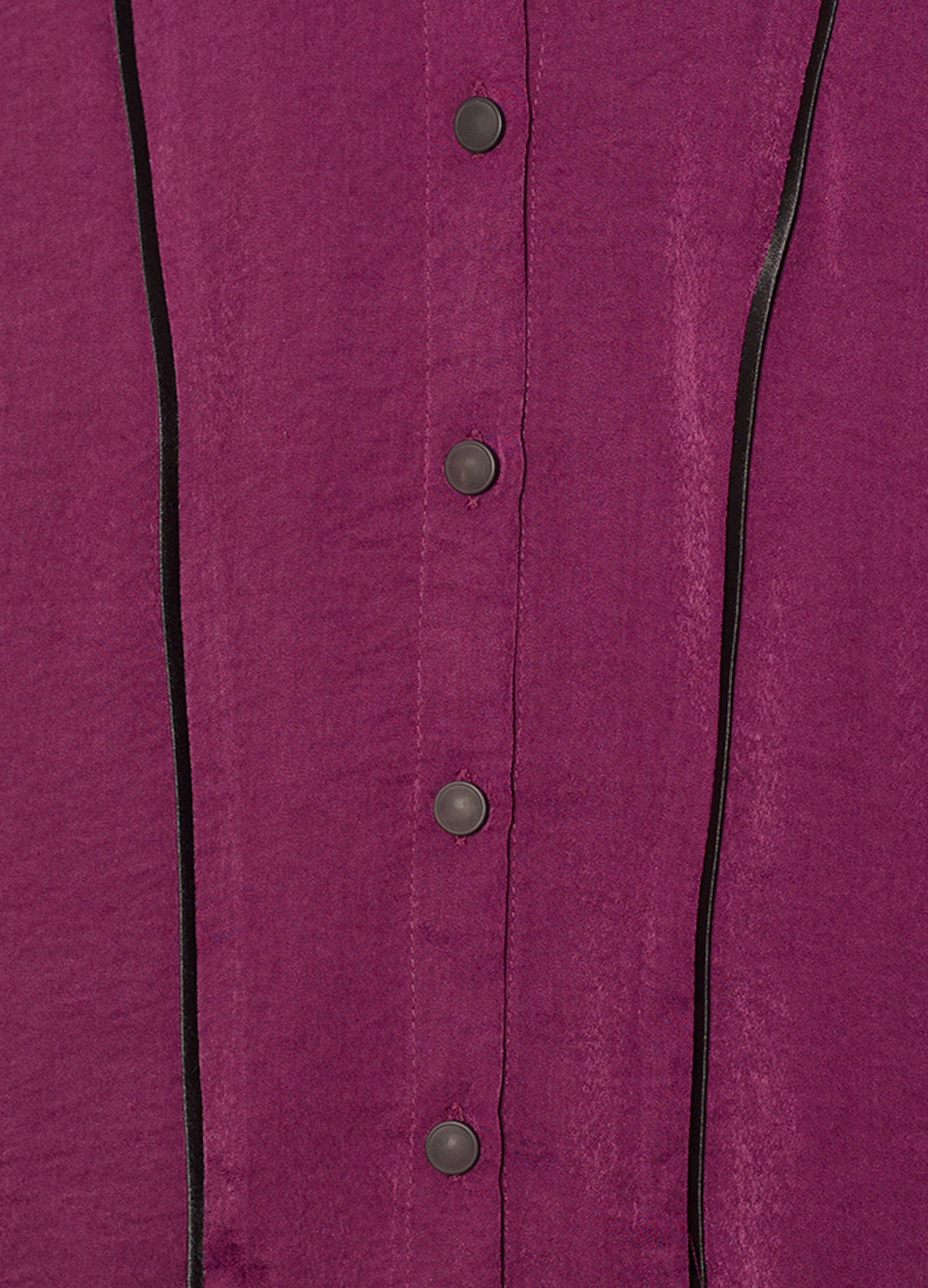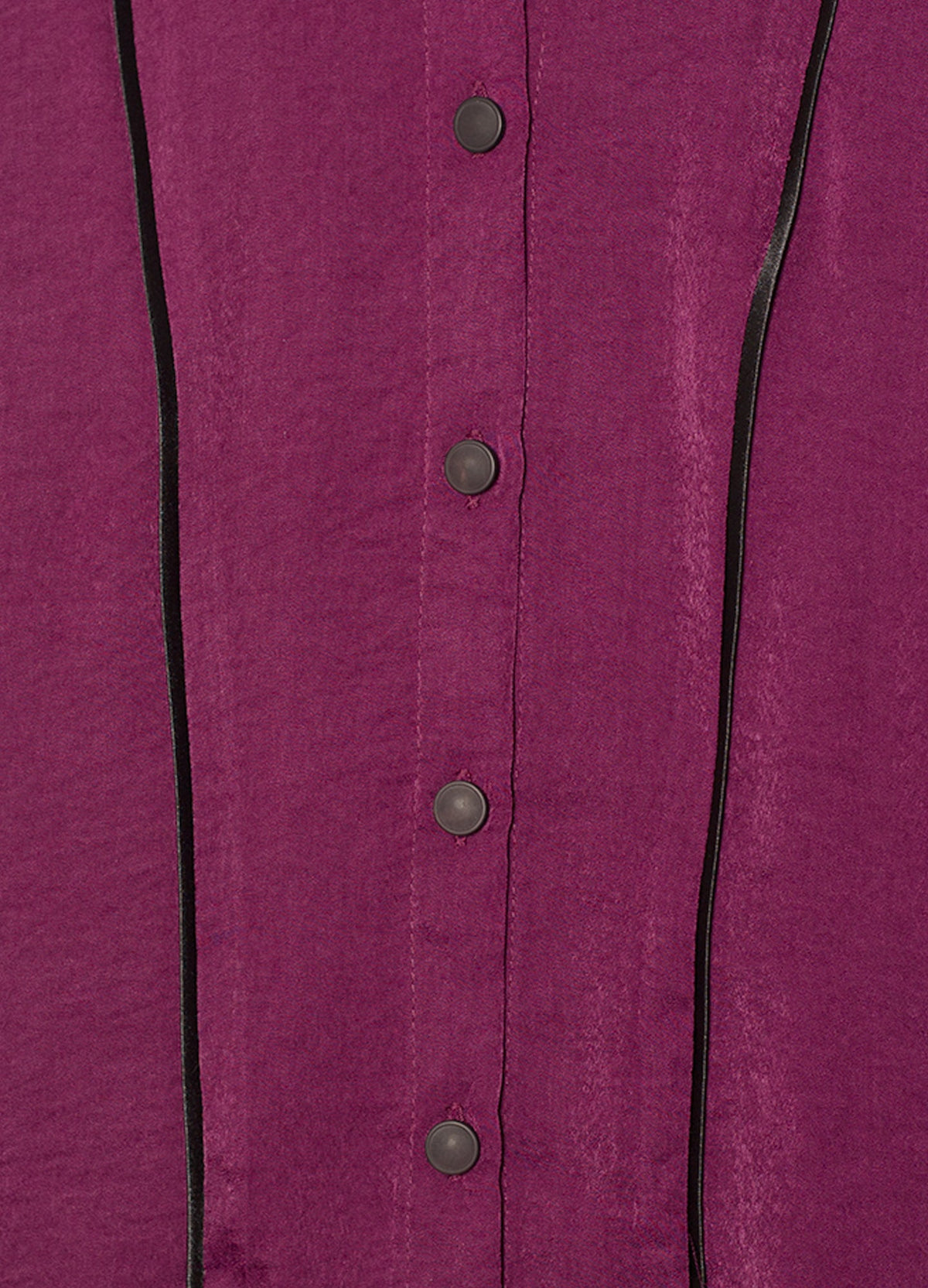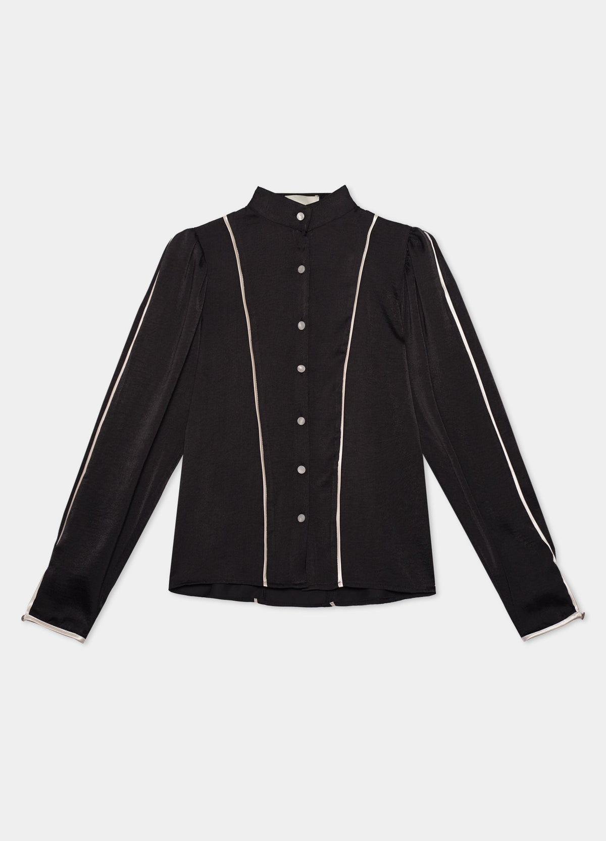 Camisa de manga larga con cuello mao y abertura frontal con botones. Los cortes del cuerpo y los puños presentan vivos contrastados, con cierre de botón en las mangas. Confeccionada en tejido satinado.