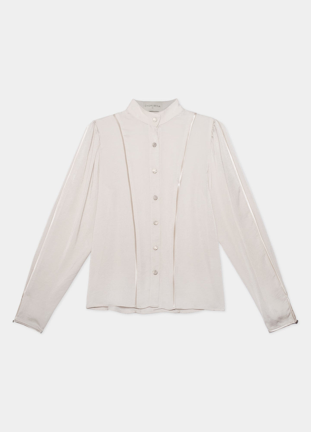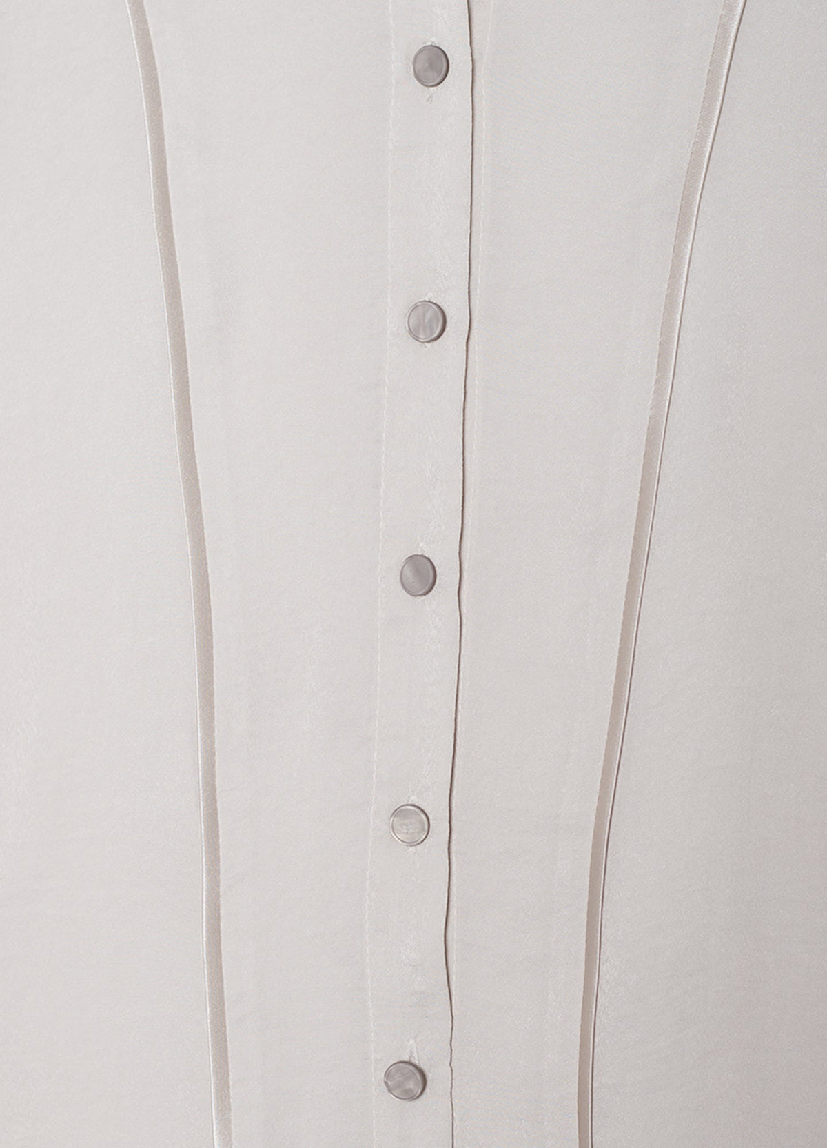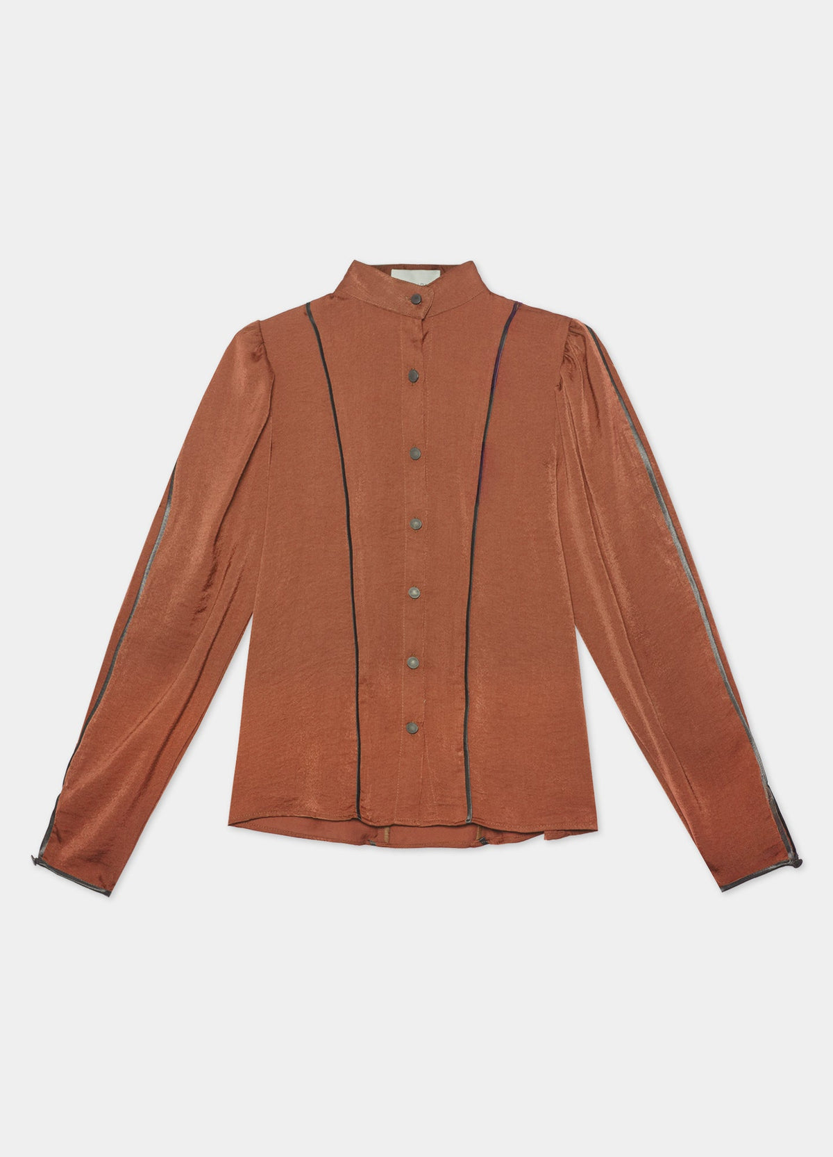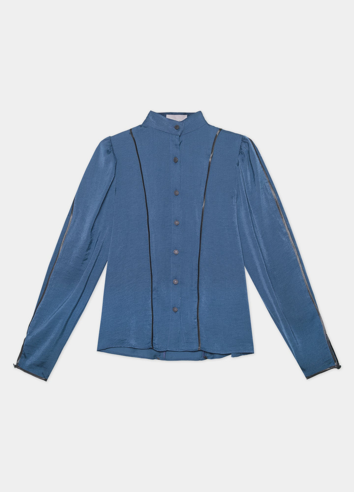 Camisa de manga larga con cuello mao y abertura frontal con botones. Los cortes del cuerpo y los puños presentan vivos contrastados, con cierre de botón en las mangas. Confeccionada en tejido satinado.