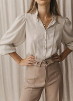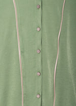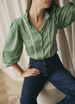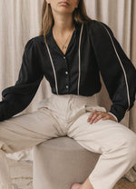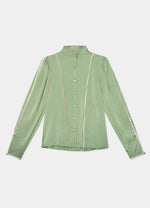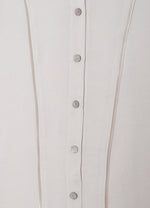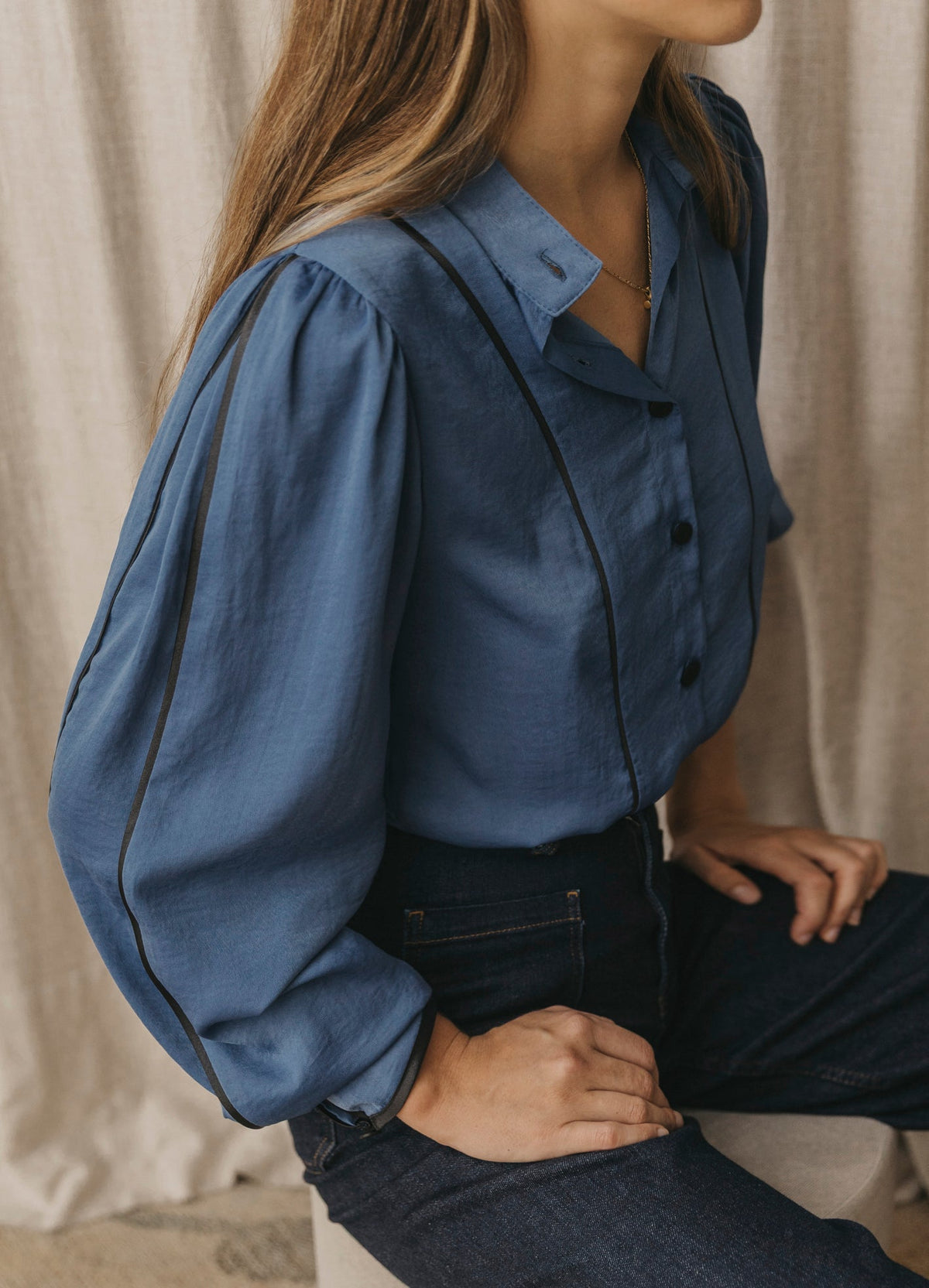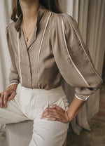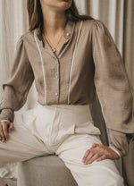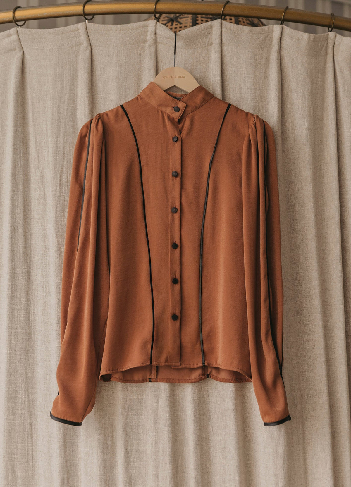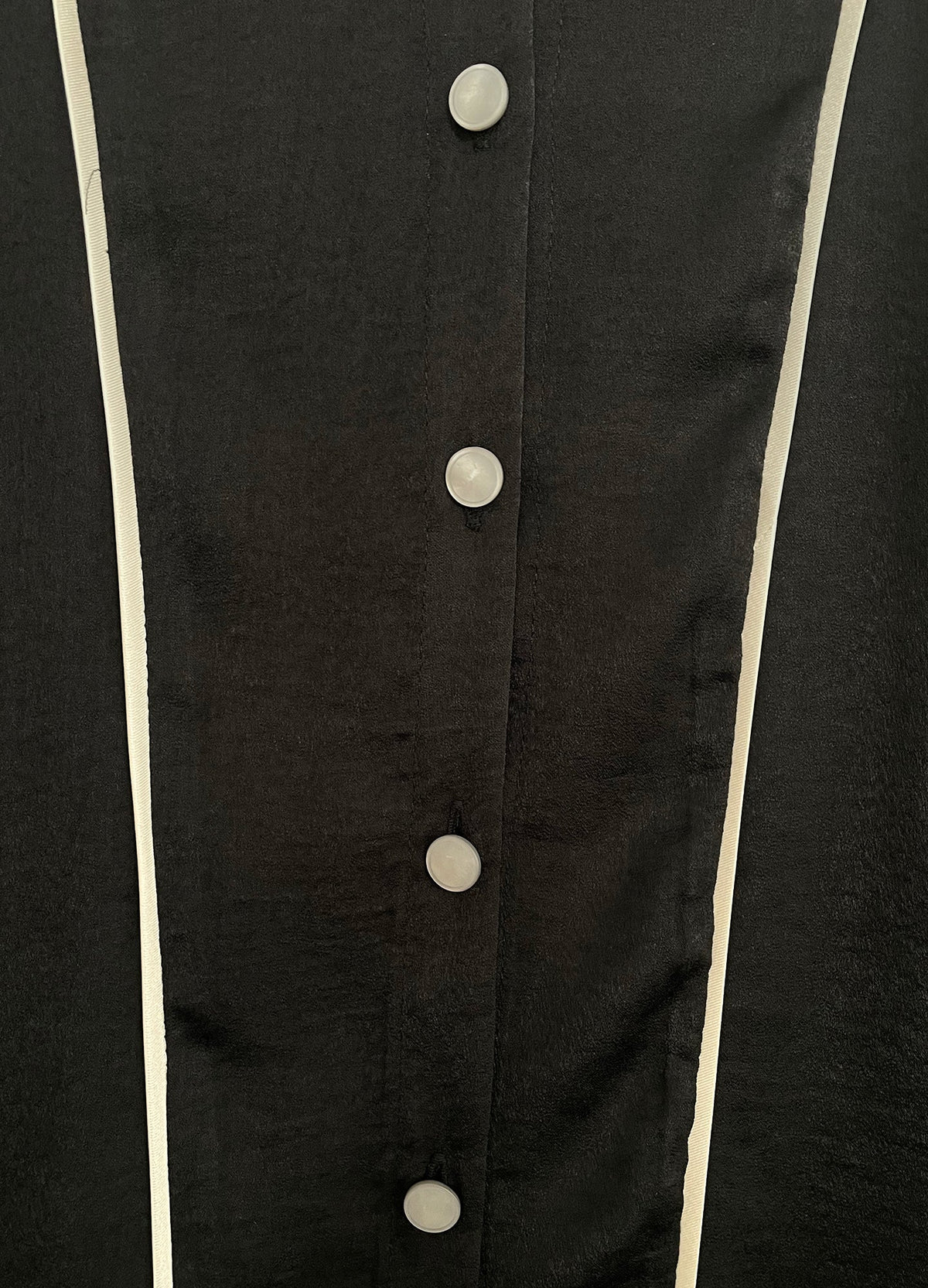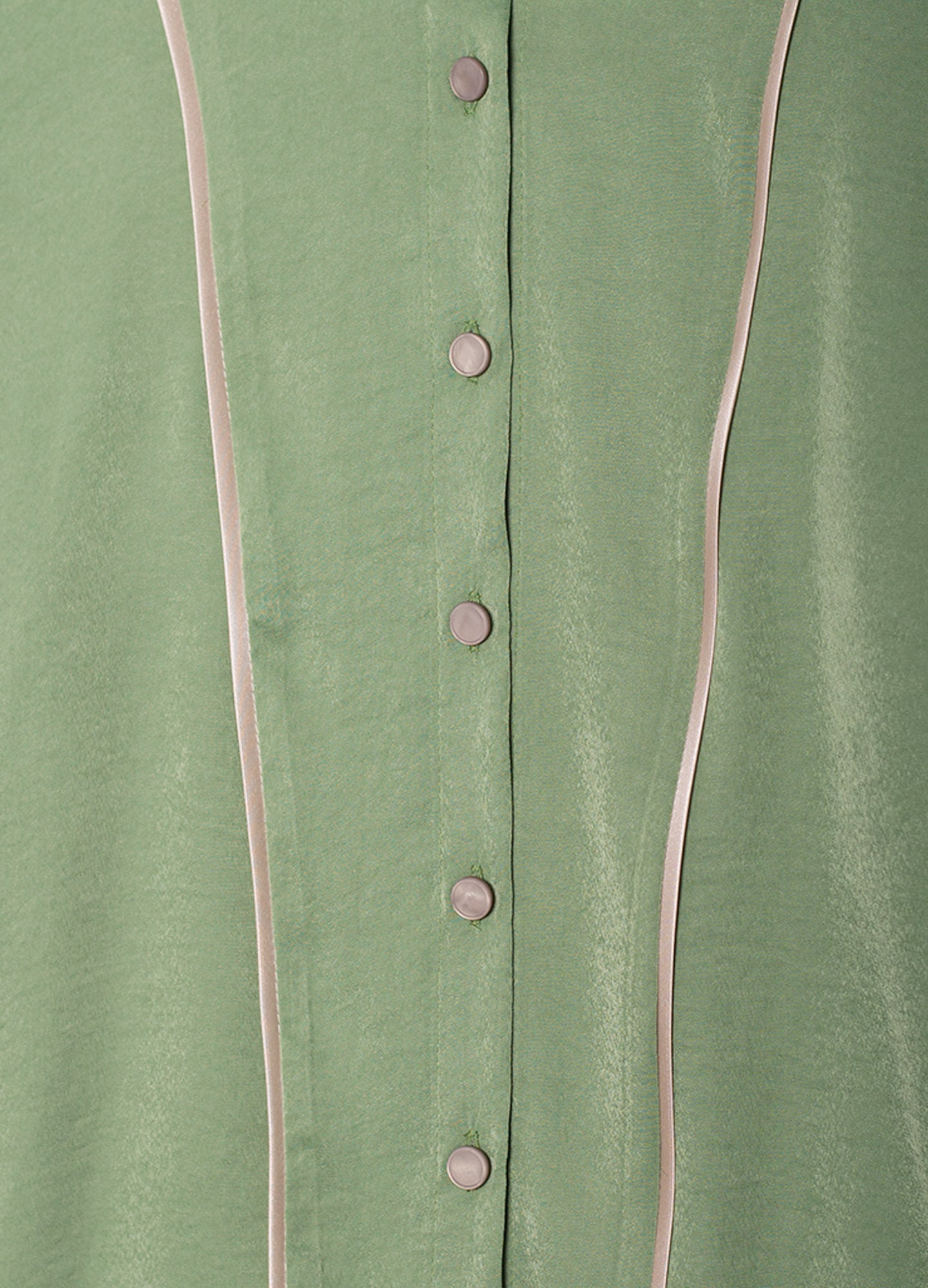 Camisa de manga larga con cuello mao y abertura frontal con botones. Los cortes del cuerpo y los puños presentan vivos contrastados, con cierre de botón en las mangas. Confeccionada en tejido satinado.