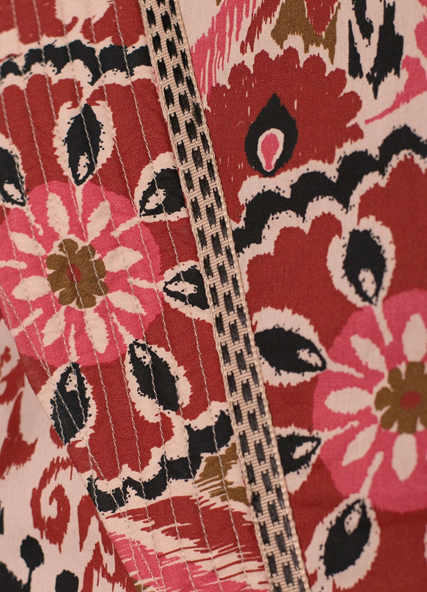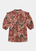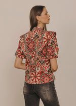 Blusa estampada de corte recto con cuello mao y manga 3/4. Cierre central con botones forrados. Hombros realzados con pieza pespunteada y detalles de cinta de pasamanería tejida artesanalmente.