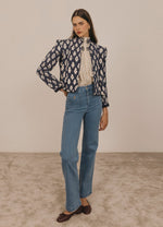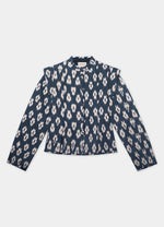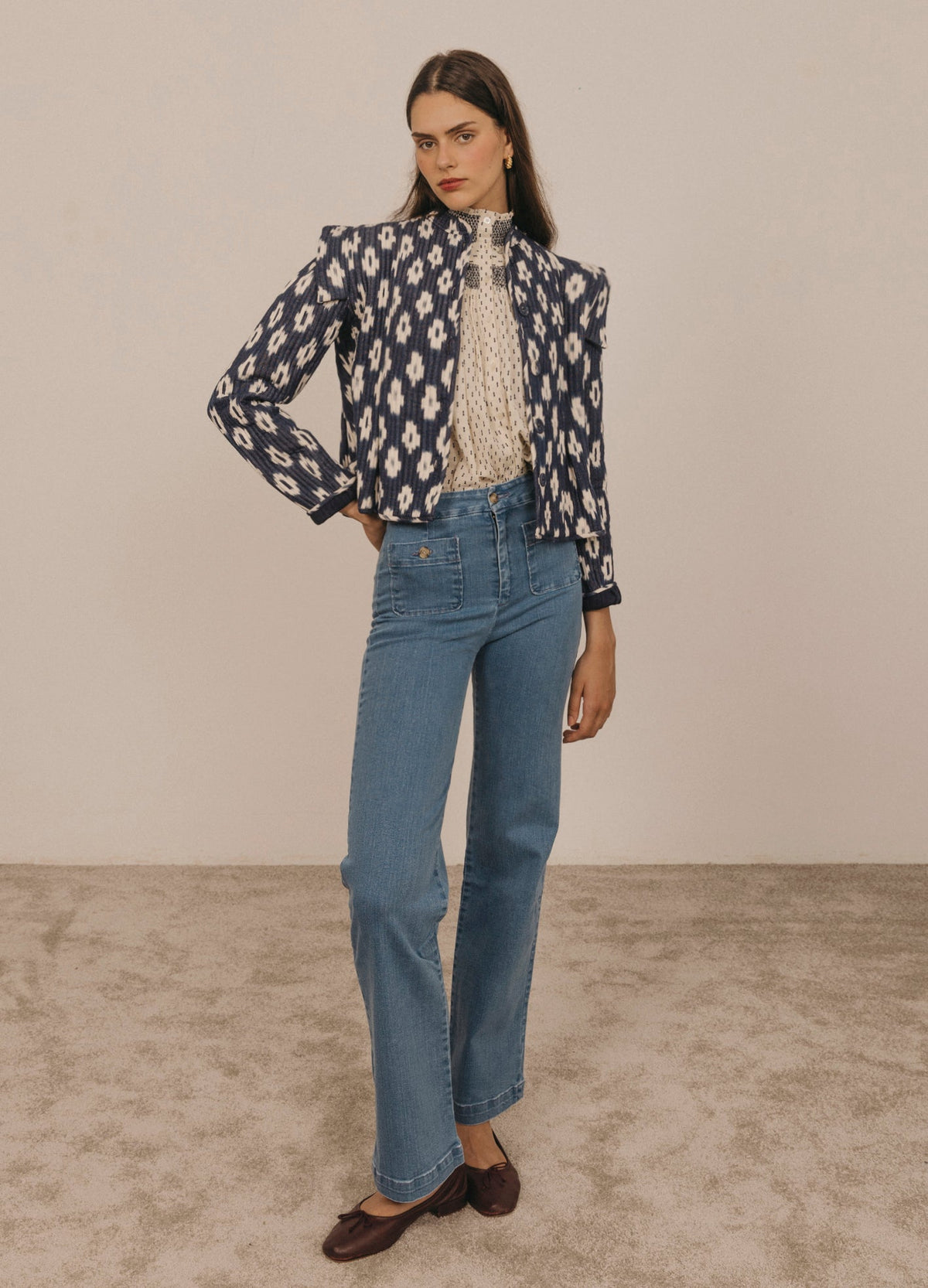 Chaqueta acolchada de corte recto con cuello mao y manga larga. Confeccionada en tejido jacquard artesanal. Abertura frontal con botones, fuelles delanteros y traseros, y mangas oversize con detalle en los hombros.