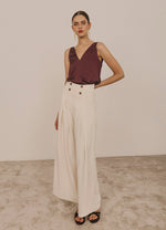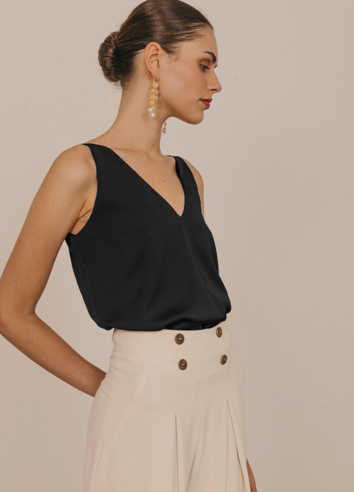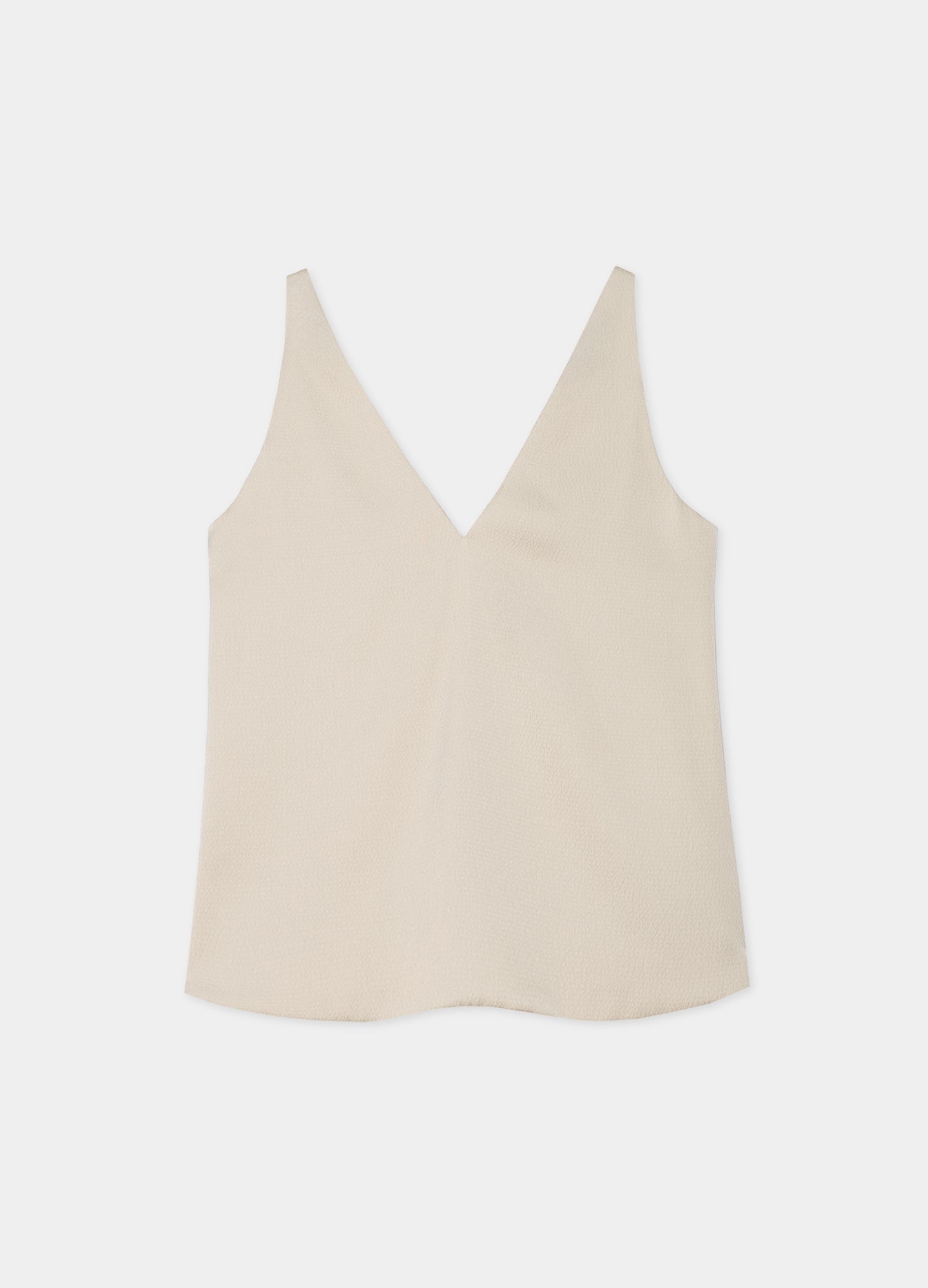 Top liso sin mangas confeccionado en tejido con textura. Diseño sencillo con escote en pico y sin cierre. Corte recto y versátil para combinar con faldas o pantalones.