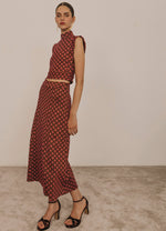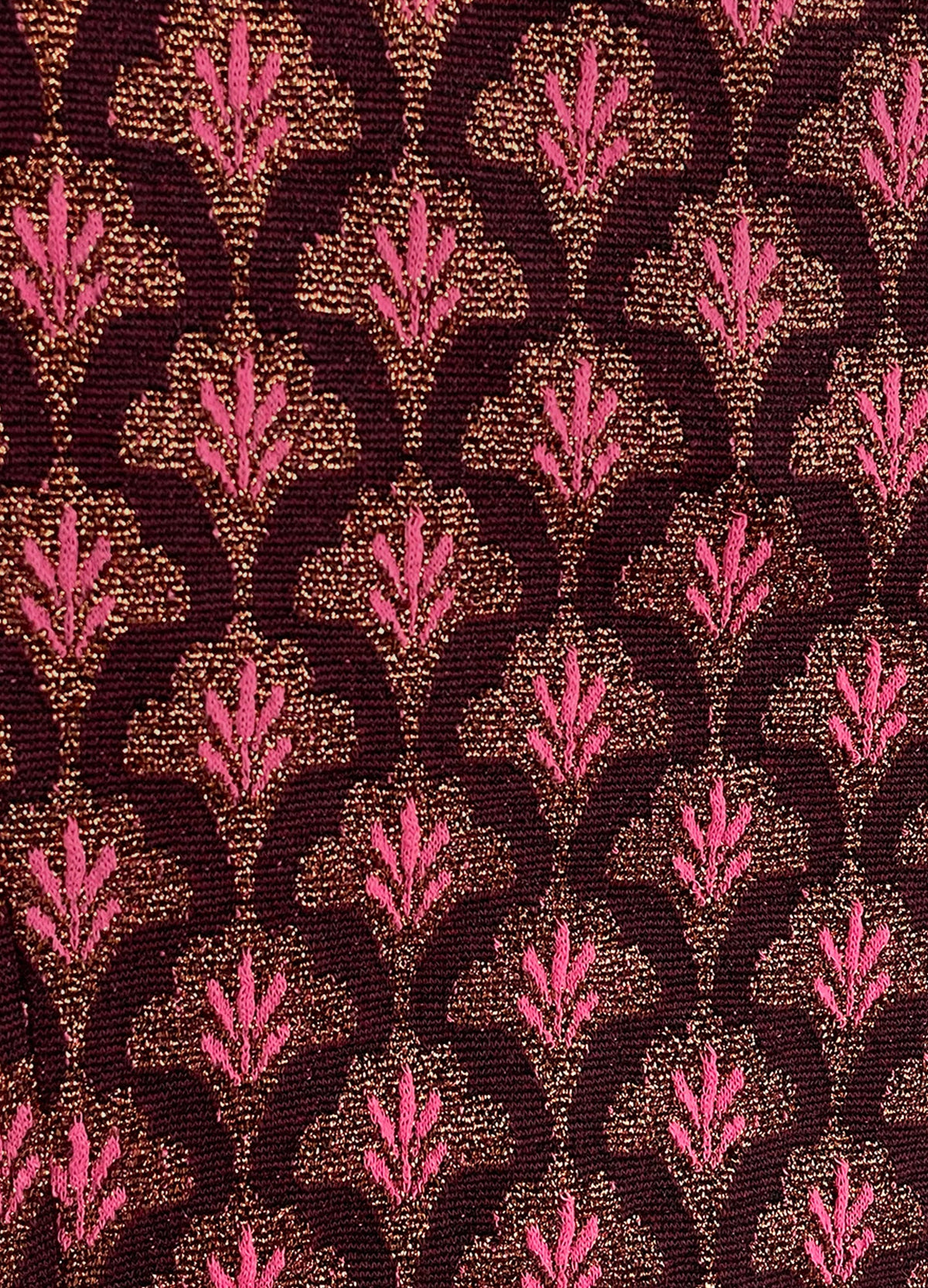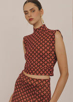 Top corto en tejido jacquard con lúrex, de diseño geométrico. Presenta cuello redondo alto y manga sisa. Las piezas decorativas se prolongan hasta una pieza ancha en la cintura. Cierre trasero con cremallera invisible. Ideal para combinar con la falda Primavese.