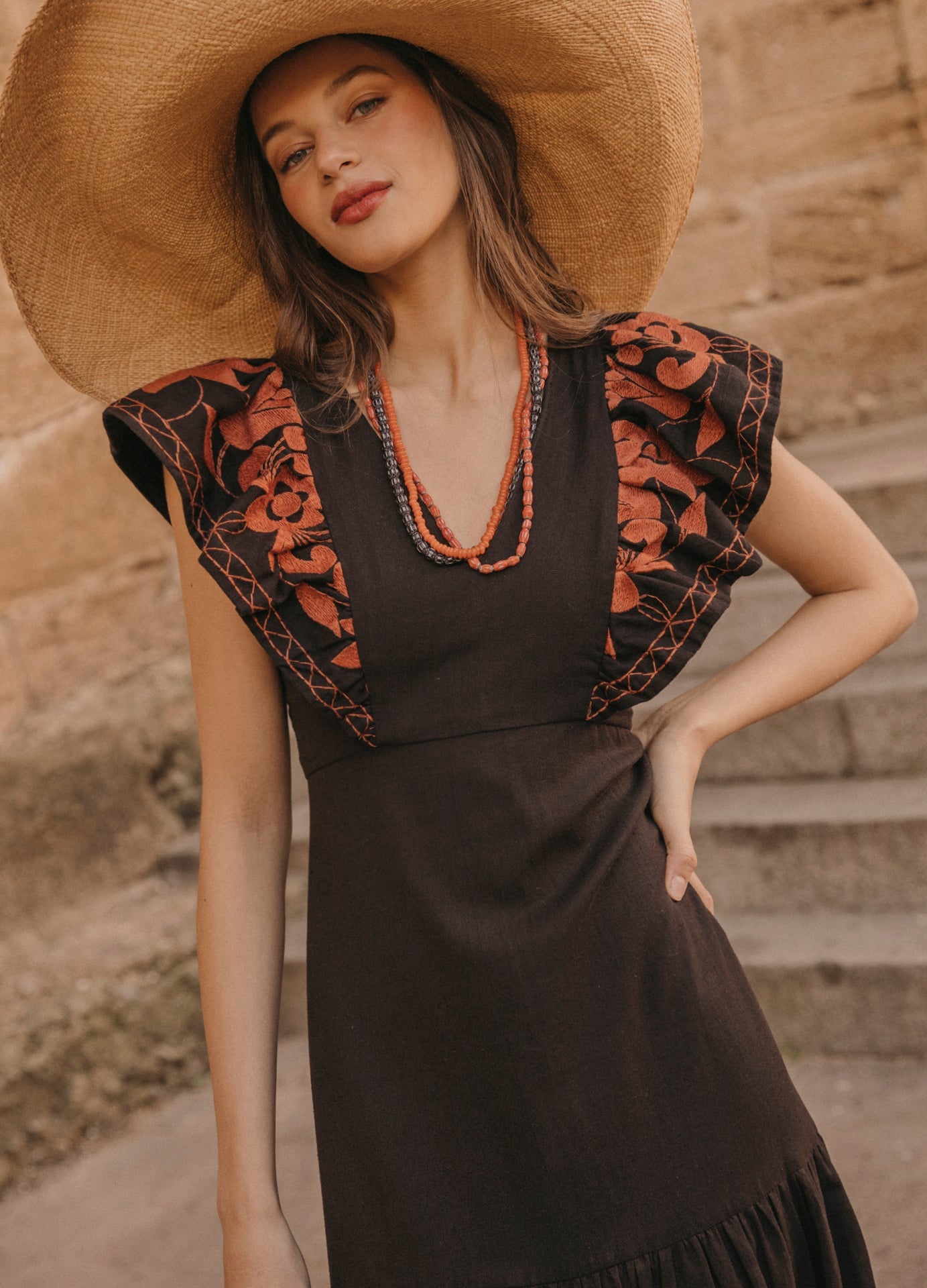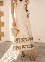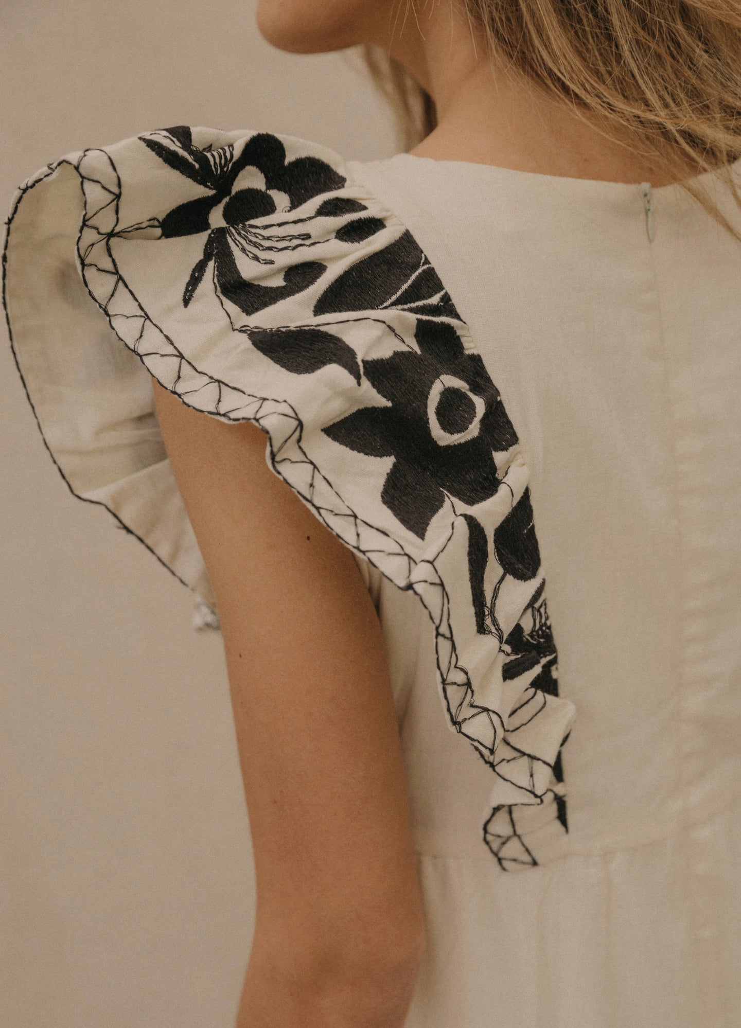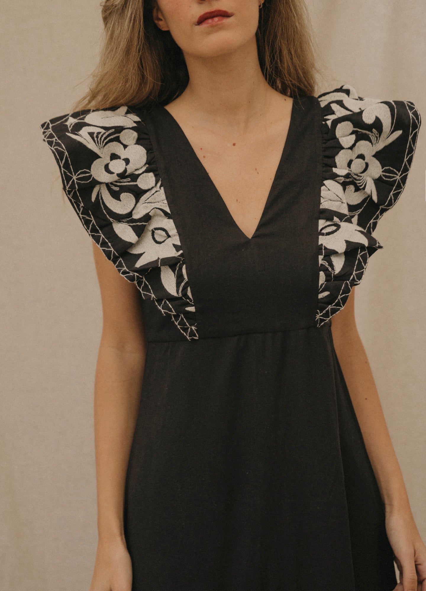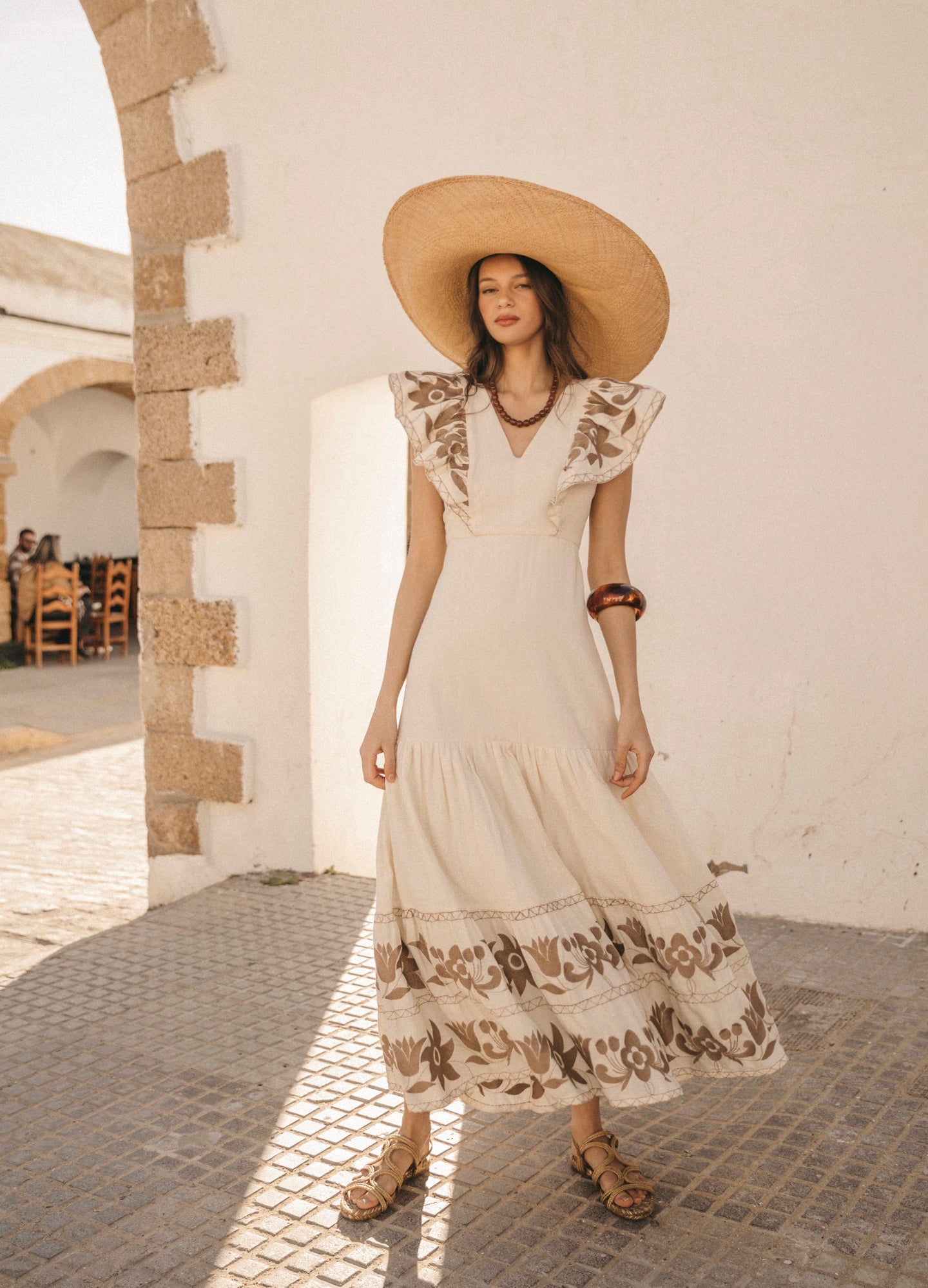 Vestido midi de escote en V y sin mangas, con volantes en los hombros adornados con un bordado floral. Presenta un corte debajo del pecho y una falda fruncida con vuelo, también decorada con una franja bordada. Cierre en la espalda con cremallera invisible.