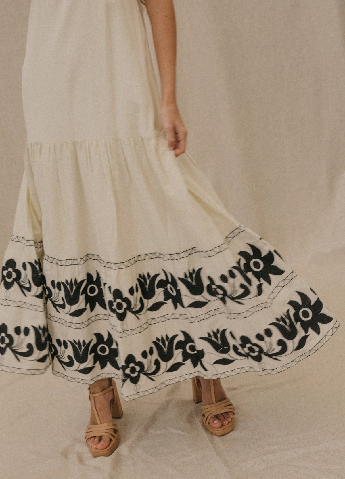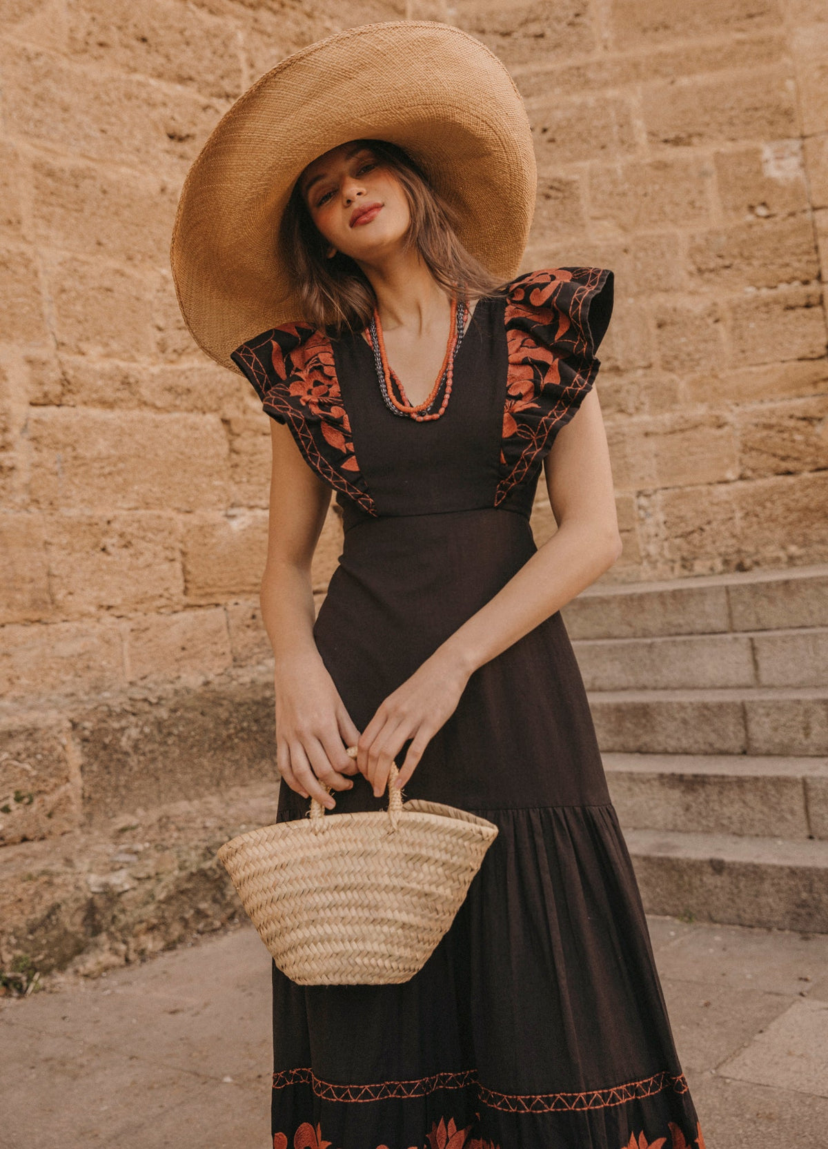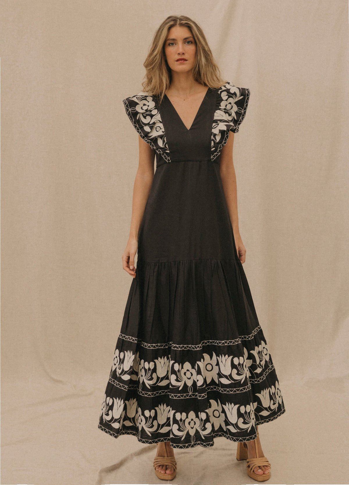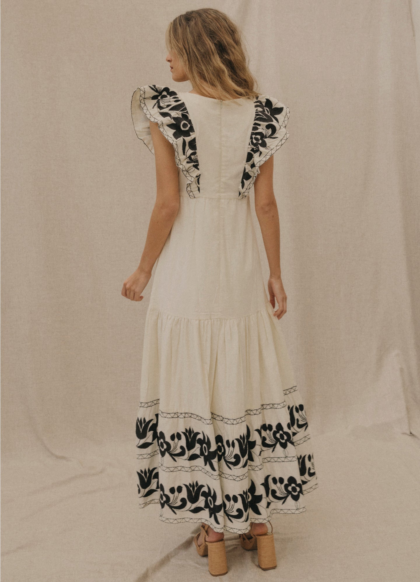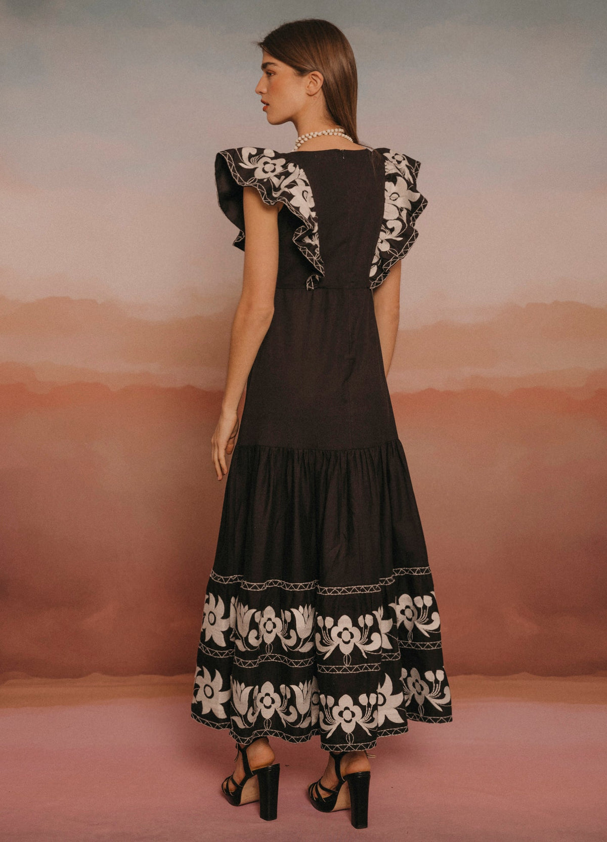 Vestido midi de escote en V y sin mangas, con volantes en los hombros adornados con un bordado floral. Presenta un corte debajo del pecho y una falda fruncida con vuelo, también decorada con una franja bordada. Cierre en la espalda con cremallera invisible.