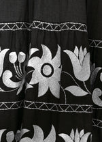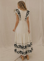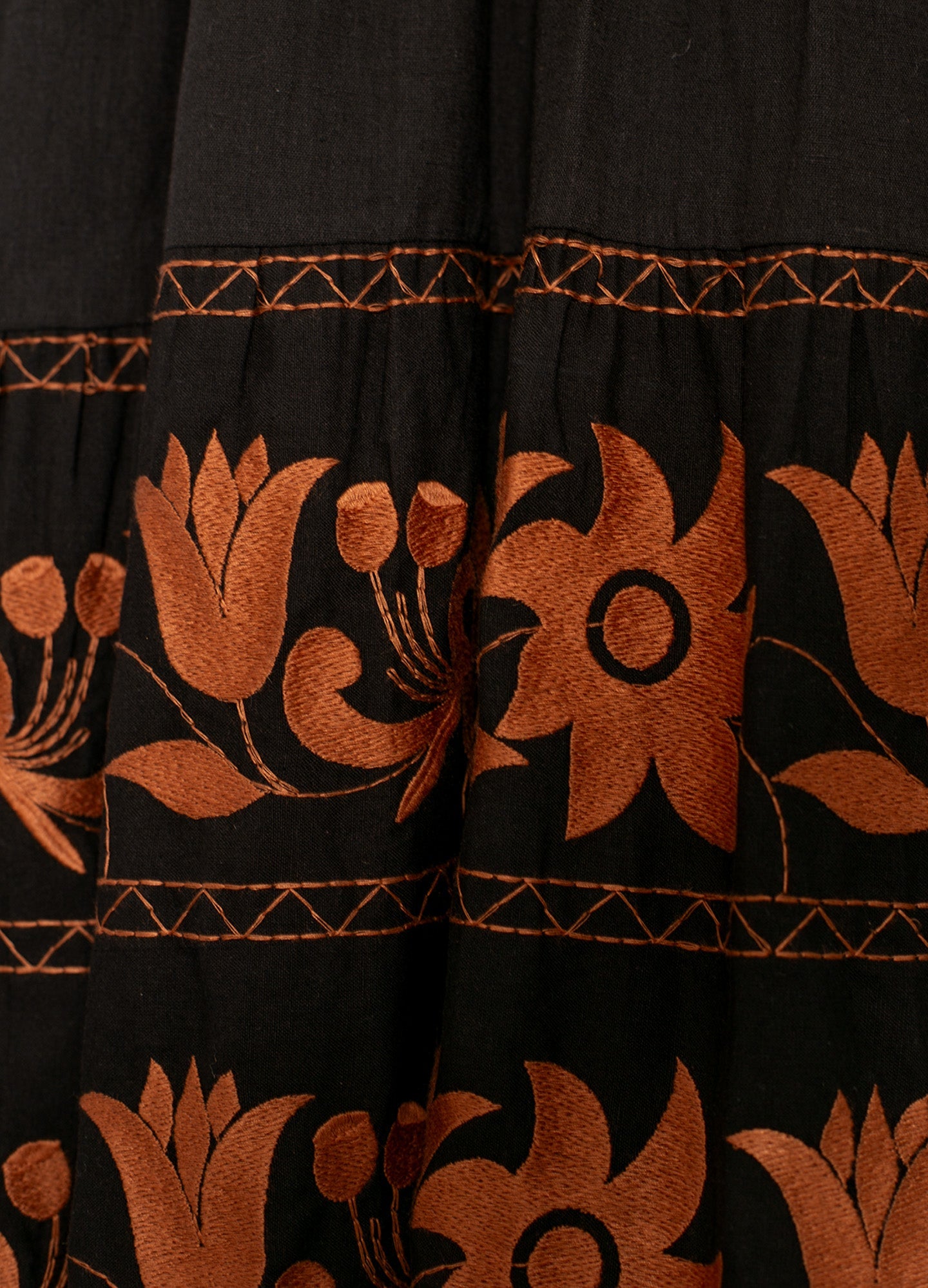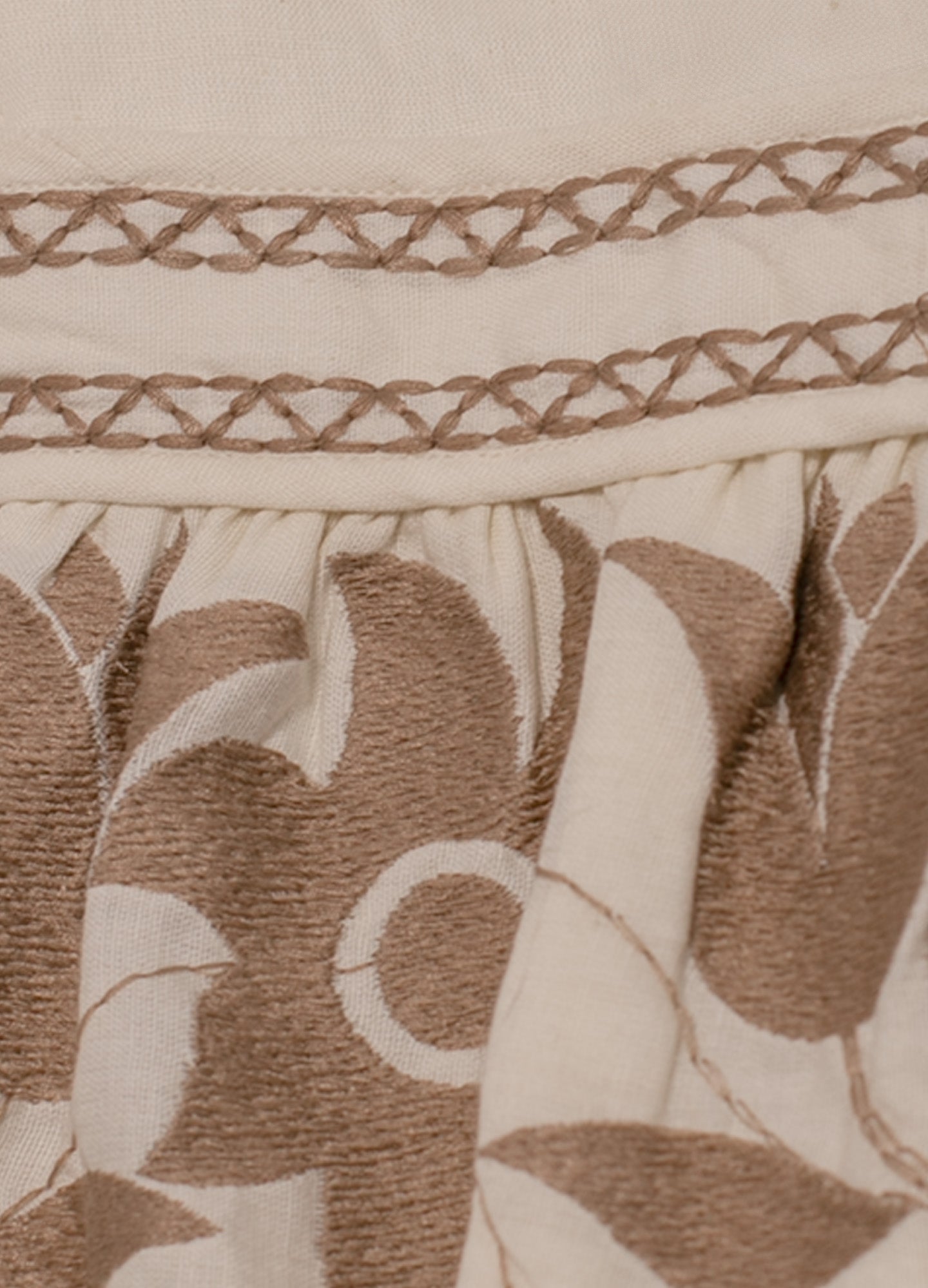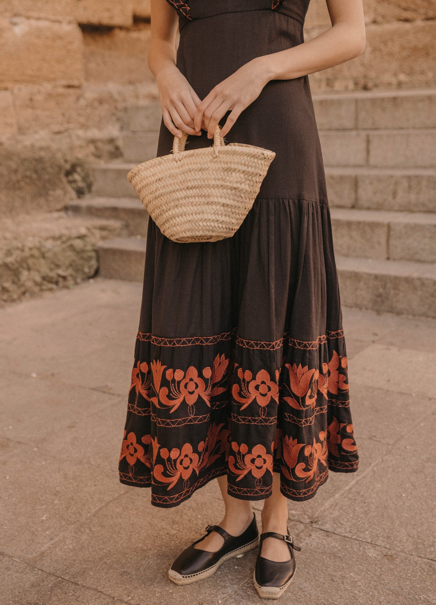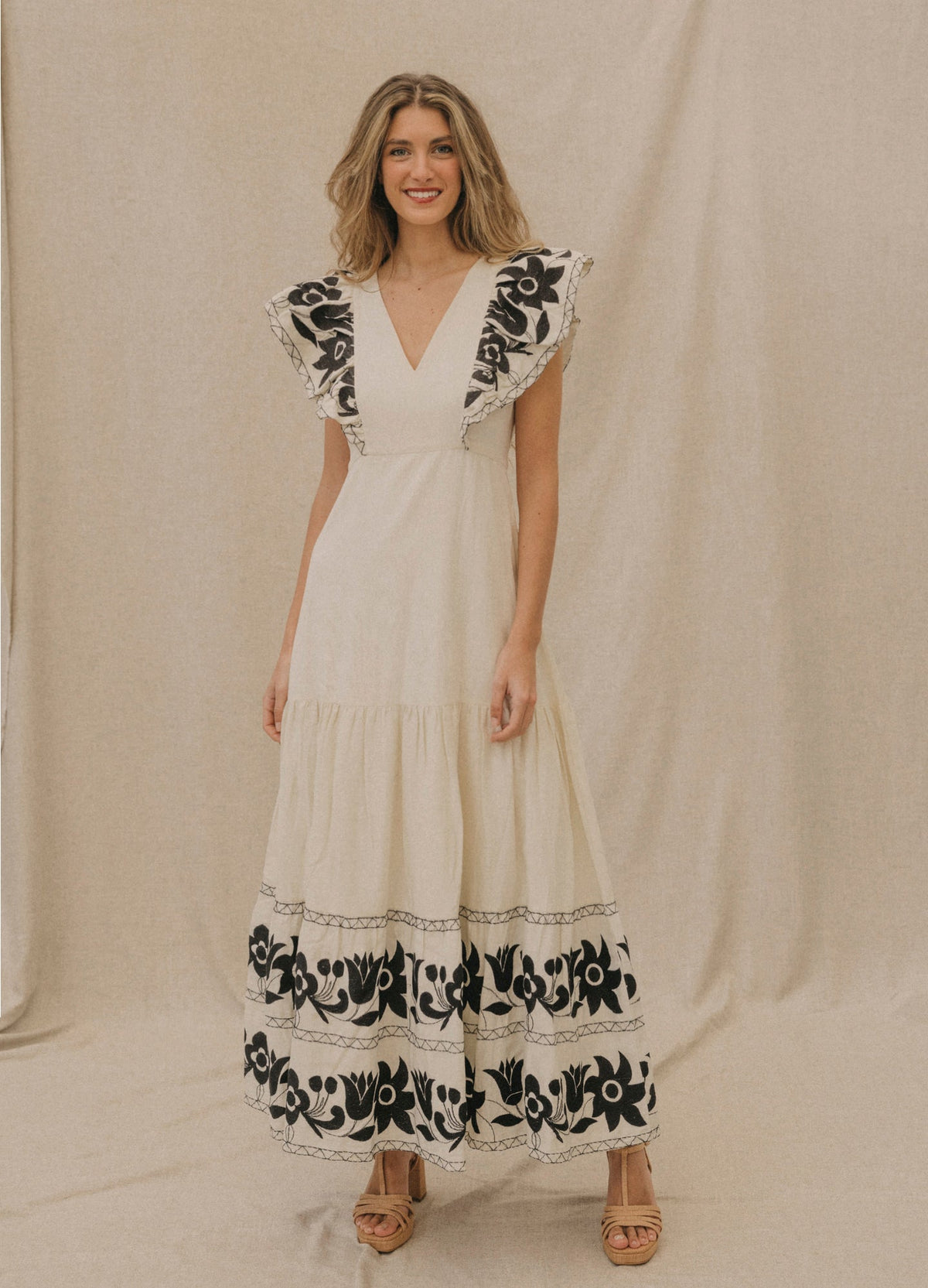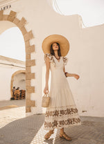 Vestido midi de escote en V y sin mangas, con volantes en los hombros adornados con un bordado floral. Presenta un corte debajo del pecho y una falda fruncida con vuelo, también decorada con una franja bordada. Cierre en la espalda con cremallera invisible.