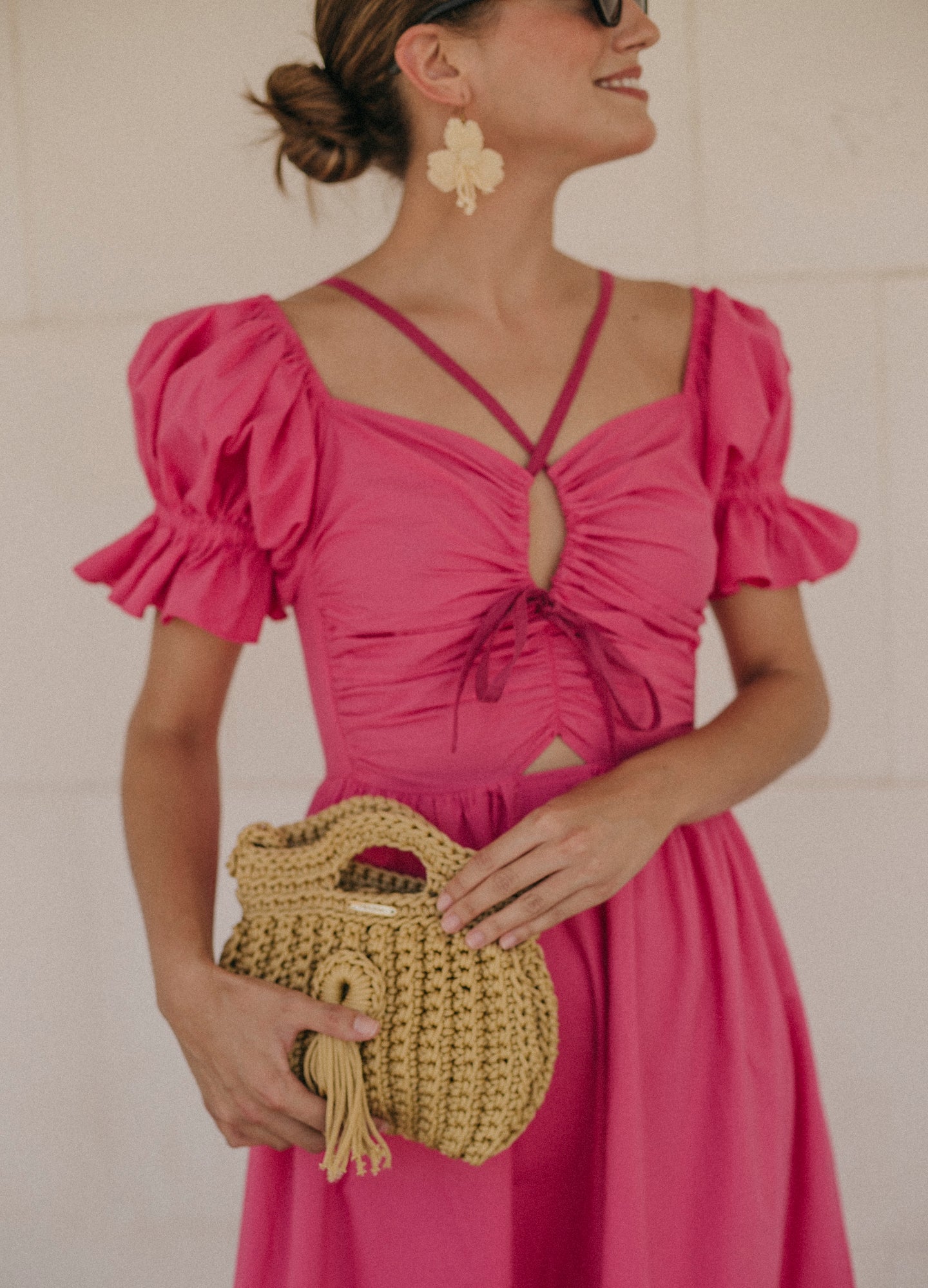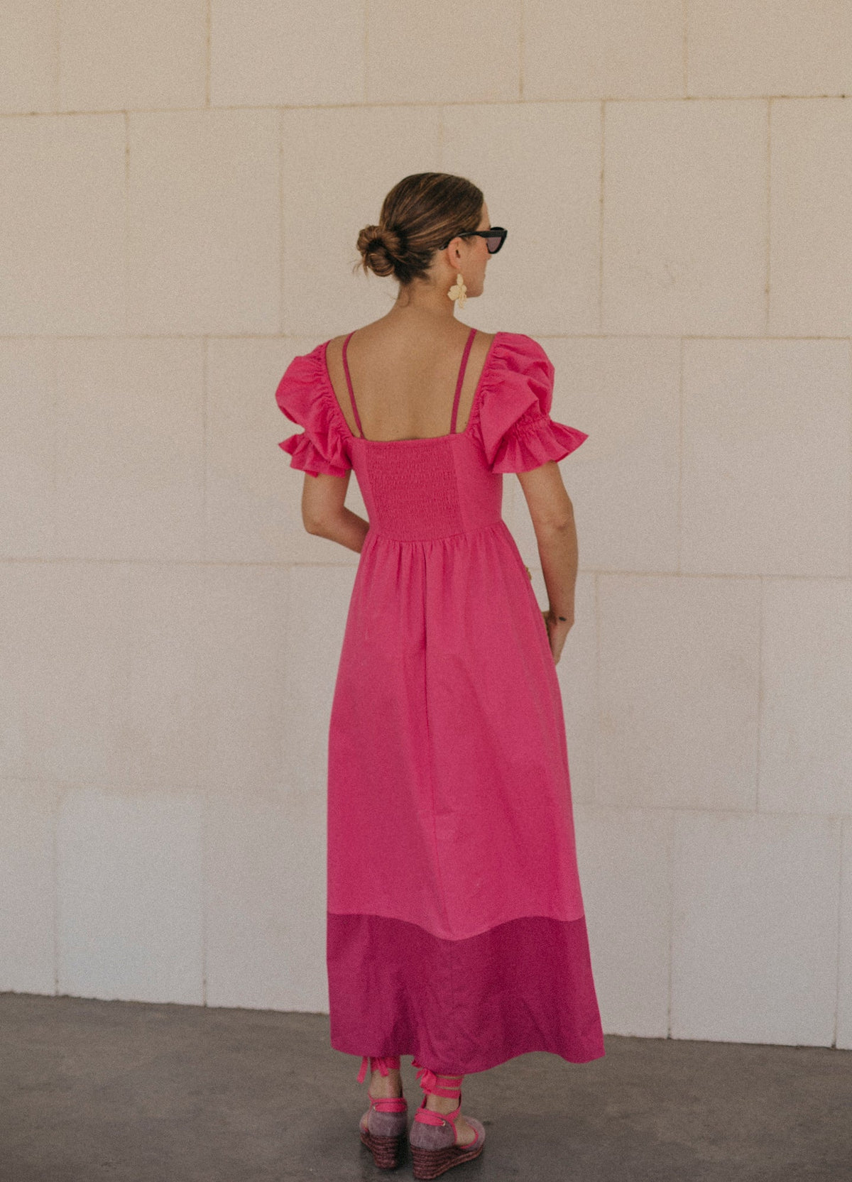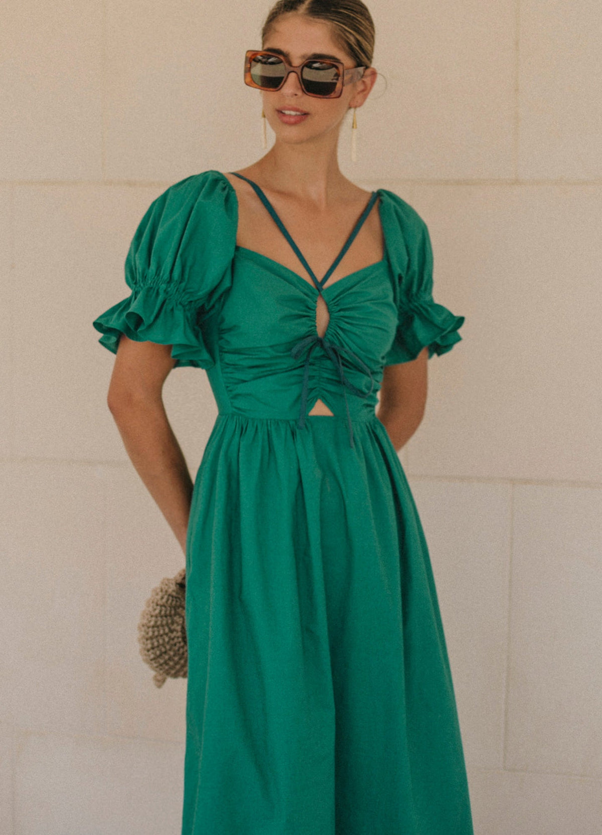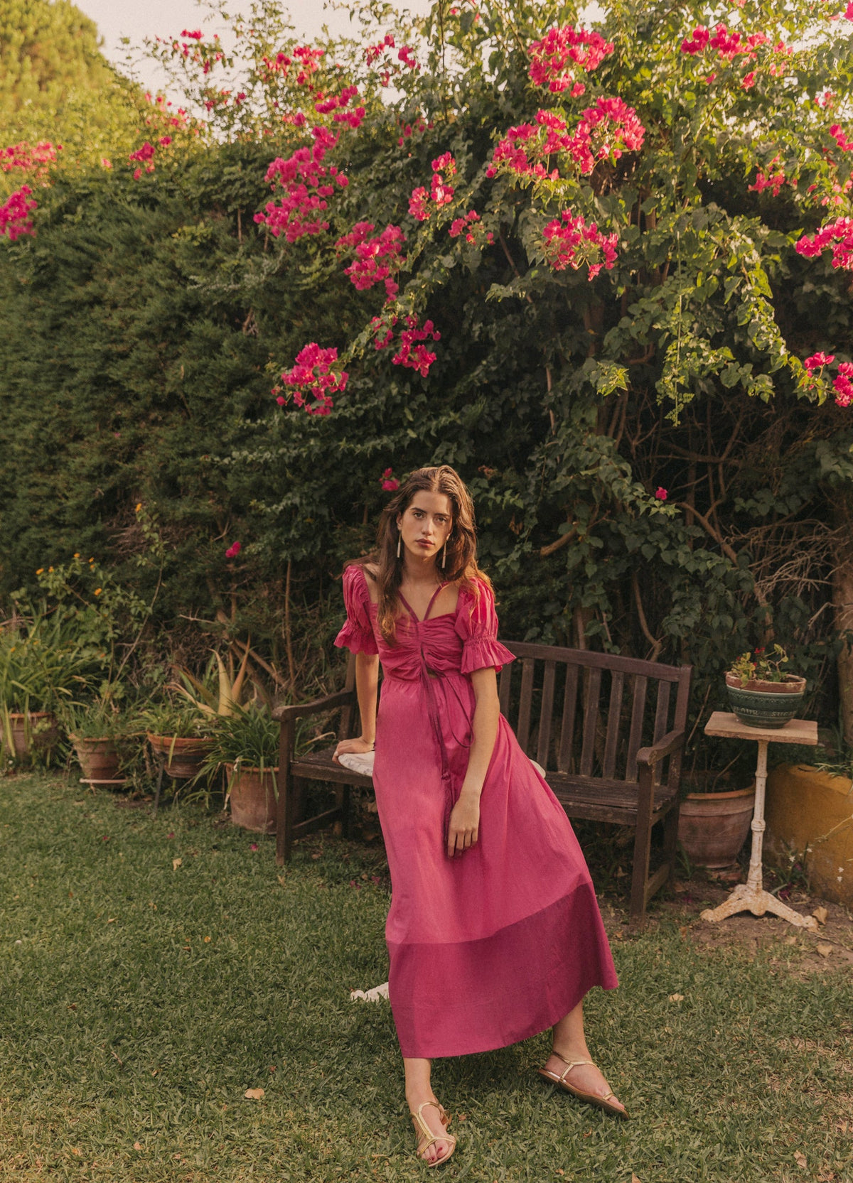 Vestido midi con corte a la cintura. Cuerpo con aberturas fruncidas ajustables mediante una cinta central del mismo tejido. Mangas farol con frunce y volante. Totalmente forrado para mayor comodidad.