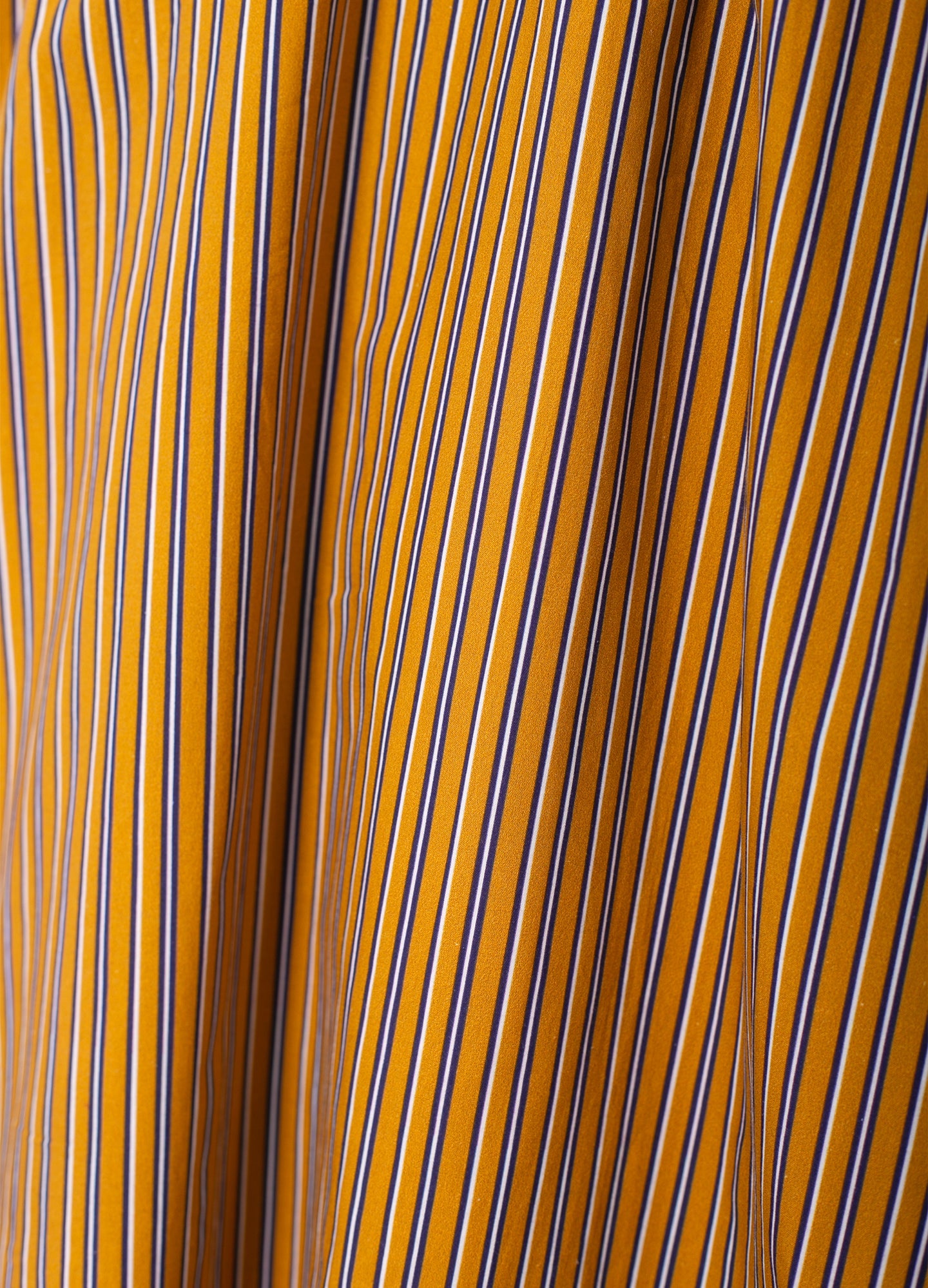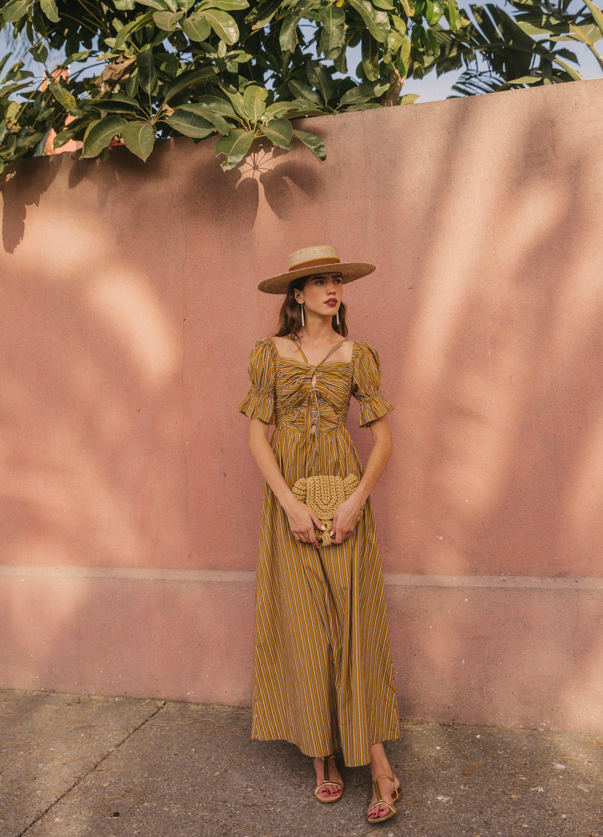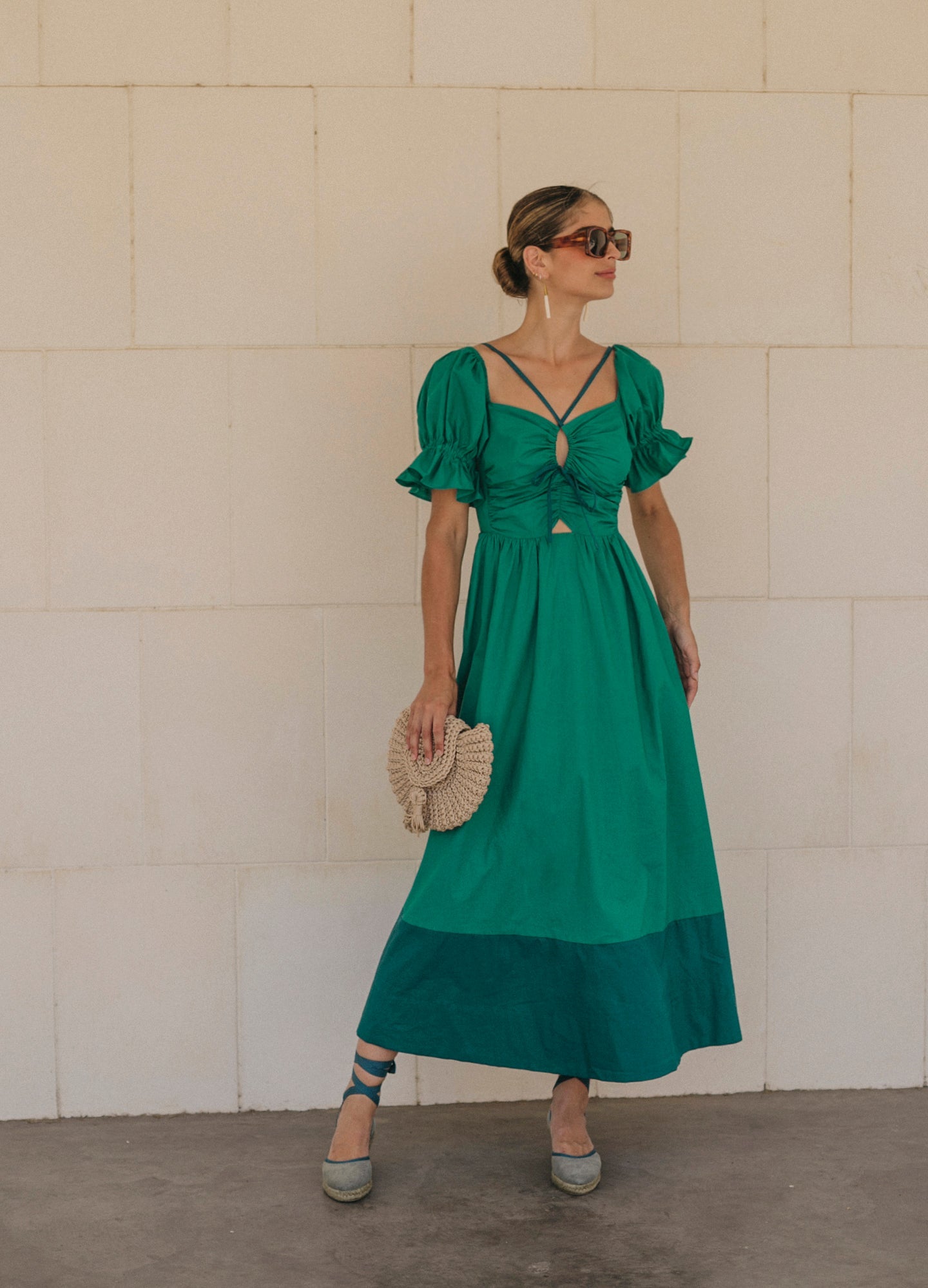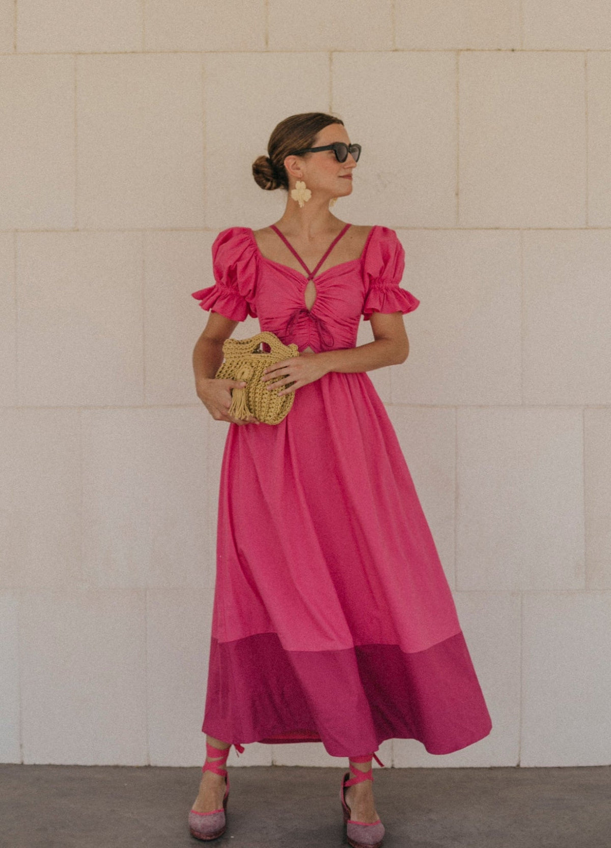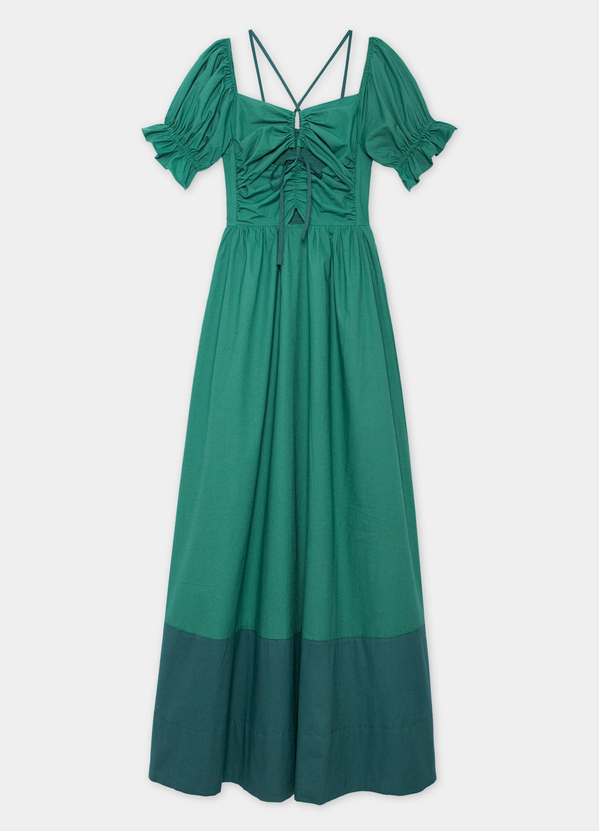 Vestido midi con corte a la cintura. Cuerpo con aberturas fruncidas ajustables mediante una cinta central del mismo tejido. Mangas farol con frunce y volante. Totalmente forrado para mayor comodidad.