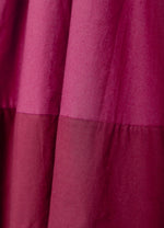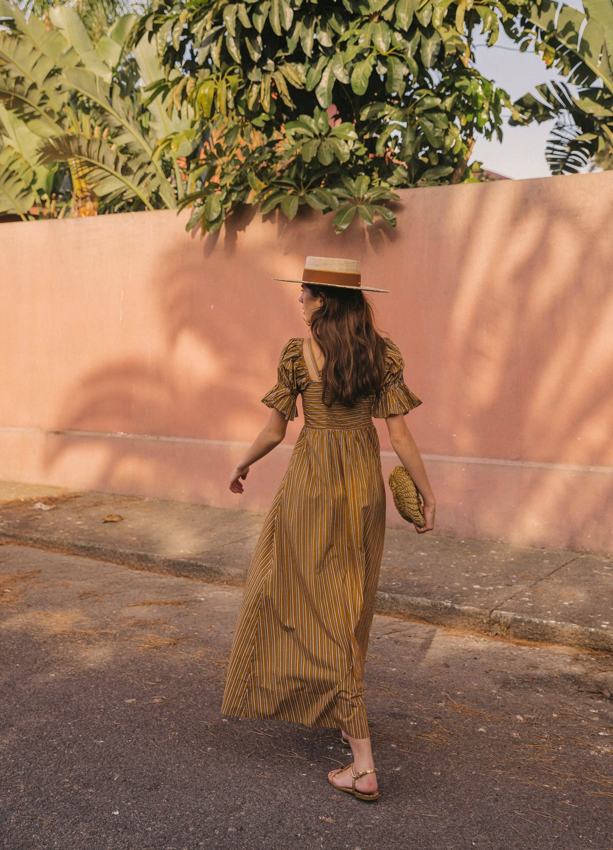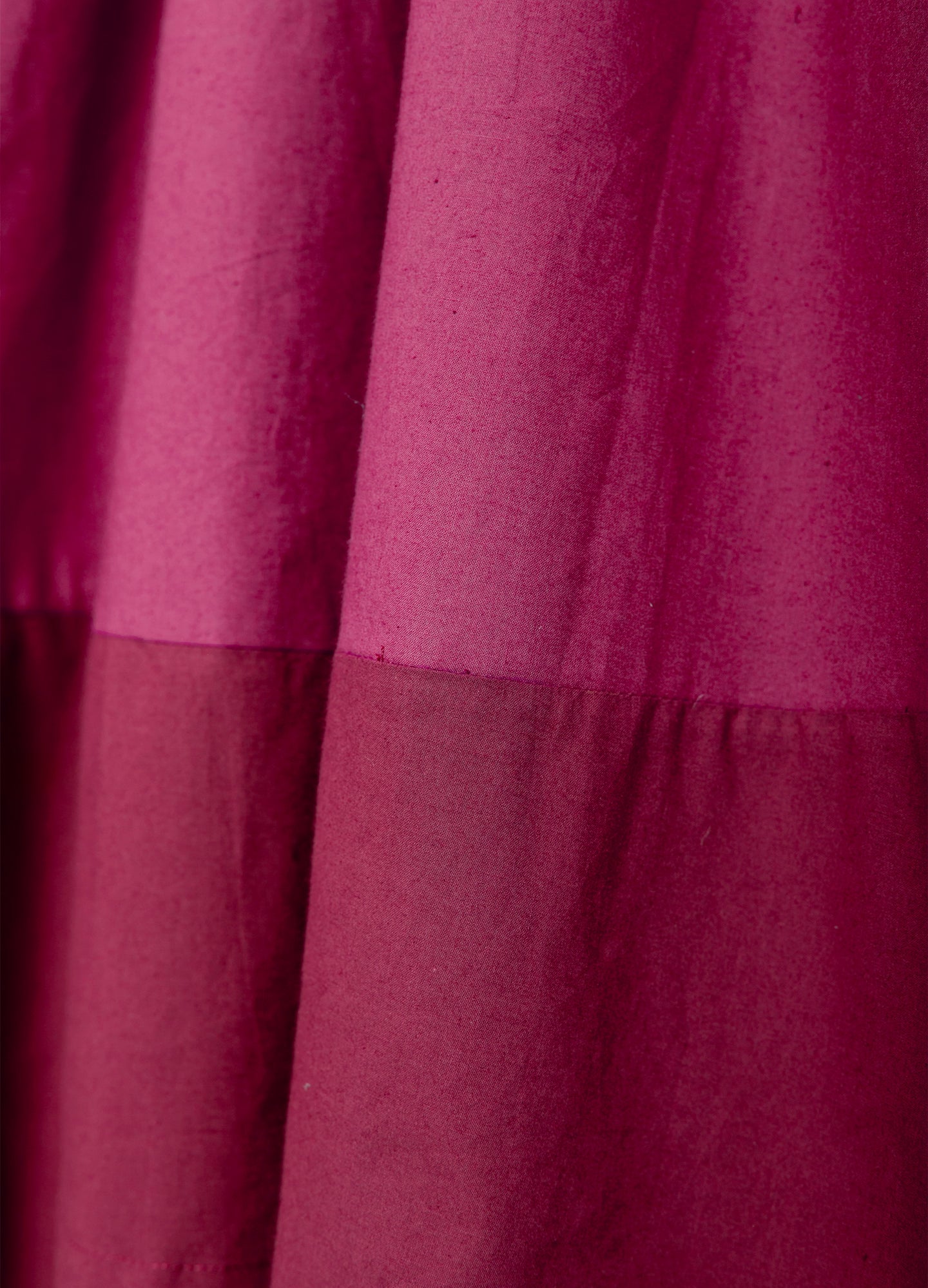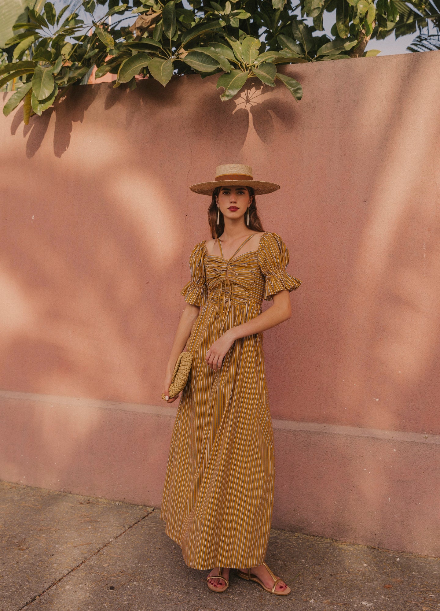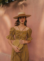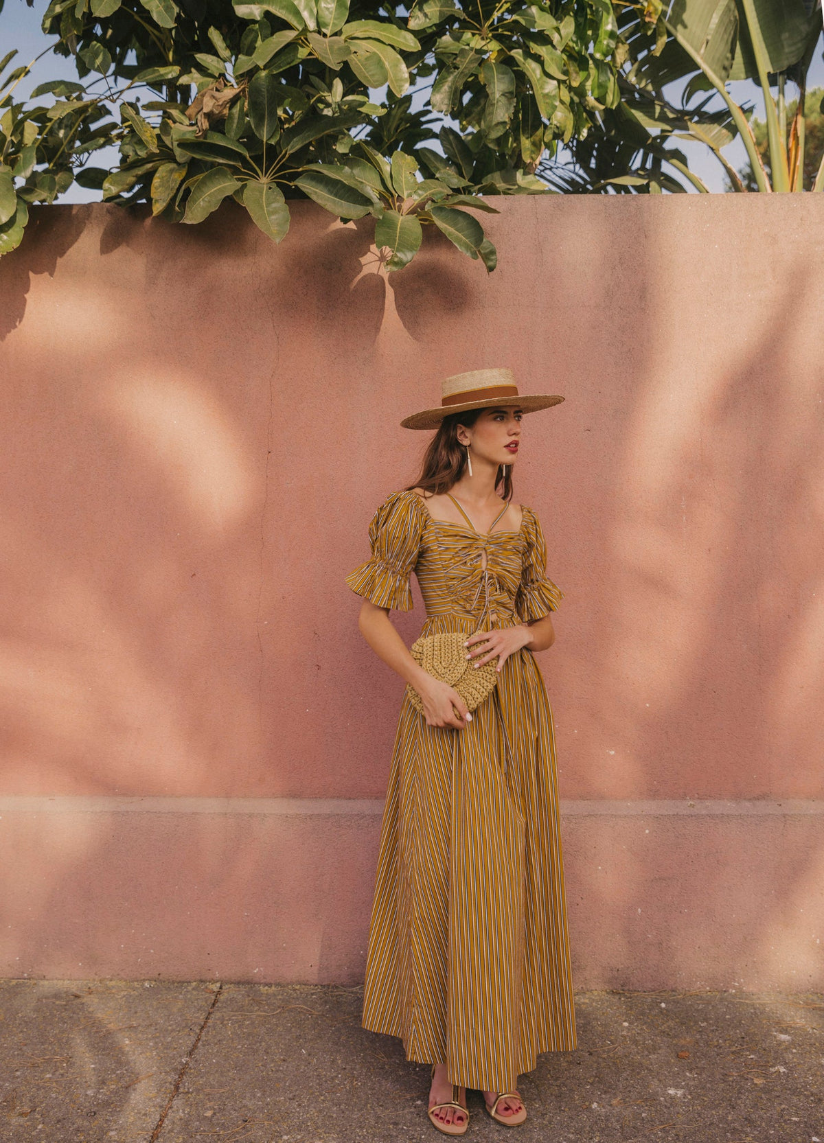 Vestido midi con corte a la cintura. Cuerpo con aberturas fruncidas ajustables mediante una cinta central del mismo tejido. Mangas farol con frunce y volante. Totalmente forrado para mayor comodidad.