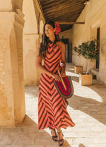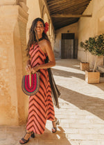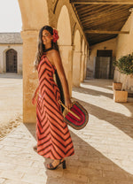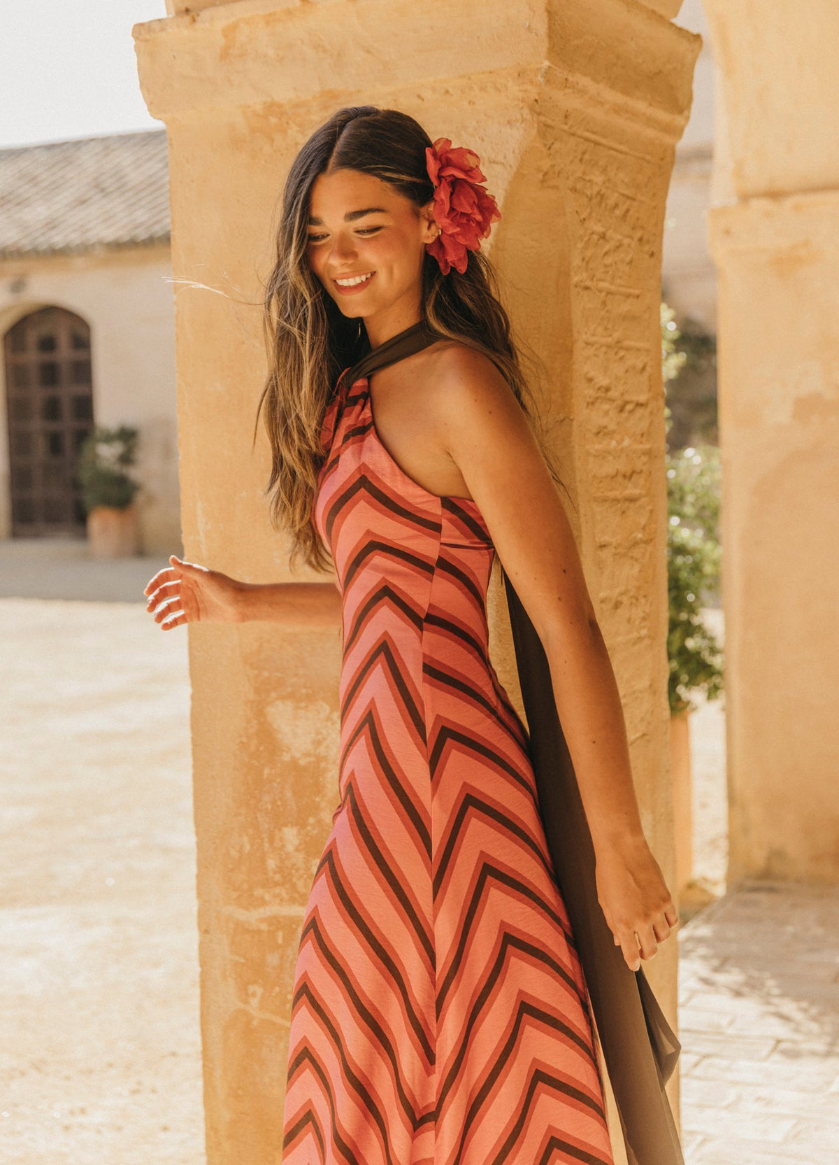 Vestido largo con estampado zig-zag, escote halter y abertura en lágrima. Falda evasé sin abertura. Espalda descubierta con tiras de gasa que se anudan al cuello. Completamente forrado.