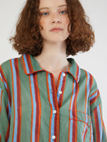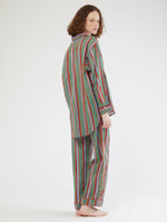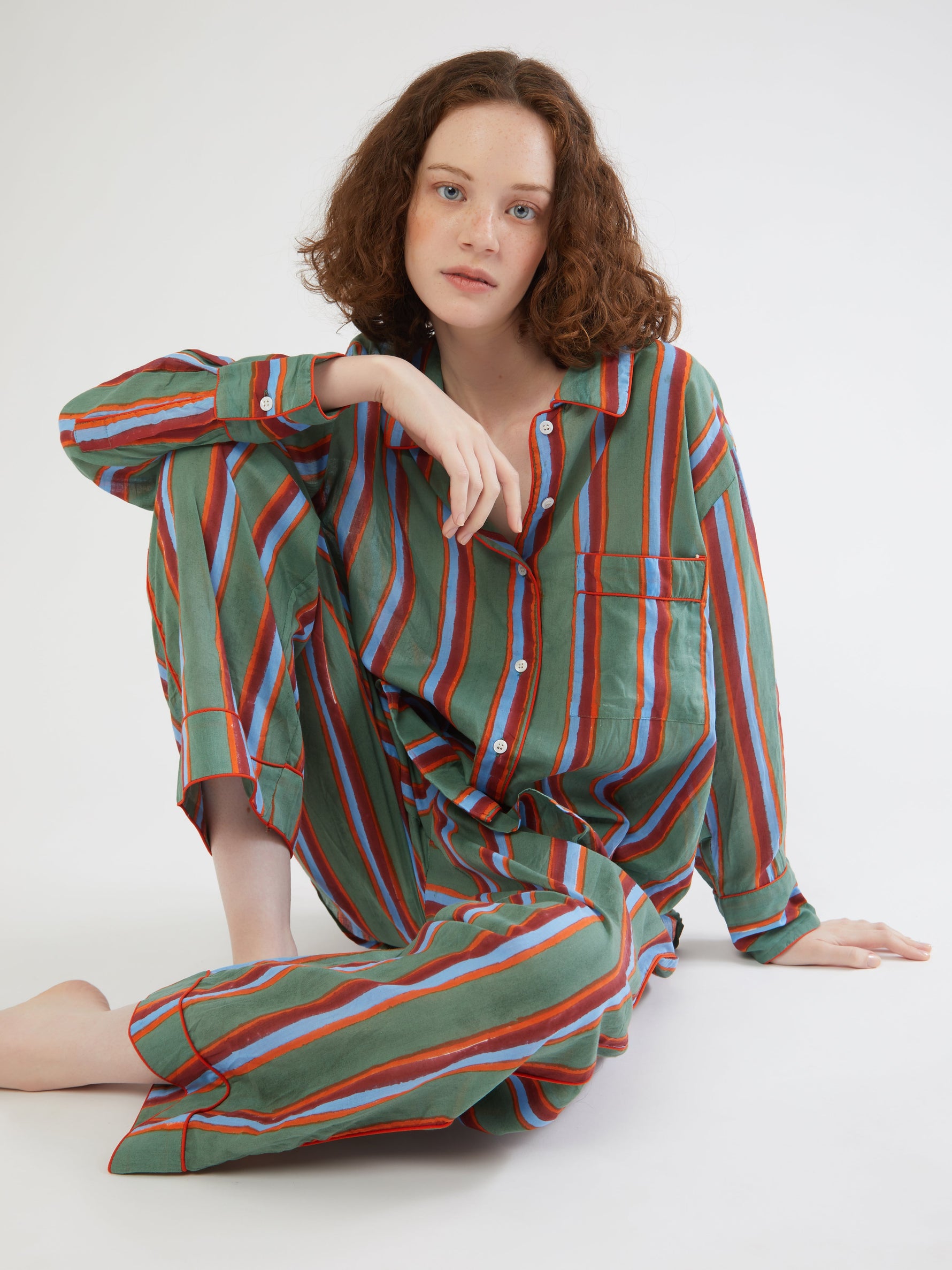 Set of cool and lightweight cotton pajama with colorful block print patterns handmade in India using ancient techniques. Its oversized fit gives a relaxed mood with wide leg and full-length button front. Detailed with colored piping along the seams, pockets at the sides and an elasticated waist with adjustable cord. It comes a with a lovely coordinated pouch to carry always in your holiday bag!