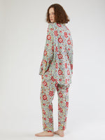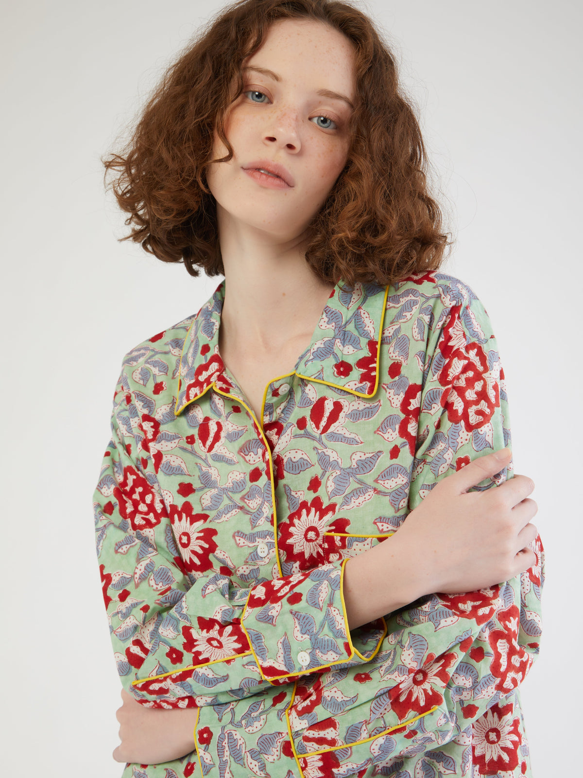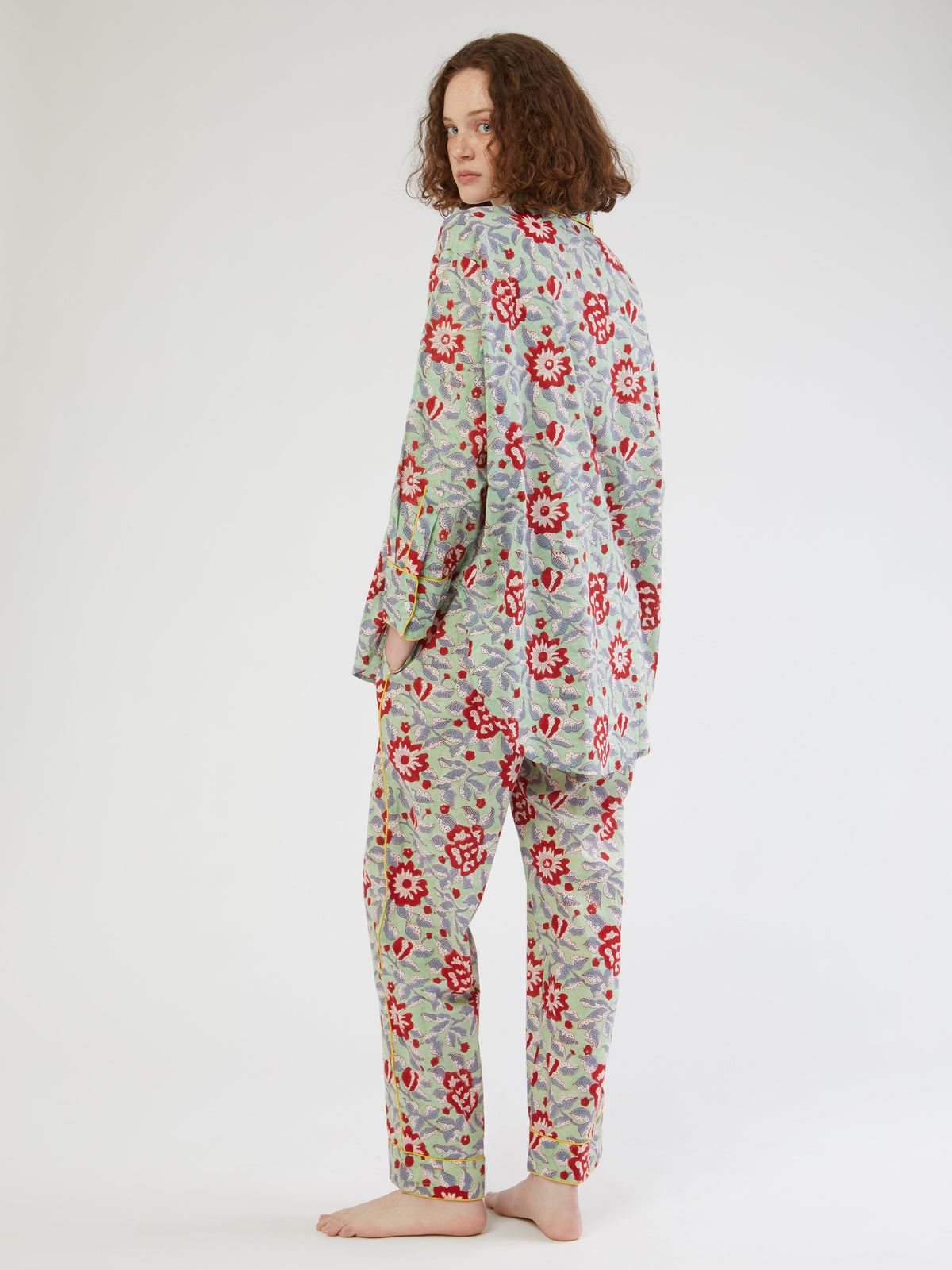 Set of cool and lightweight cotton pajama with colorful block print patterns handmade in India using ancient techniques. Its oversized fit gives a relaxed mood with wide leg and full-length button front. Detailed with colored piping along the seams, pockets at the sides and an elasticated waist with adjustable cord. It comes a with a lovely coordinated pouch to carry always in your holiday bag!