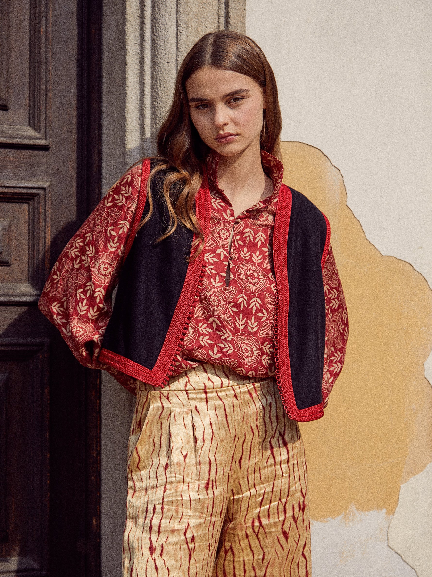 The Indian Silk Blouse is entirely handmade by artisans in India using 100% silk fabric which has been printed by hand using the ancient technique of block printing. This model is simple yet sophisticated, with puff sleeves, a revisited mandarin collar and details like the handmade buttons and button holes, gives us unique oriental vibes. Pair yours together with the Indian Silk Trousers and mix and match your favorite prints.