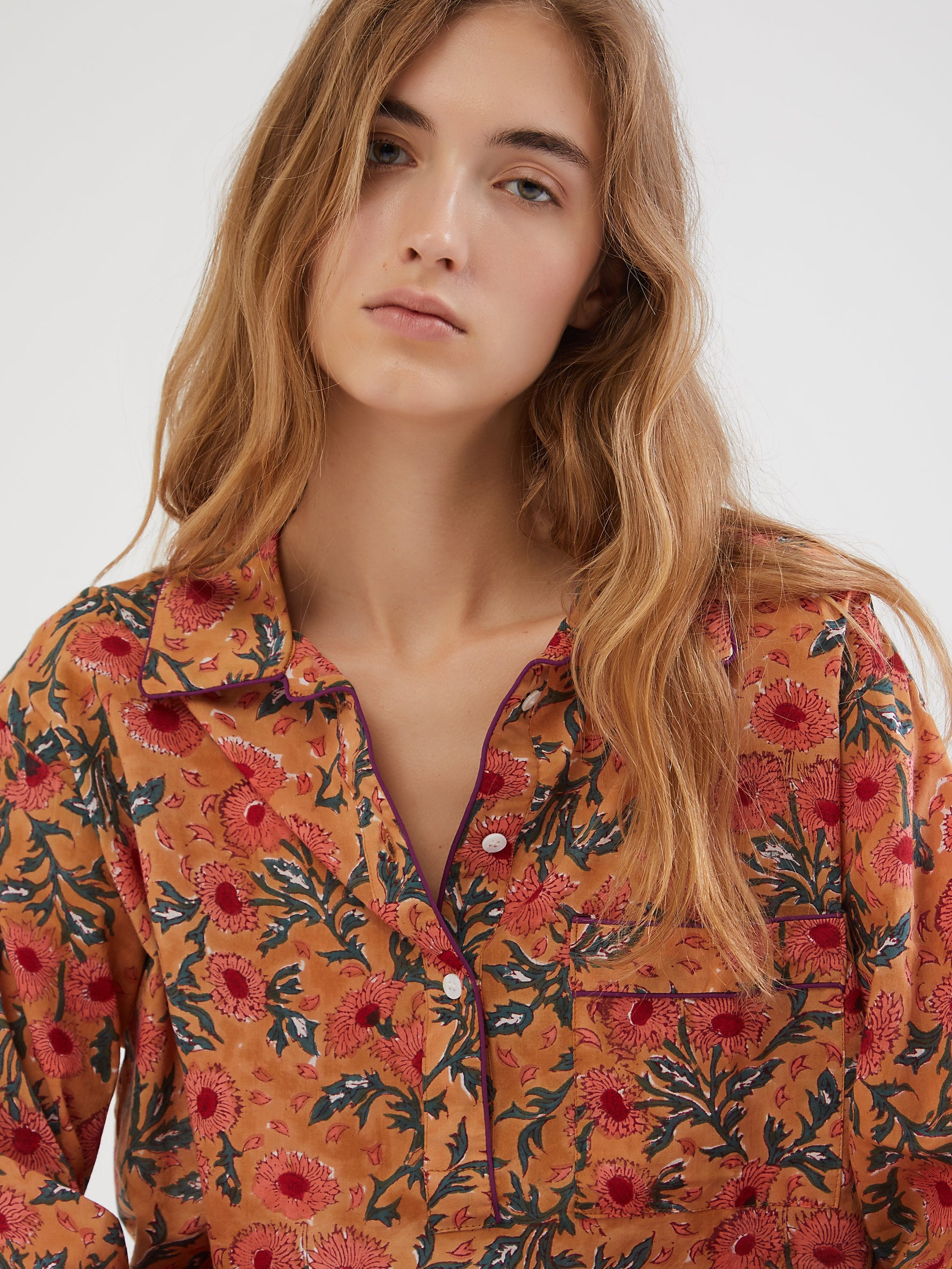 Set of cool and lightweight cotton pajama with colorful block print patterns handmade in India using ancient techniques. Its oversized fit gives a relaxed mood with short pants and half-length button front. Detailed with colored piping along the seams, pockets at the sides and an elasticated waist with adjustable cord. It comes a with a lovely coordinated pouch to carry always in your holiday bag!