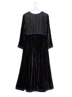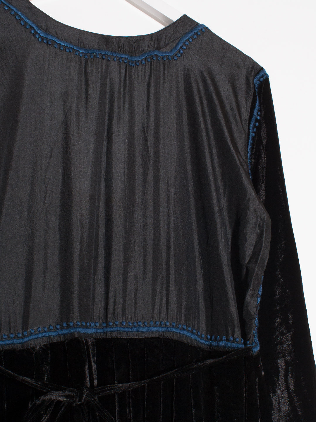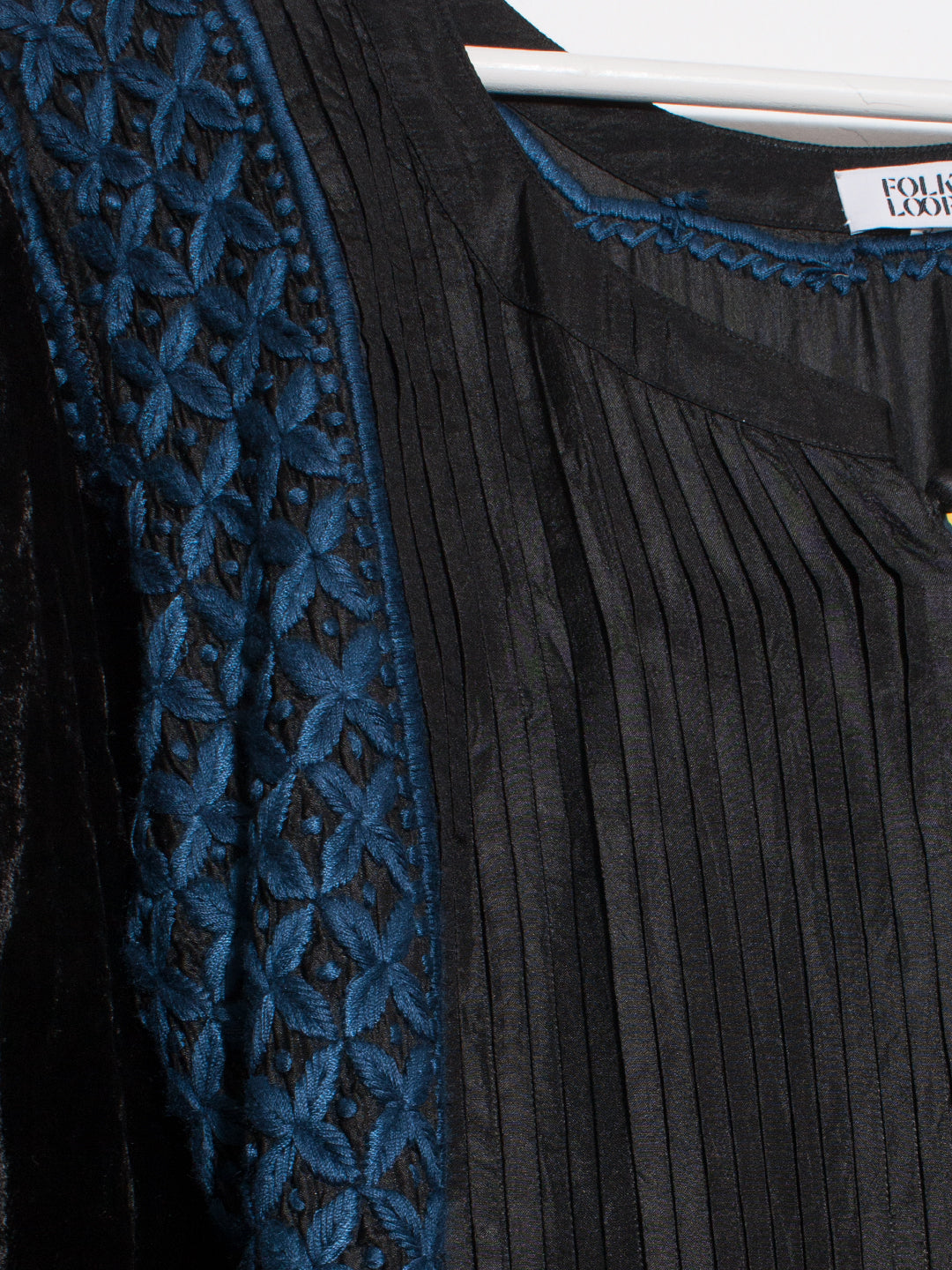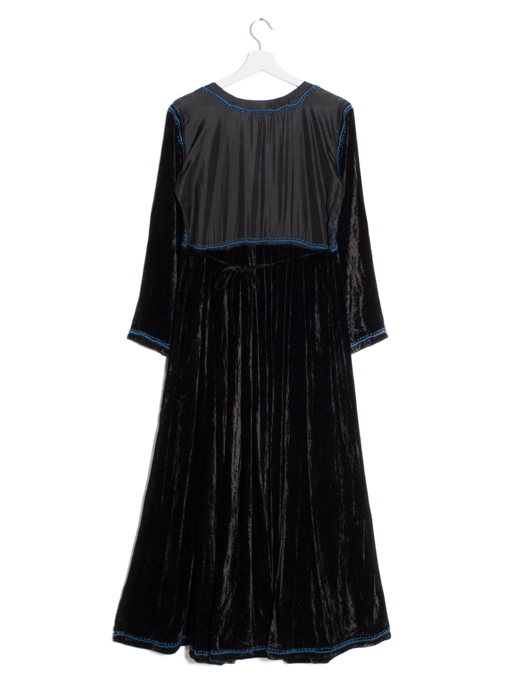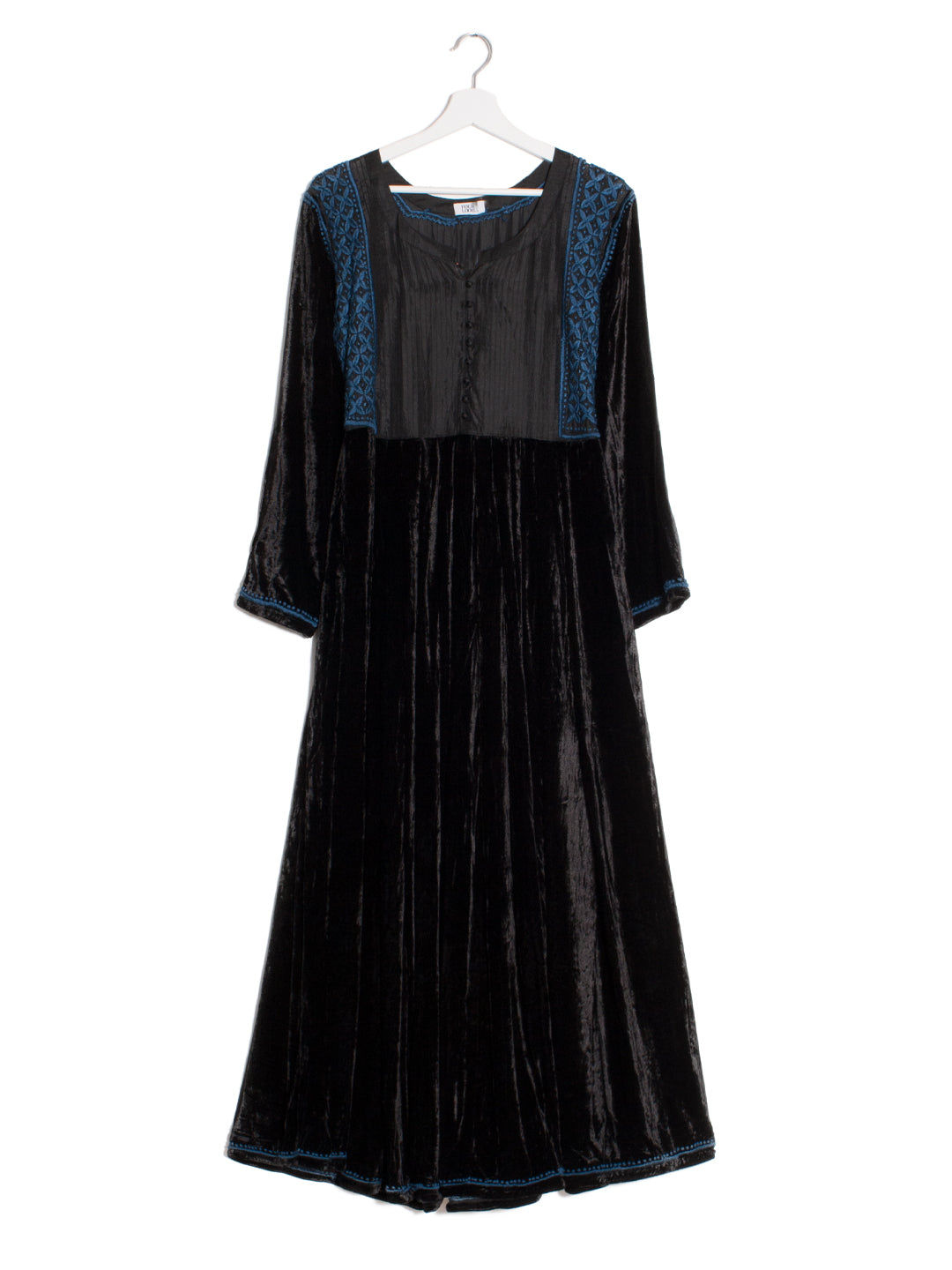 The Indian silk velvet embroidered dresses are one-of-a-kind pieces 100% hand embroidered with the chikankari technique. It is a delicate and traditional embroidery made with cotton threads, representing floral patterns in their designs. With its elegant twist, this dress is perfect for special occasions. Each of these dresses take more than a month to be fully embroidered.