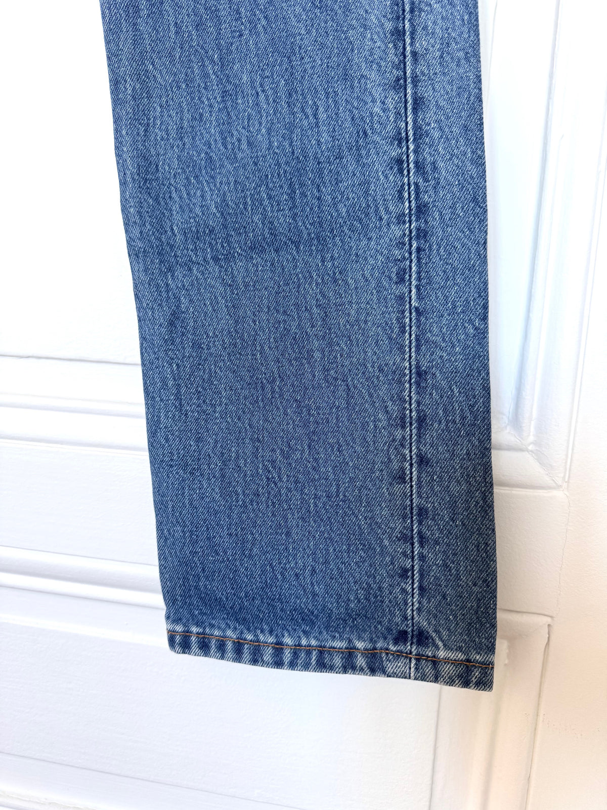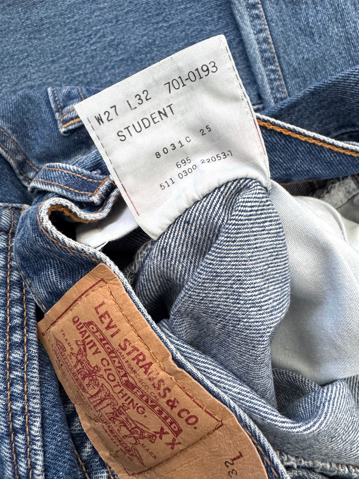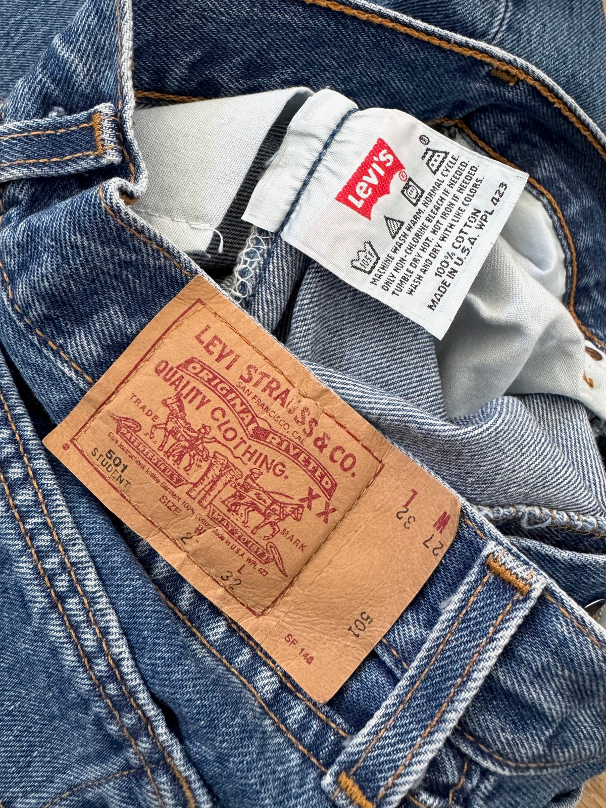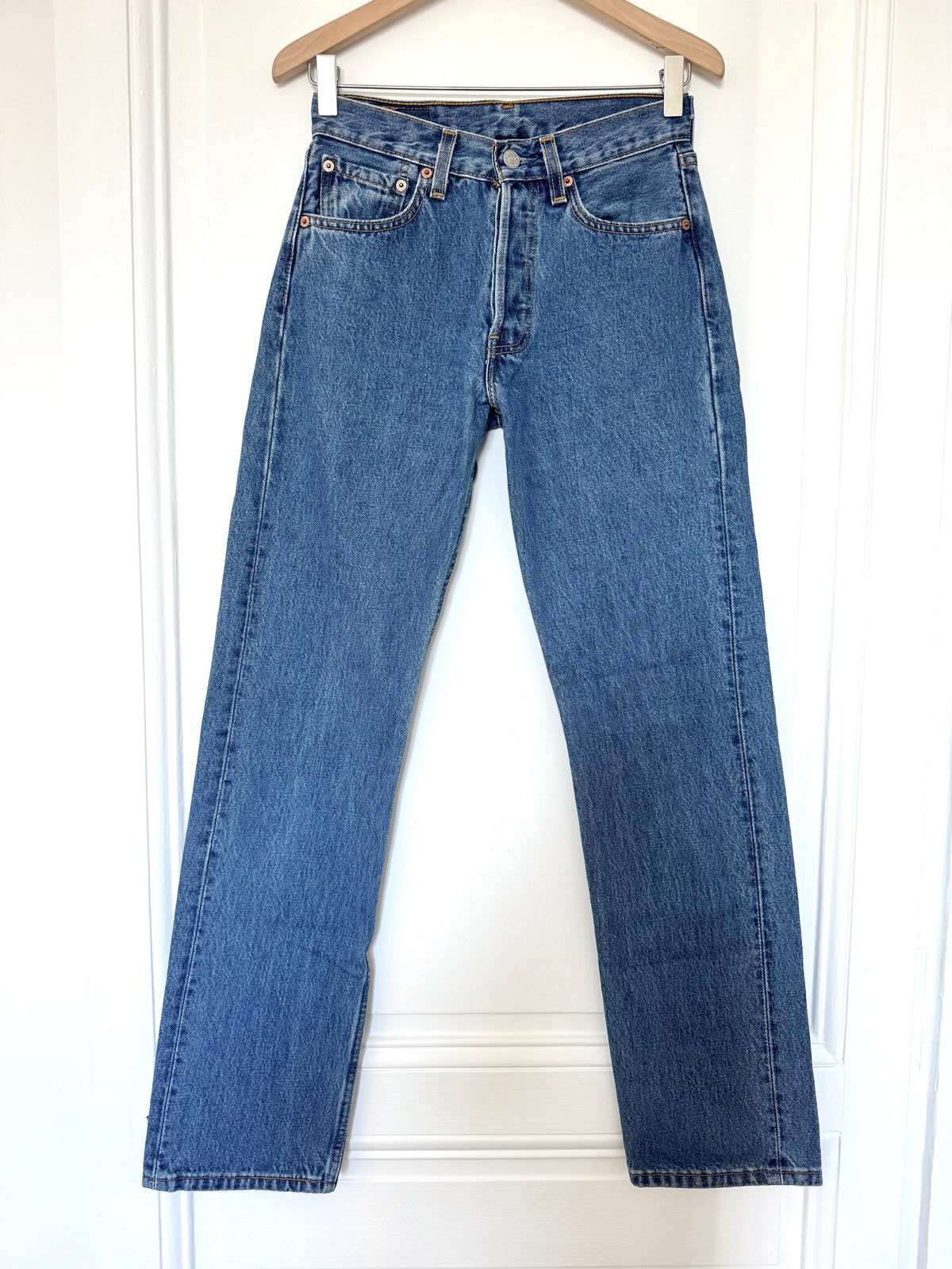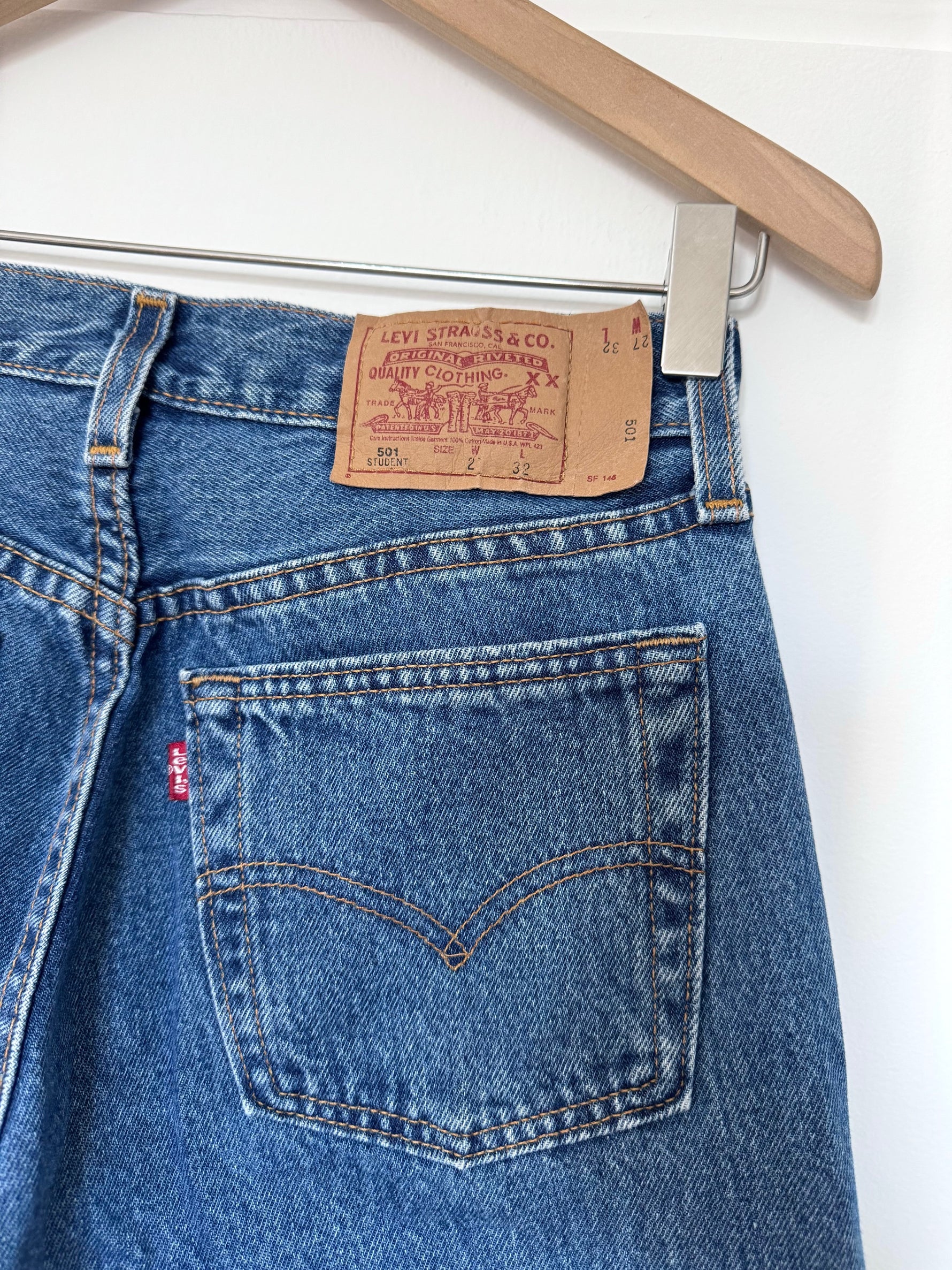 Made in USA. 100% coton, toile épaisse. Coupe Student : plus étroite au niveau des hanches par rapport aux 501 regular, modèle plus rare. Ourlets d’origine.