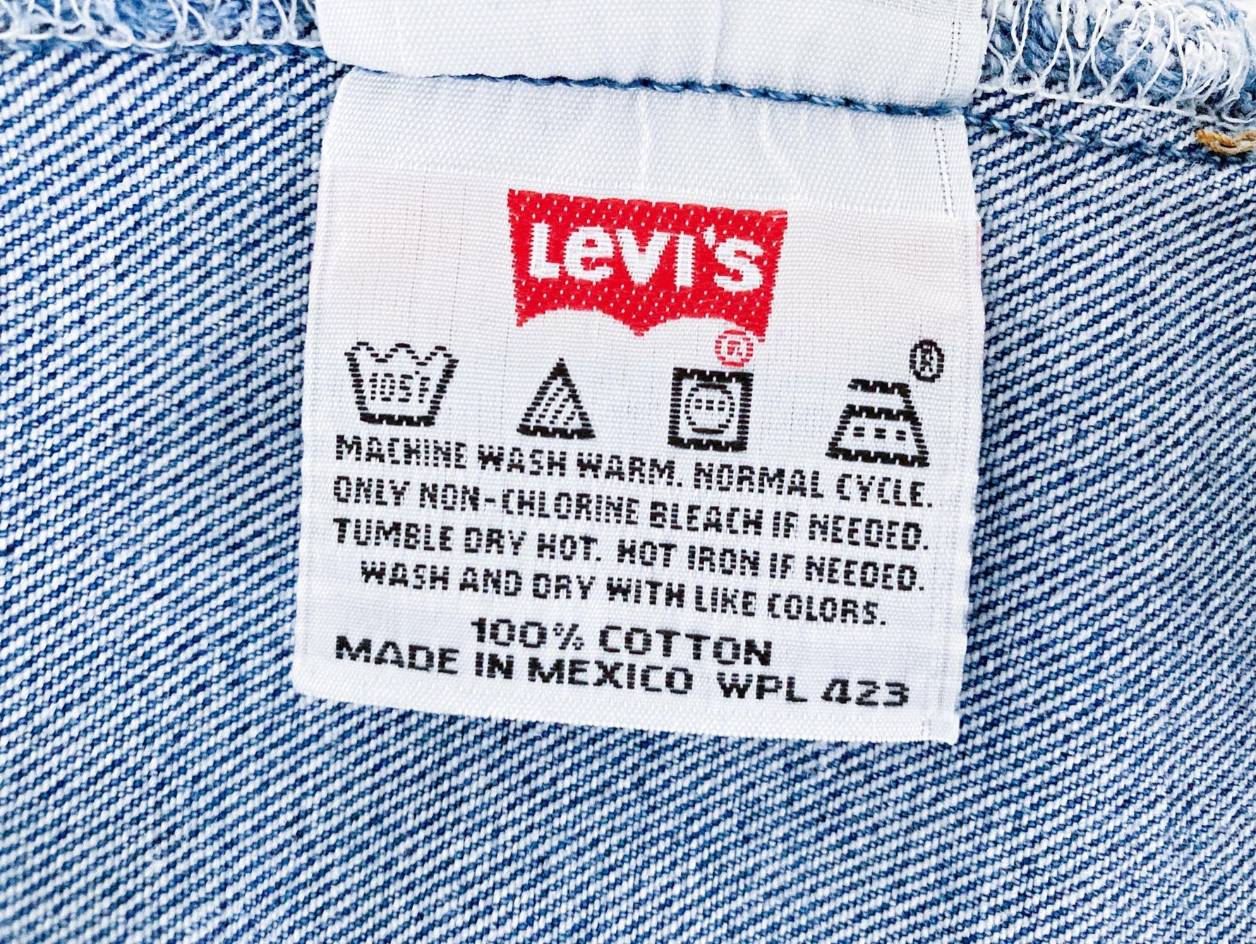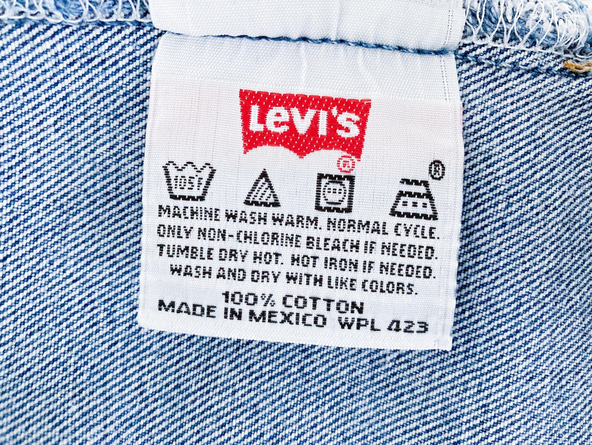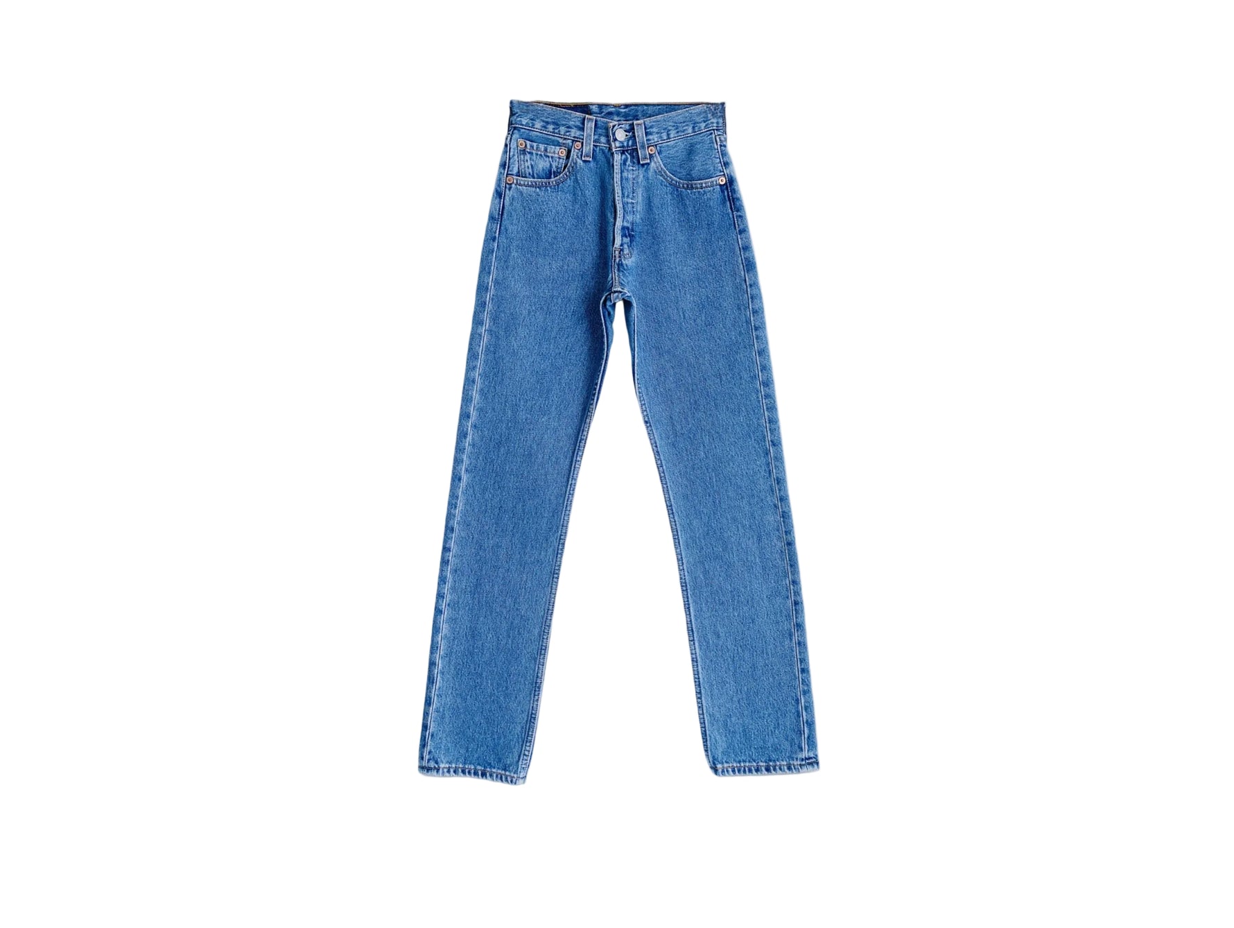 90s, coupe femme, bleu moyen, made in Mexico. Taille : 29 cm, Hauteur taille : 26 cm, Hanches : 45,5 cm, Cuisse : 24 cm, Longueur totale : 98 cm, Ourlets : 17 cm, Longueur entrejambe : 76 cm