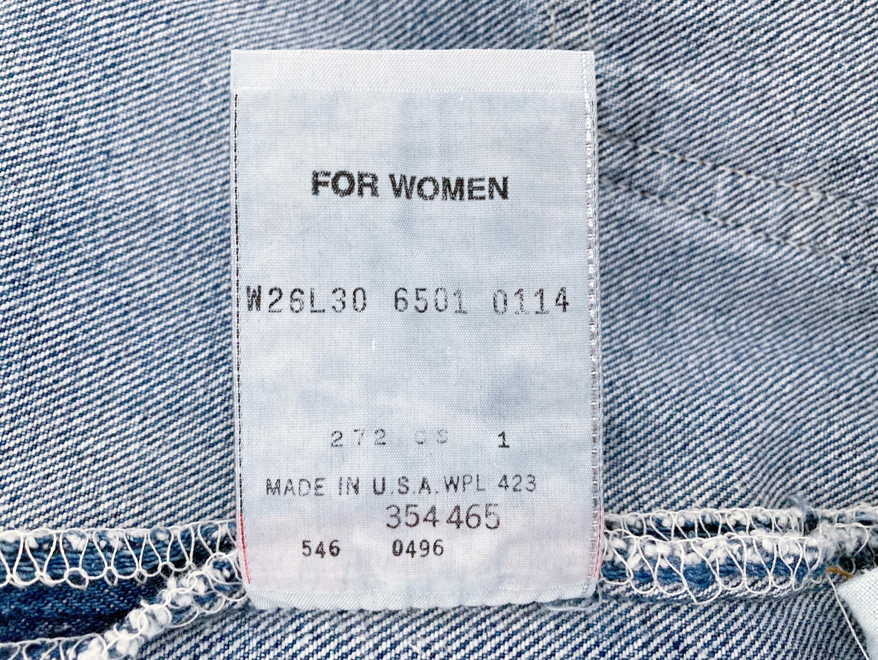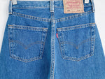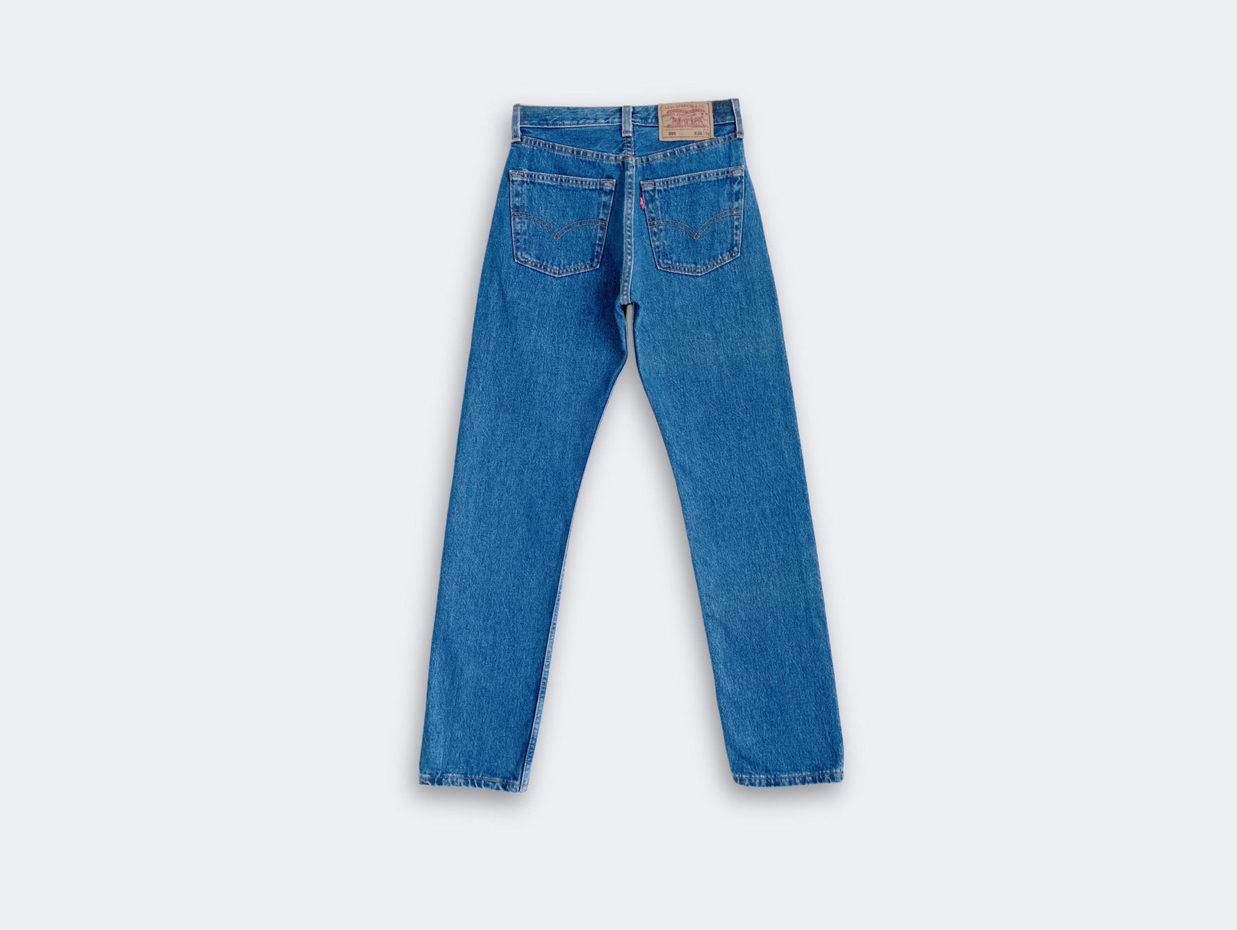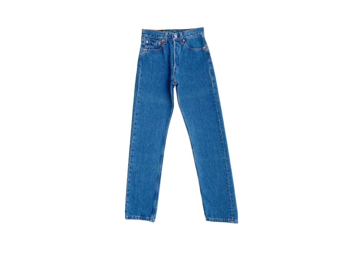 90s, coupe femme, bleu moyen, made in USA. Taille : 33 cm, Hauteur taille : 27,5 cm, Hanches : 49 cm, Cuisse : 26 cm, Longueur totale : 101,5 cm, Ourlets : 17 cm, Longueur entrejambe : 77,5 cm