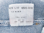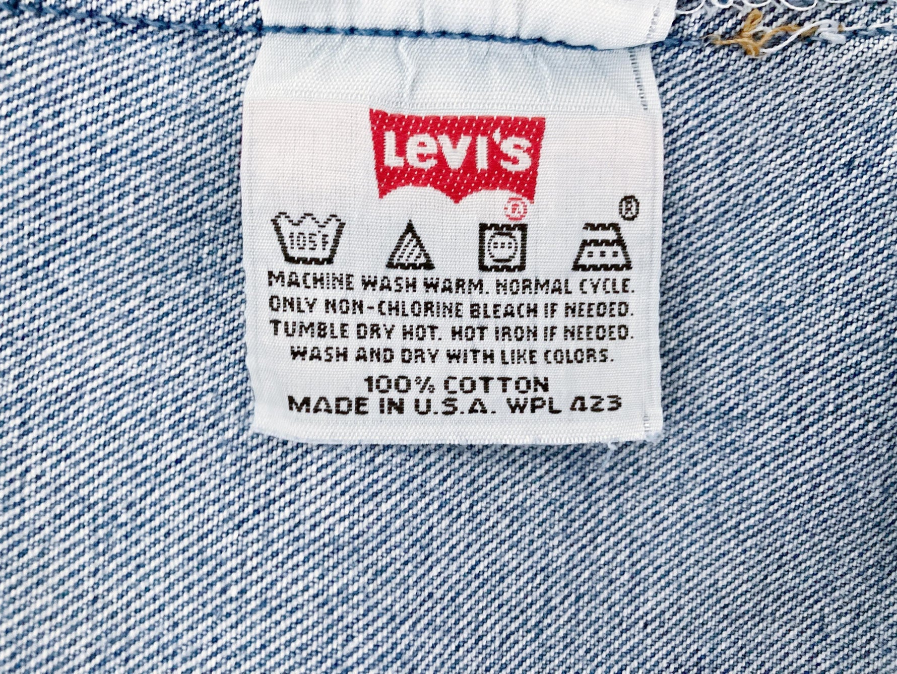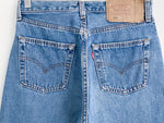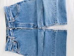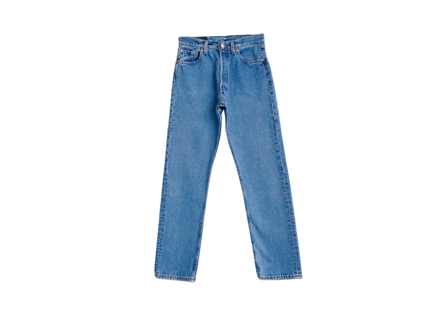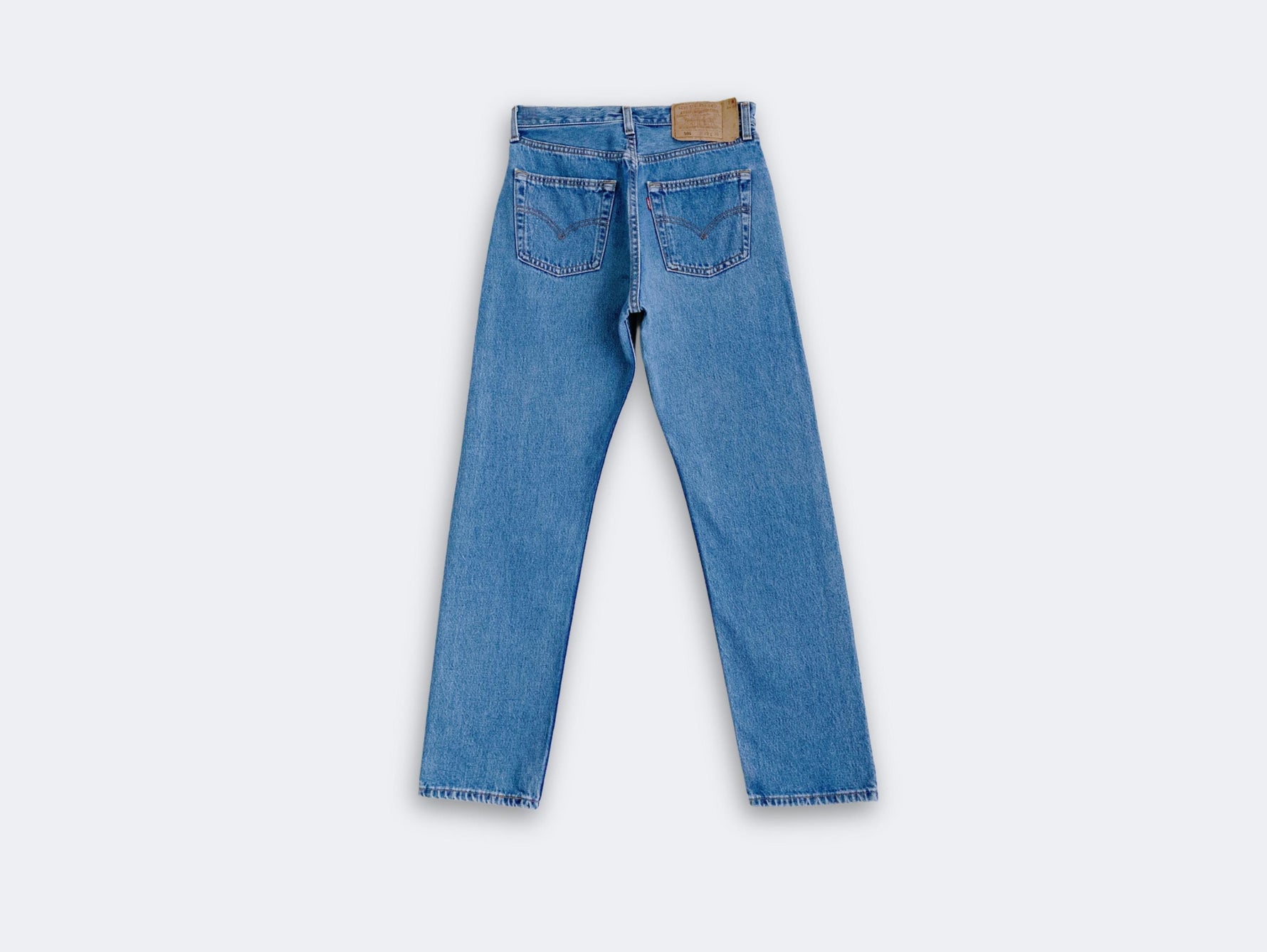 90s, bleu moyen, coupe mixte, made in USA. Taille : 36 cm, Hauteur taille : 29 cm, Hanches : 53,5 cm, Cuisse : 28 cm, Longueur totale : 101,5 cm, Ourlets : 18,5 cm, Longueur entrejambe : 76 cm