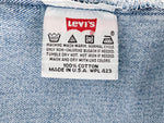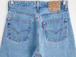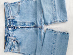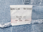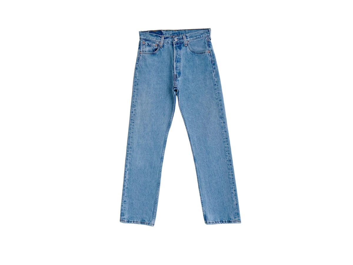 90s, bleu clair, coupe originale, made in USA. Taille : 37 cm, Hauteur taille : 28 cm, Hanches : 52 cm, Cuisse : 26,5 cm, Longueur totale : 100,5 cm, Ourlets : 19 cm, Longueur entrejambe : 76 cm