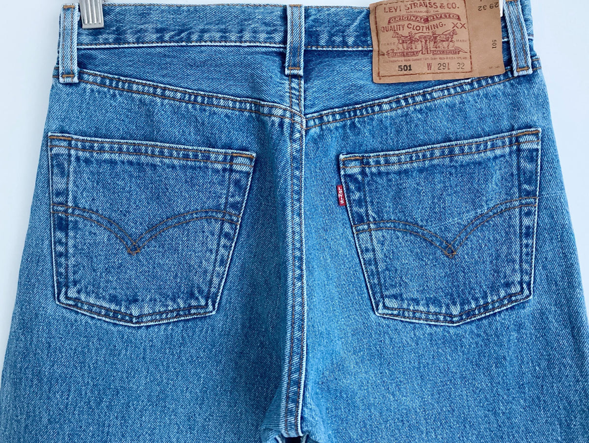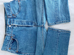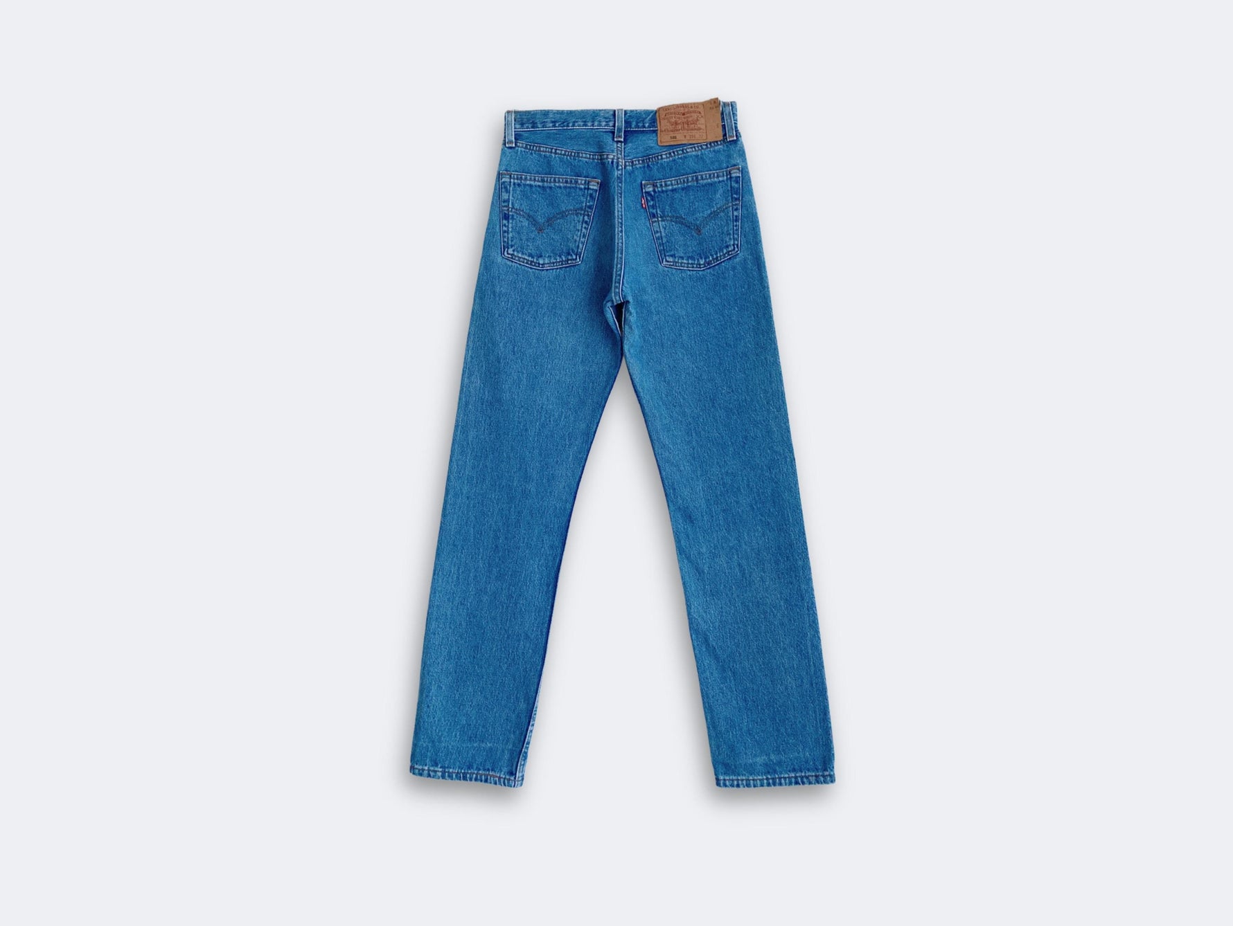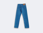 90s, bleu moyen, coupe mixte, made in USA. Taille : 37 cm, Hauteur taille : 28,5 cm, Hanches : 52 cm, Cuisse : 27,5 cm, Longueur totale : 105,5 cm, Ourlets : 19 cm, Longueur entrejambe : 81,5 cm