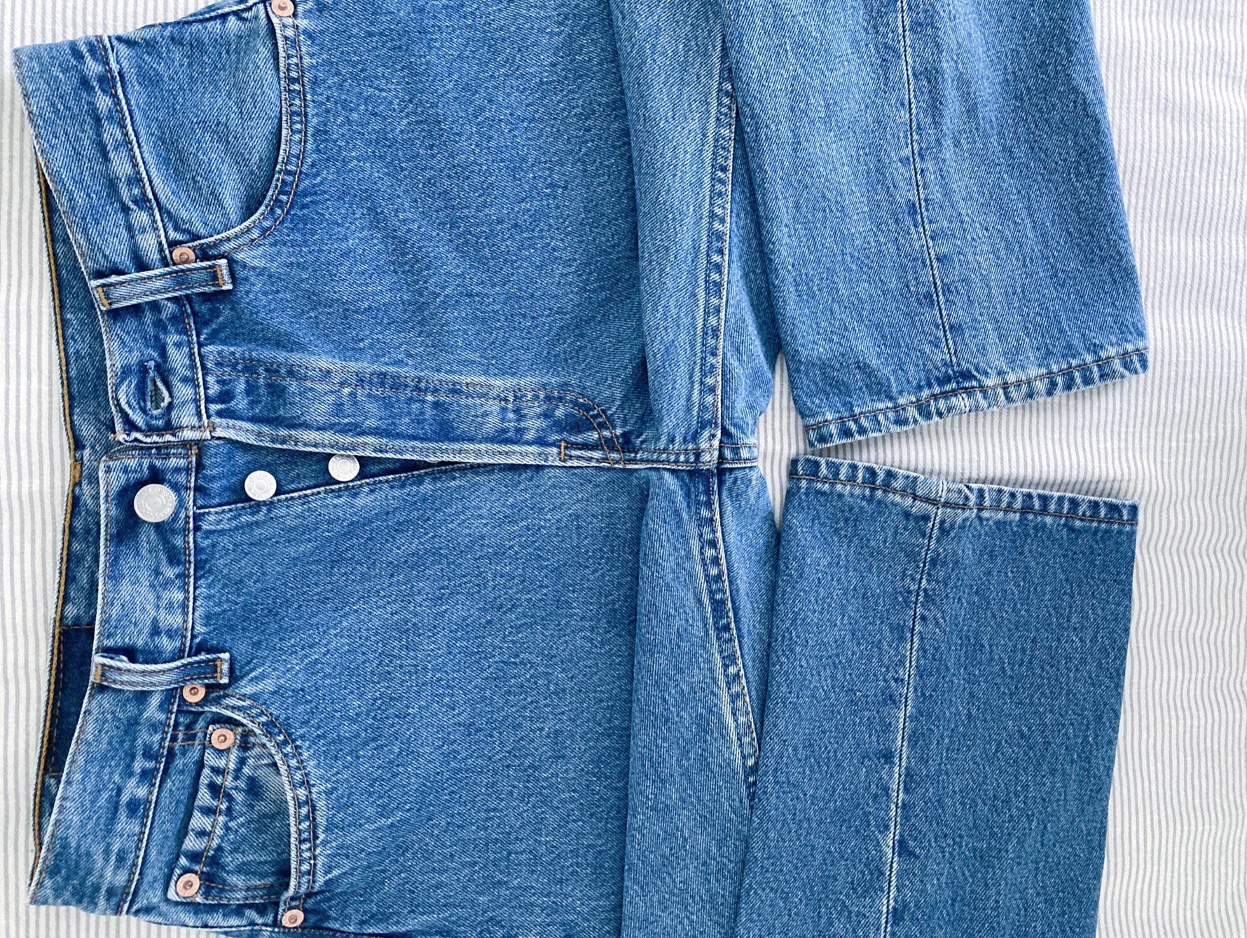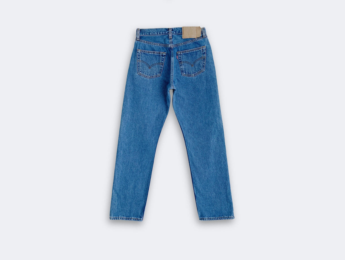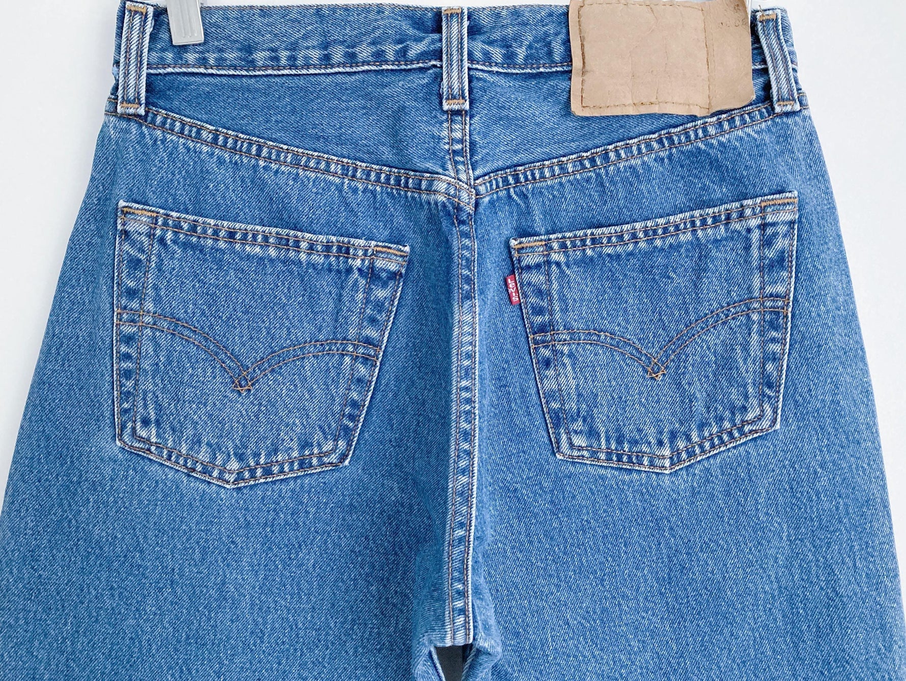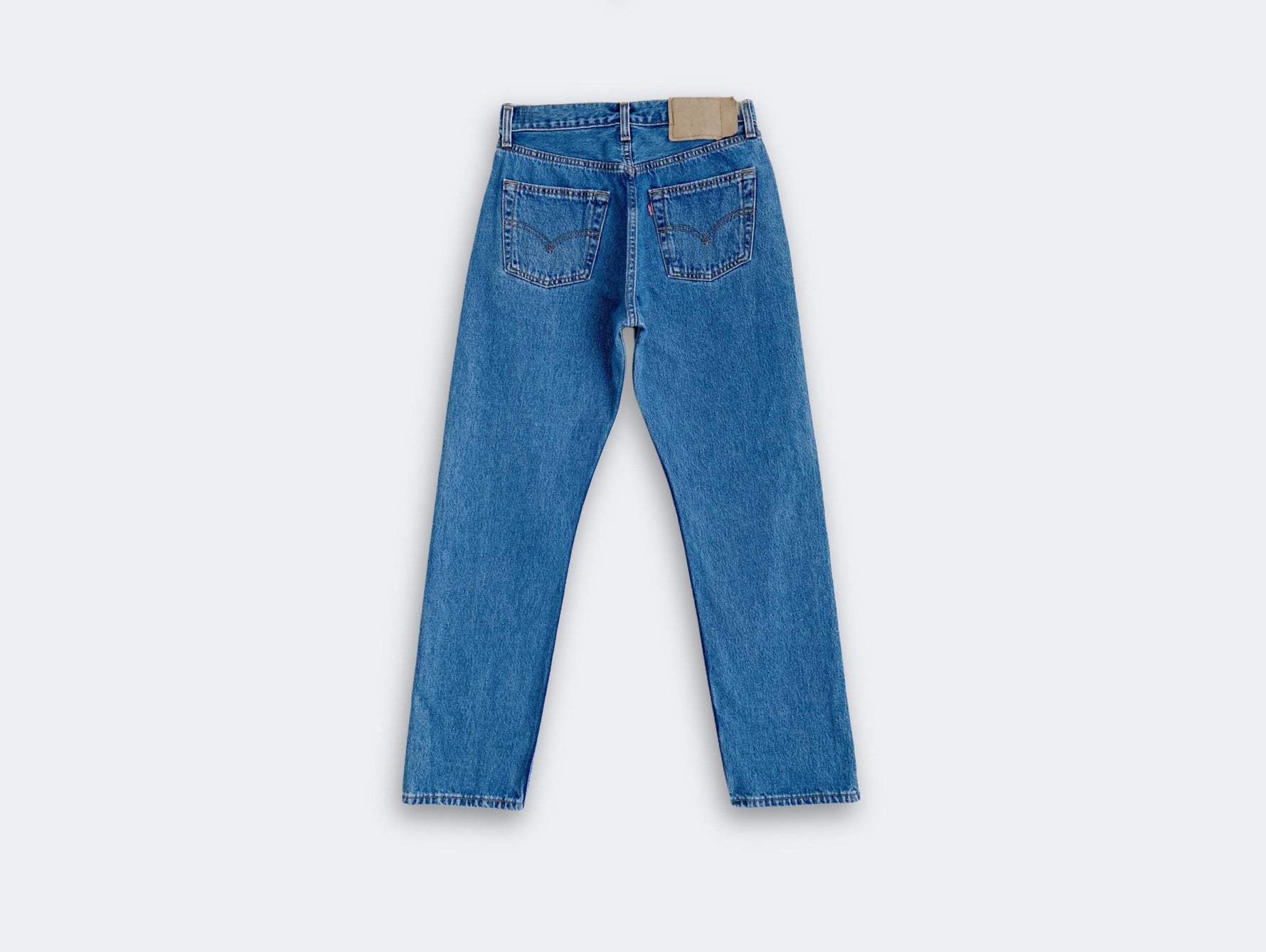 90s, bleu moyen, coupe femme, made in USA. Taille : 36 cm, Hauteur taille : 29 cm, Hanches : 53,5 cm, Cuisse : 28 cm, Longueur totale : 101,5 cm, Ourlets : 19 cm, Longueur entrejambe : 77,5 cm