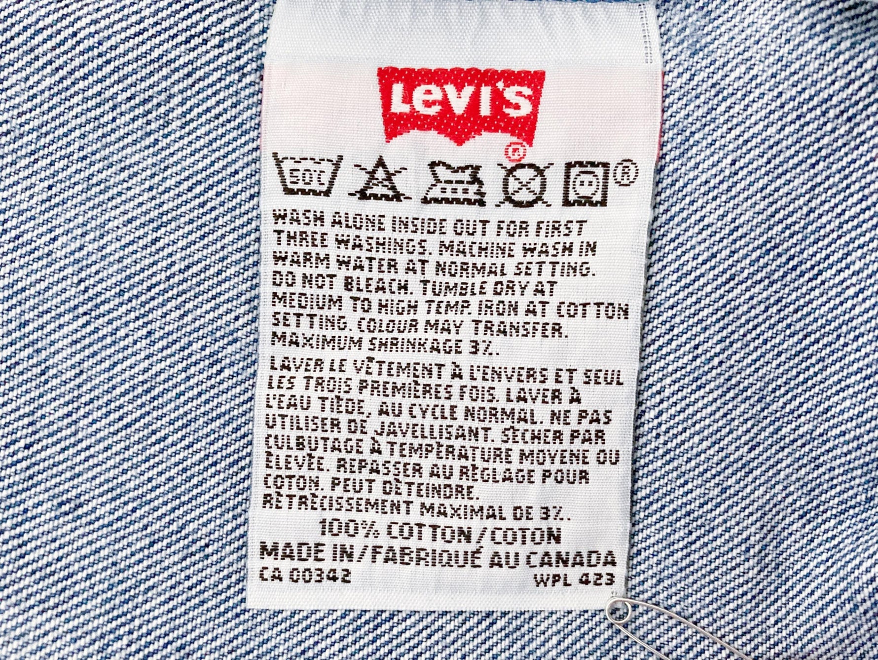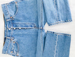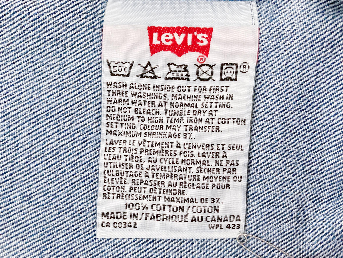90s, coupe mixte, bleu moyen, made in Canada. Taille : 37 cm, Hauteur taille : 29 cm, Hanches : 55 cm, Cuisse : 28,5 cm, Longueur totale : 106,5 cm, Ourlets : 19 cm, Longueur entrejambe : 81,5 cm