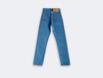 90s, coupe femme, bleu moyen, made in USA. Taille : 30,5 cm, Hauteur taille : 26,5 cm, Hanches : 46,5 cm, Cuisse : 25 cm, Longueur totale : 100,5 cm, Ourlets : 16,5 cm, Longueur entrejambe : 76 cm