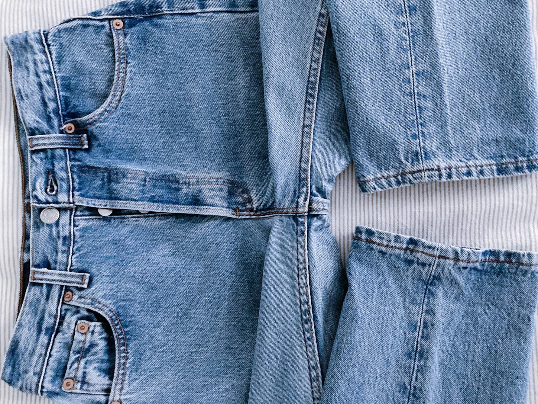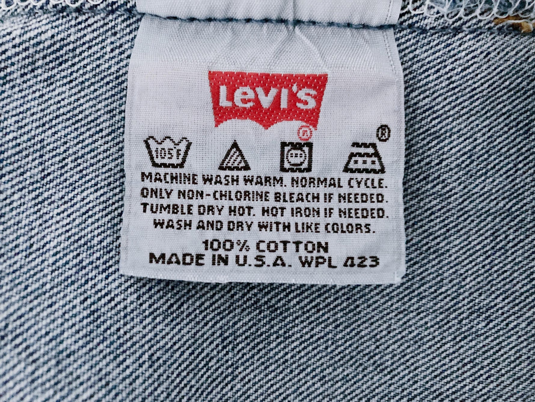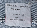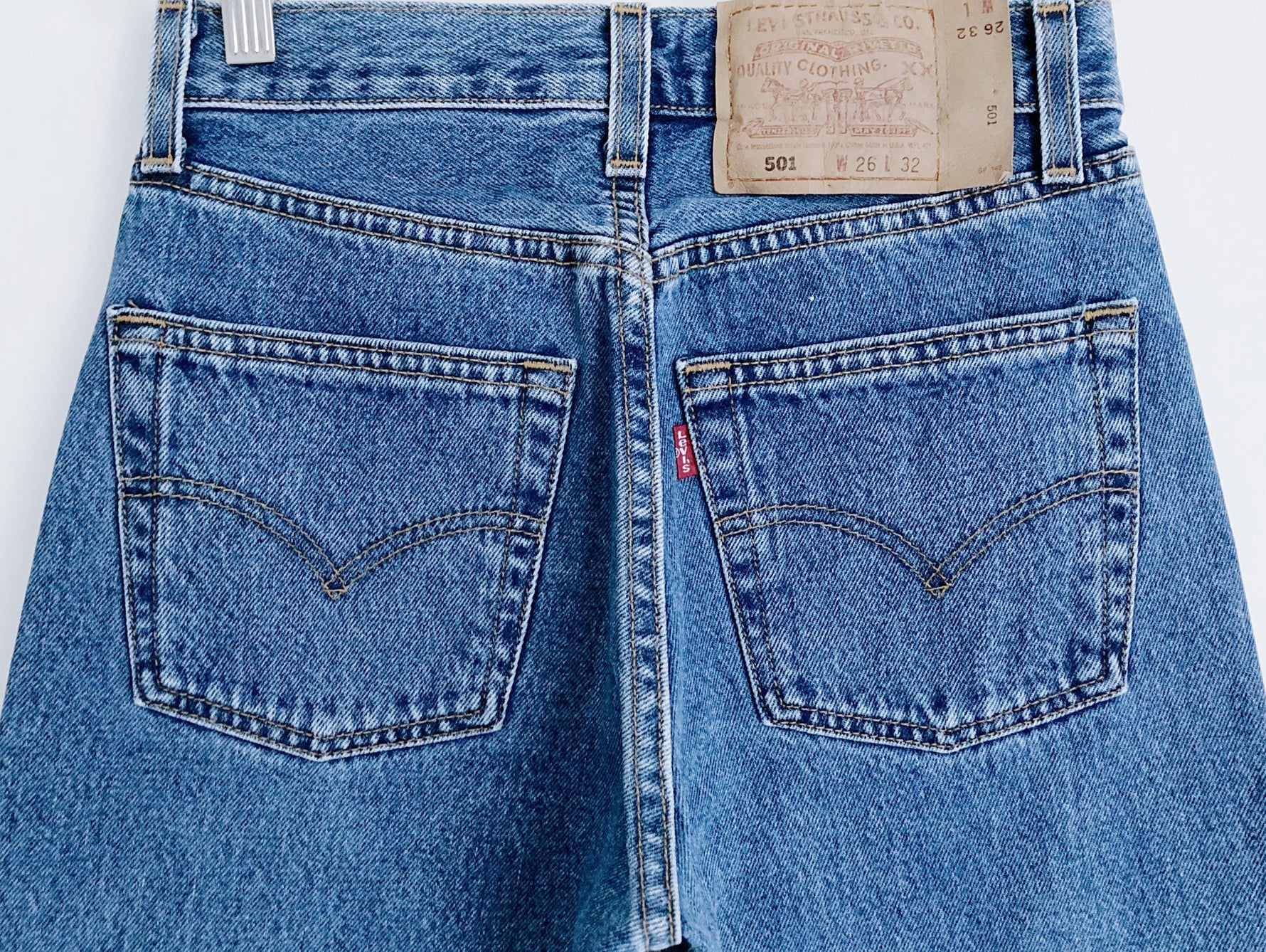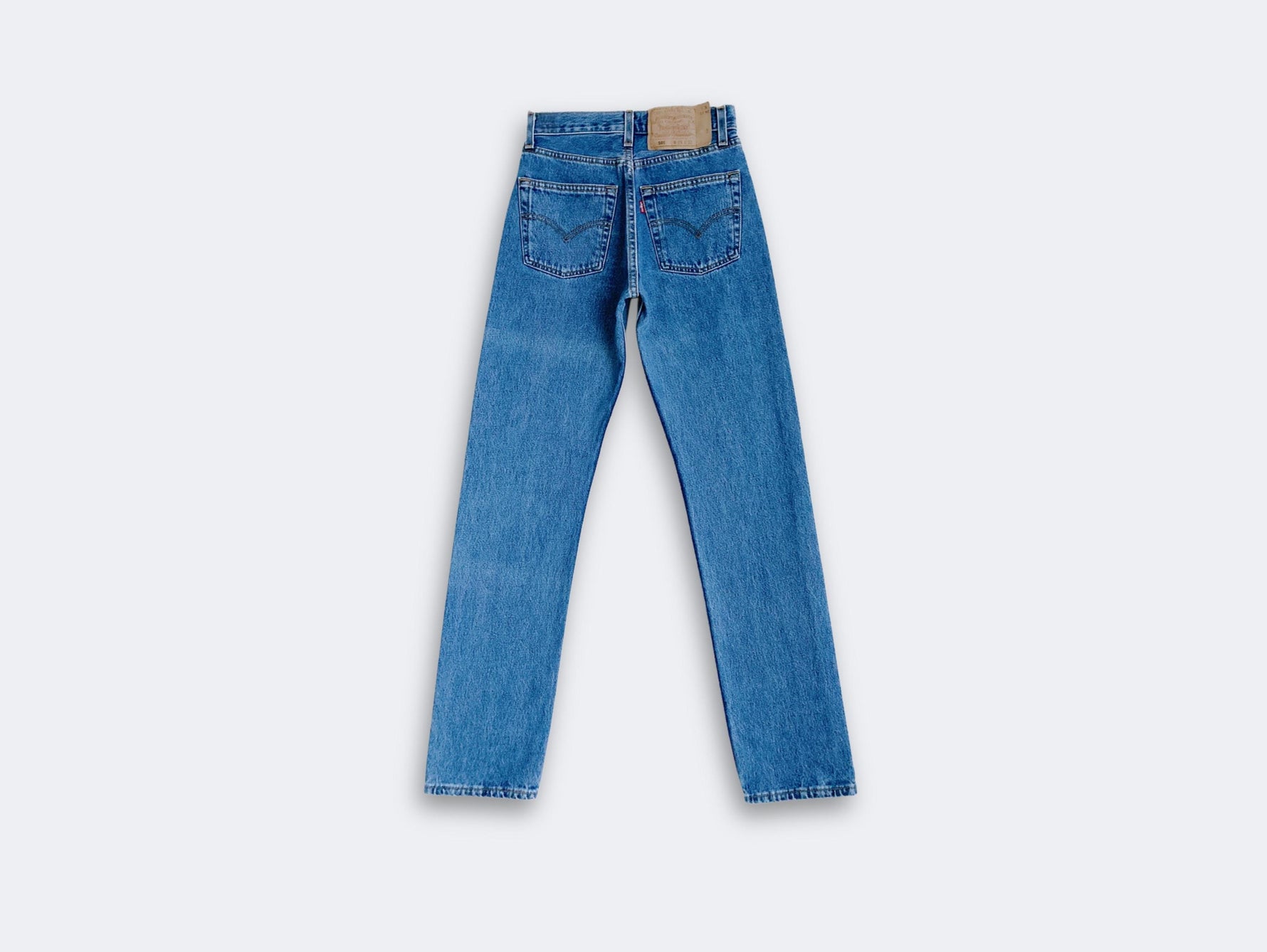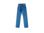 90s, femme, bleu moyen, made in USA. Taille : 32 cm, Hauteur taille : 26,5 cm, Hanches : 49 cm, Cuisse : 26 cm, Longueur totale : 105,5 cm, Ourlets : 18 cm, Longueur entrejambe : 81,5 cm