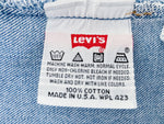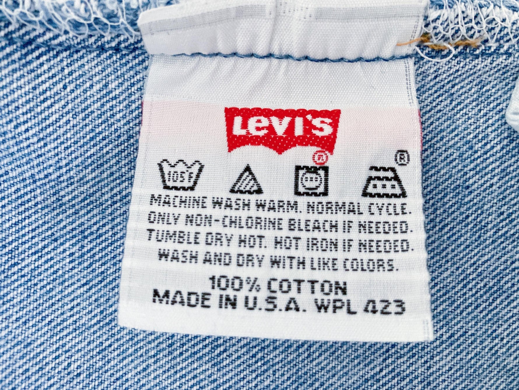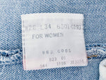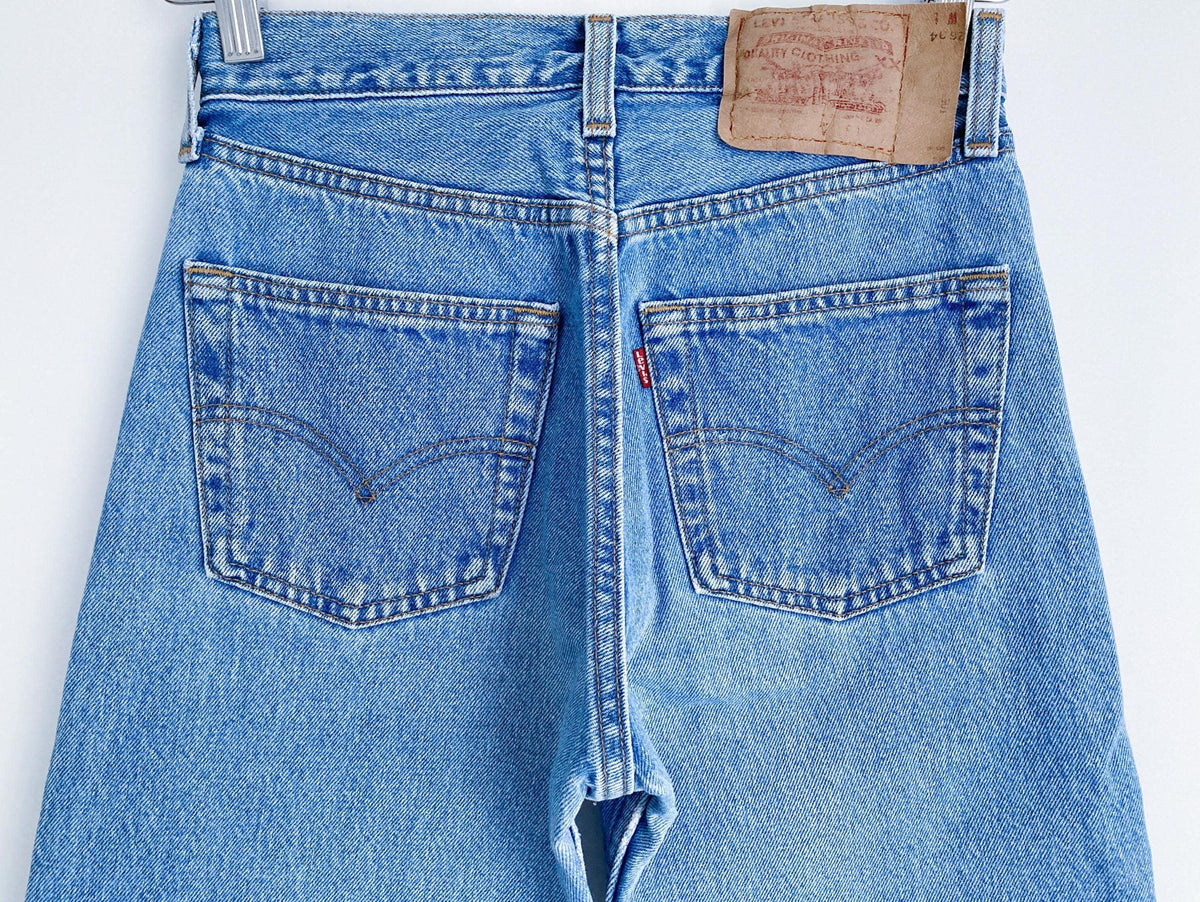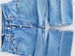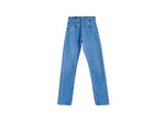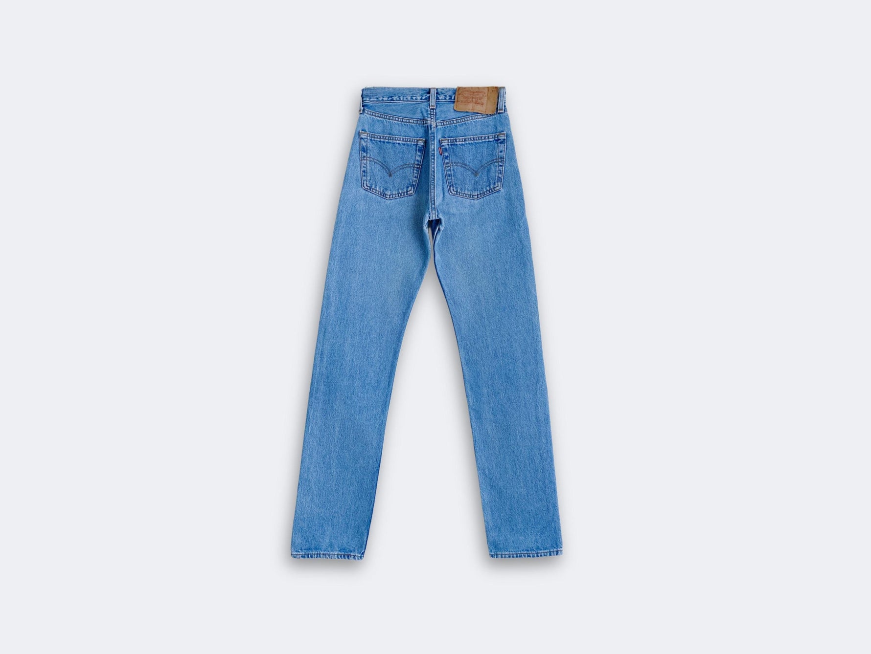 90s, coupe femme, bleu moyen, made in USA. Taille : 33 cm, Hauteur taille : 28 cm, Hanches : 49,5 cm, Cuisse : 26 cm, Longueur totale : 112 cm, Ourlets : 18 cm, Longueur entrejambe : 87,5 cm