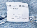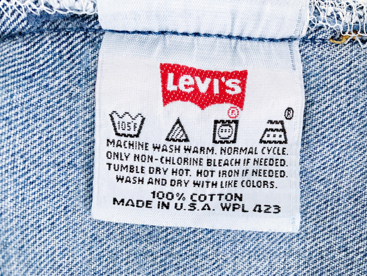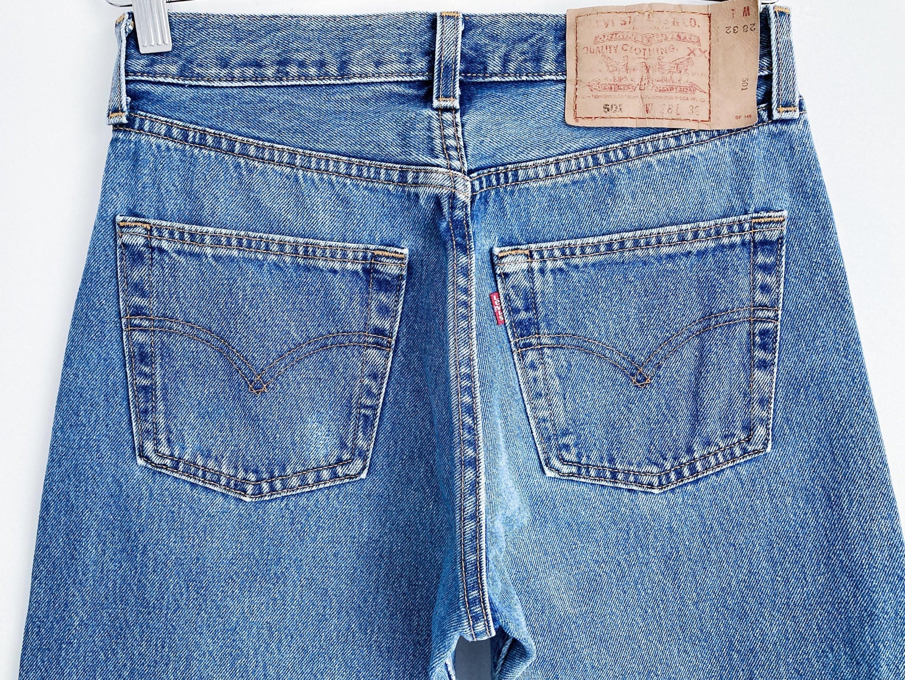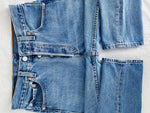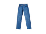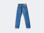 90s, coupe femme, bleu moyen, made in USA. Taille : 35 cm, Hauteur taille : 28 cm, Hanches : 49,5 cm, Cuisse : 26,5 cm, Longueur totale : 104 cm, Ourlets : 18,5 cm, Longueur entrejambe : 81,5 cm