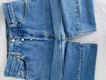 90s, coupe femme, bleu moyen, made in USA. Taille : 37 cm, Hauteur taille : 29 cm, Hanches : 52 cm, Cuisse : 28 cm, Longueur totale : 106,5 cm, Ourlets : 18,5 cm, Longueur entrejambe : 81,5 cm