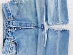 90s, coupe femme, bleu clair, made in USA. Taille : 38 cm, Hauteur taille : 30 cm, Hanches : 54,5 cm, Cuisse : 29 cm, Longueur totale : 105,5 cm, Ourlets : 19 cm, Longueur entrejambe : 81,5 cm