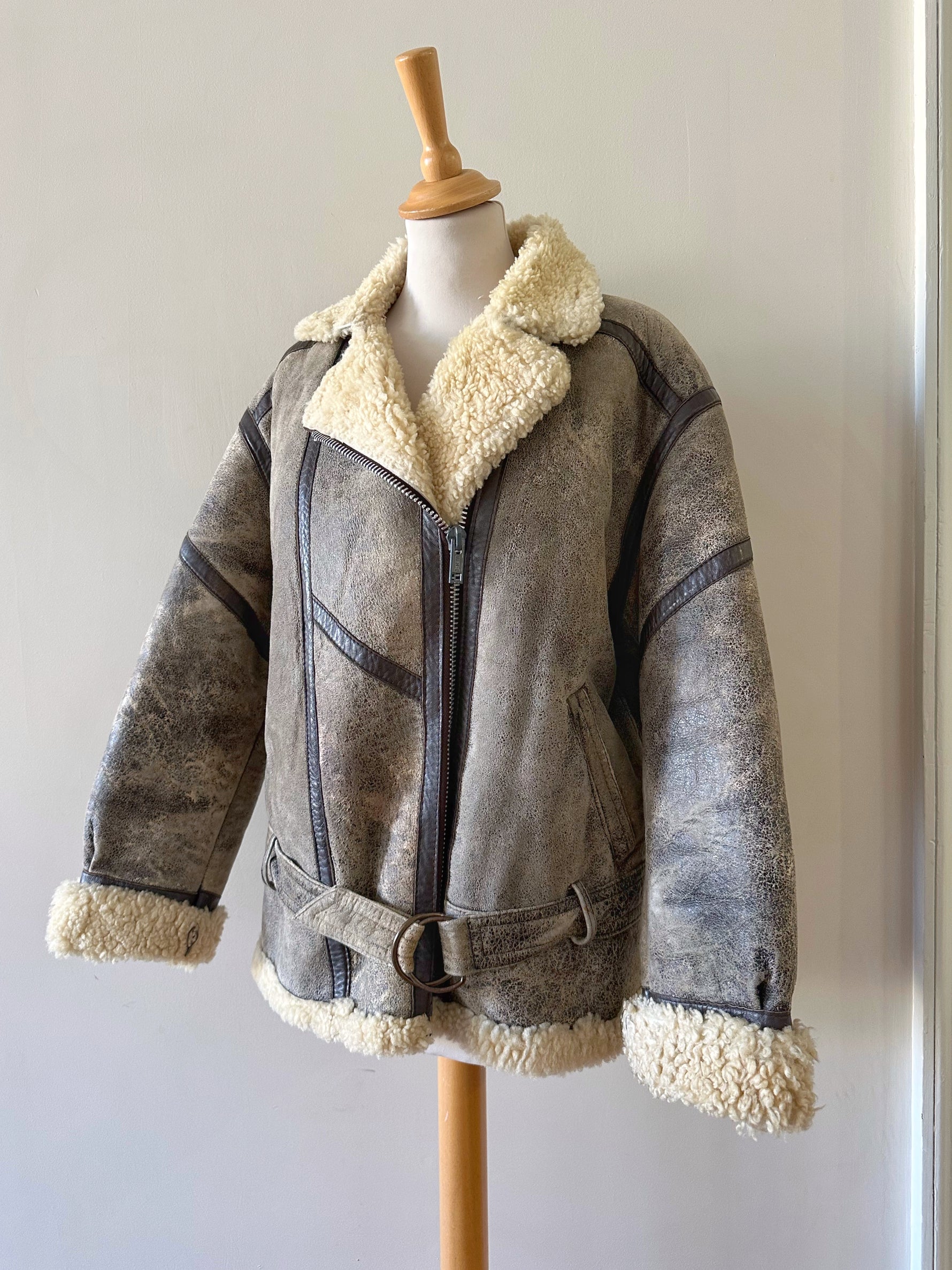 Prix unitaire parBombardier peau lainée, en mouton retourné exterieur cuir effet used brun, interieur laine de mouton écru, fermeture éclair perfecto, sangle à nouer aux hanches, fabriqué en France. Taille 36 porté ici sur un mannequin T36. Longueur 68cm.