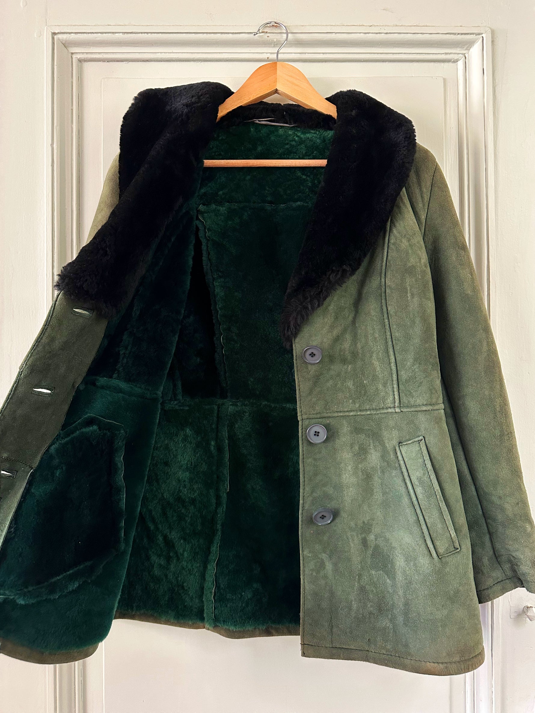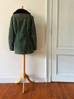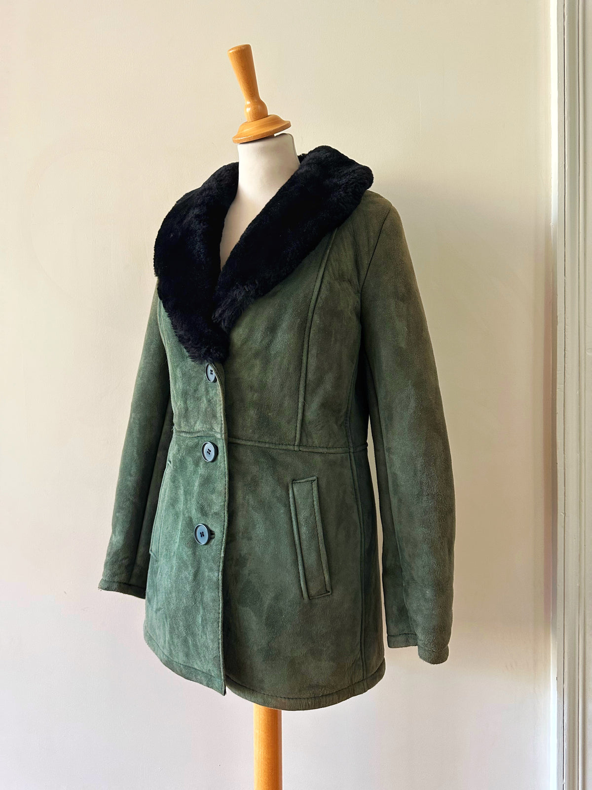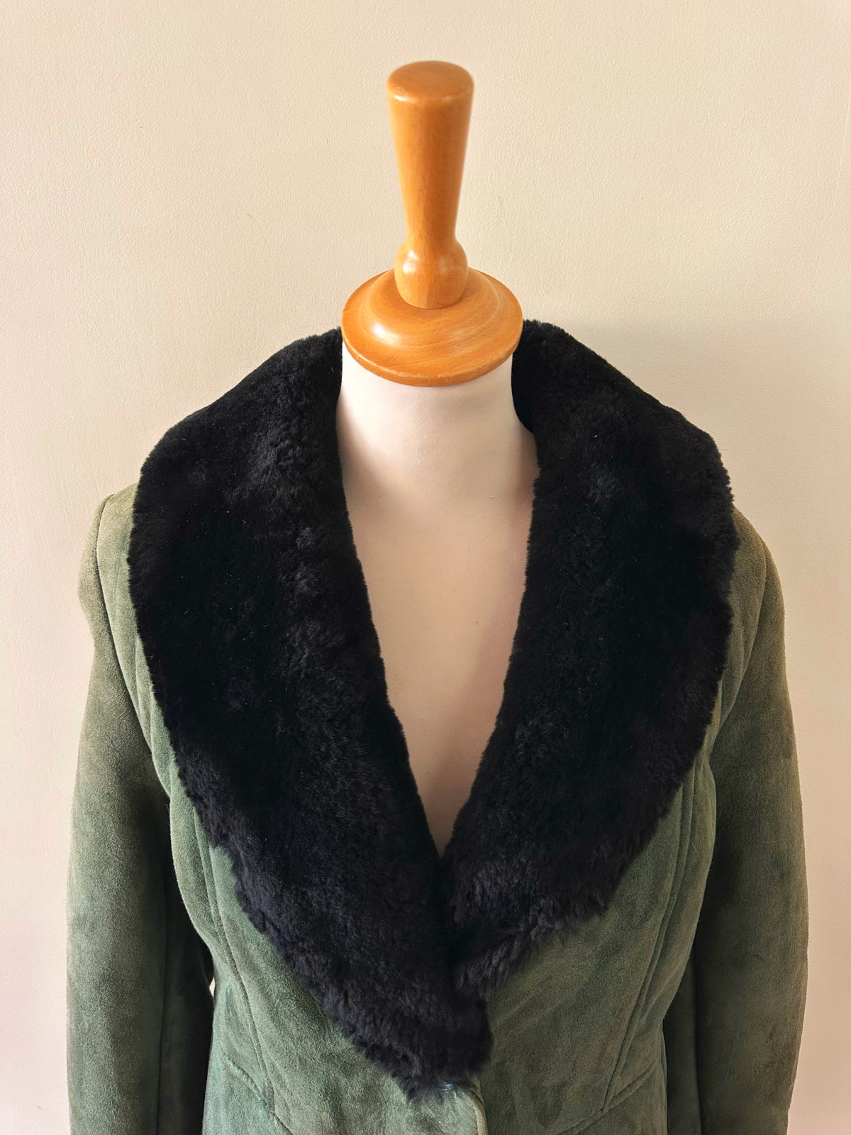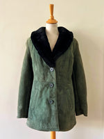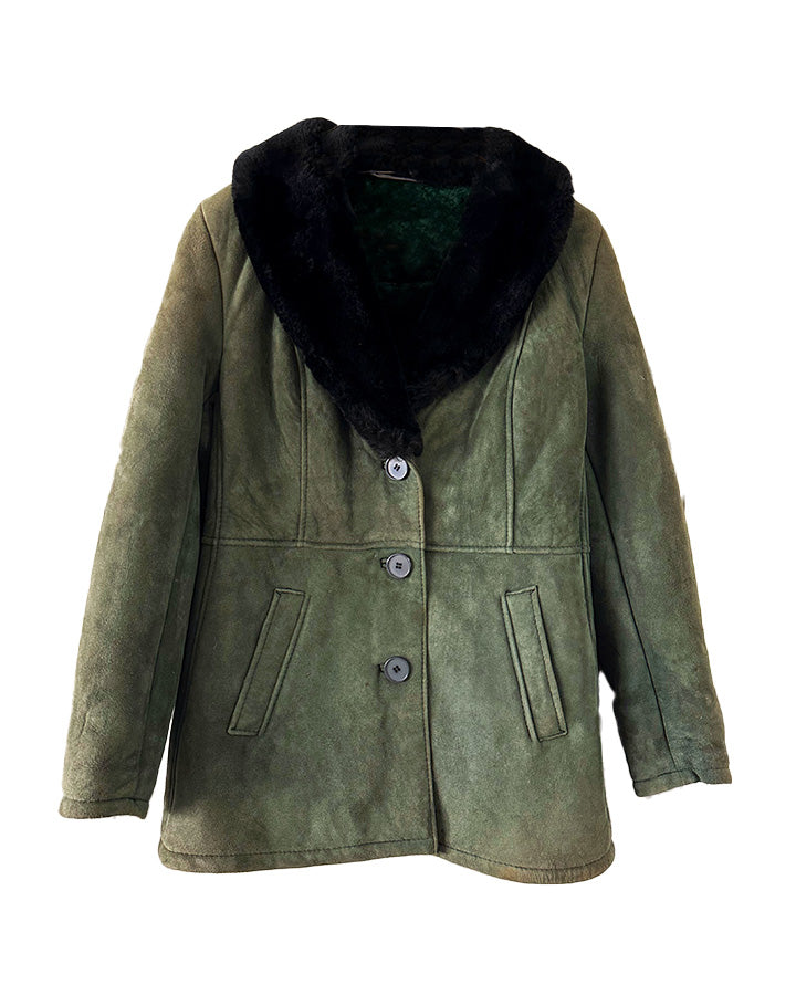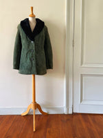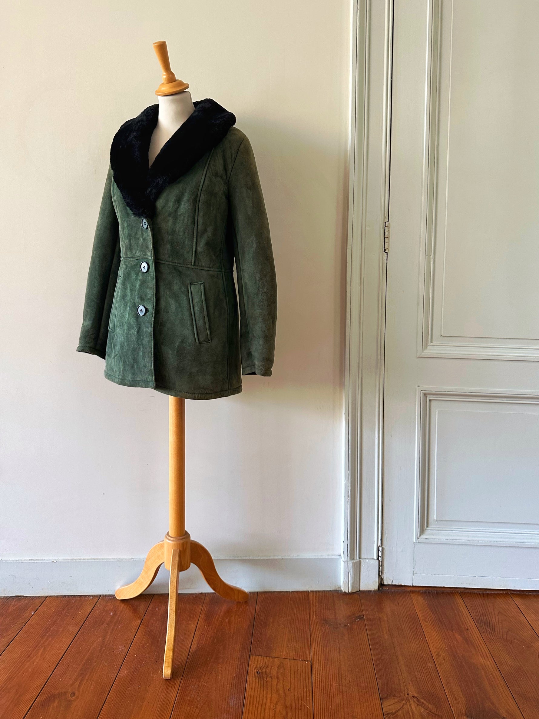 Prix unitaire parManteau peau lainée, en mouton retourné exterieur daim vert bouteille, interieur en laine de mouton vert, et col noir, boutonné, fabriquée en Italie, taille 36 porté ici sur un mannequin T36. Aisselles 45cm, longueur 75cm.