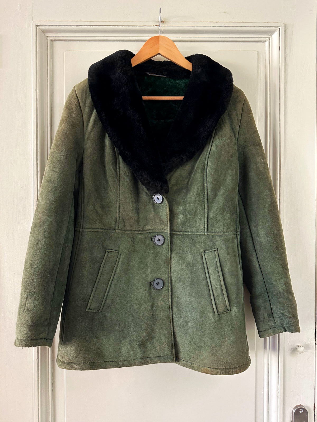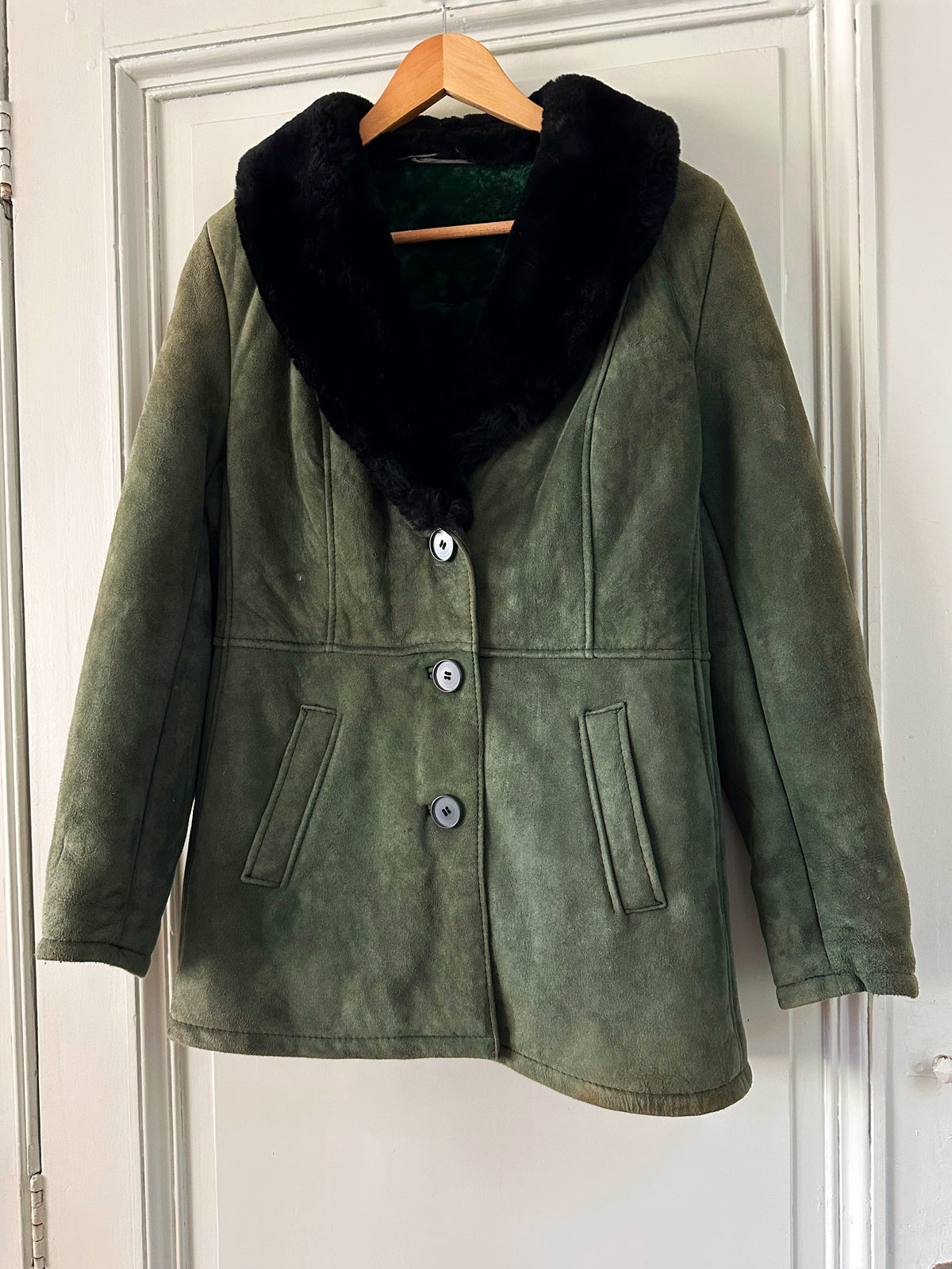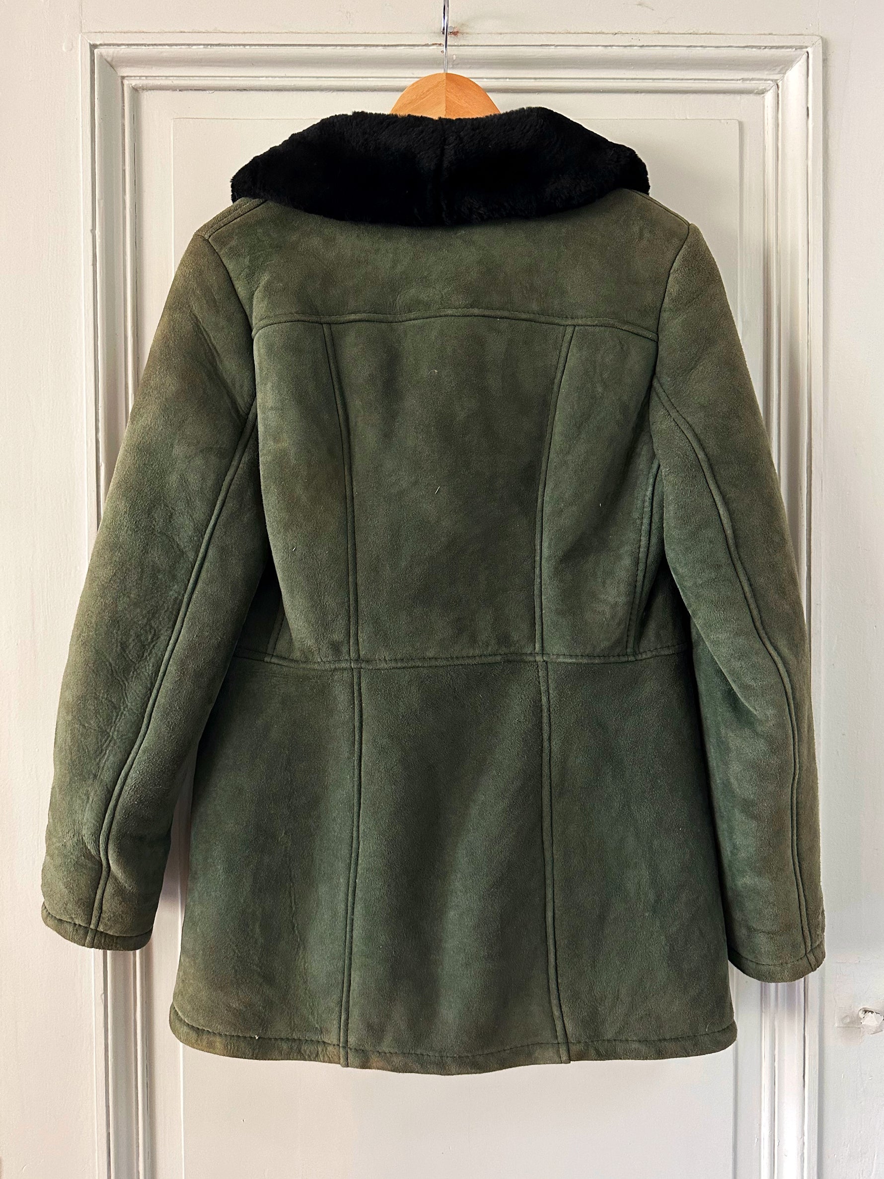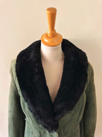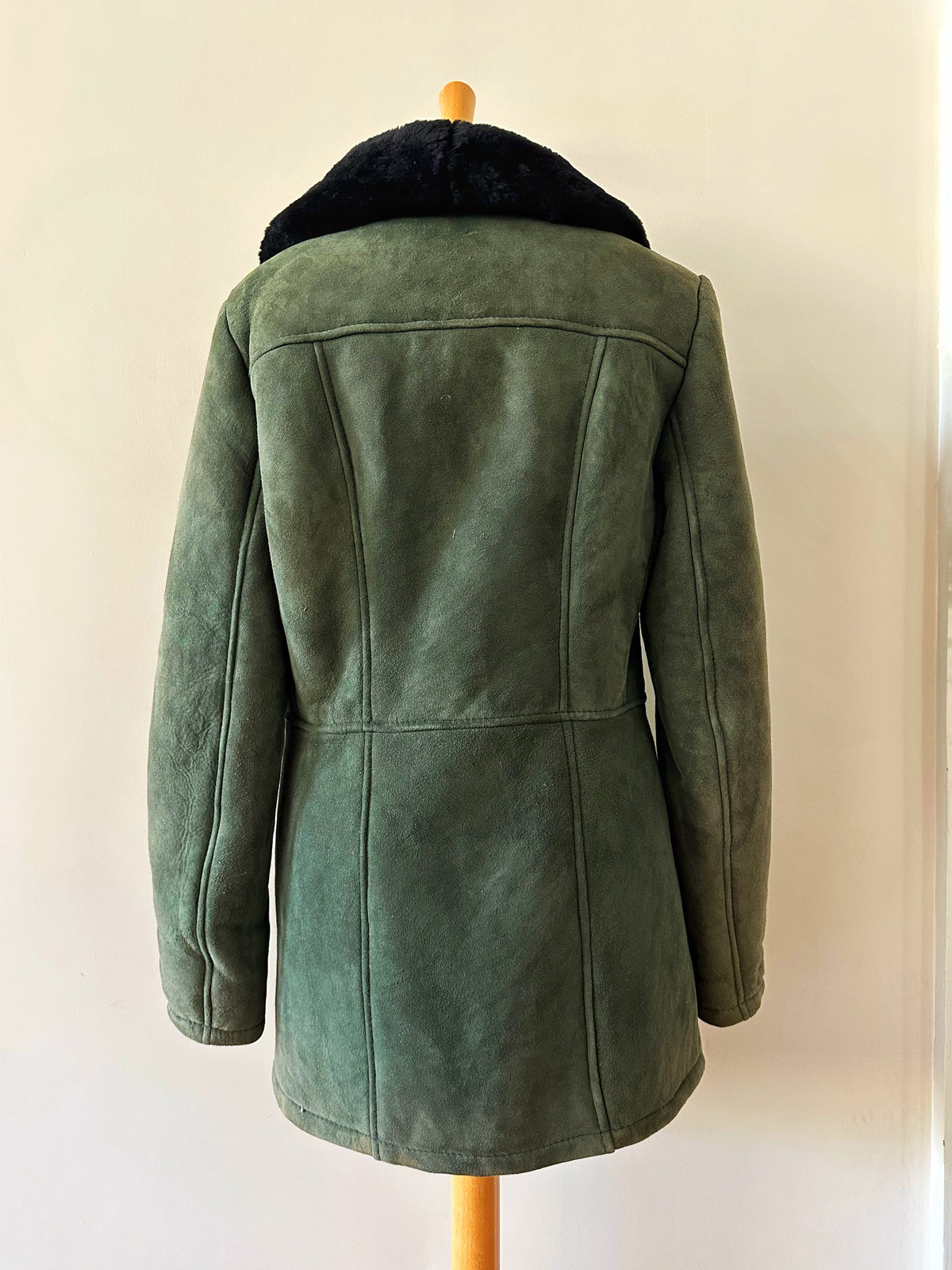 Prix unitaire parManteau peau lainée, en mouton retourné exterieur daim vert bouteille, interieur en laine de mouton vert, et col noir, boutonné, fabriquée en Italie, taille 36 porté ici sur un mannequin T36. Aisselles 45cm, longueur 75cm.