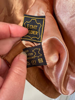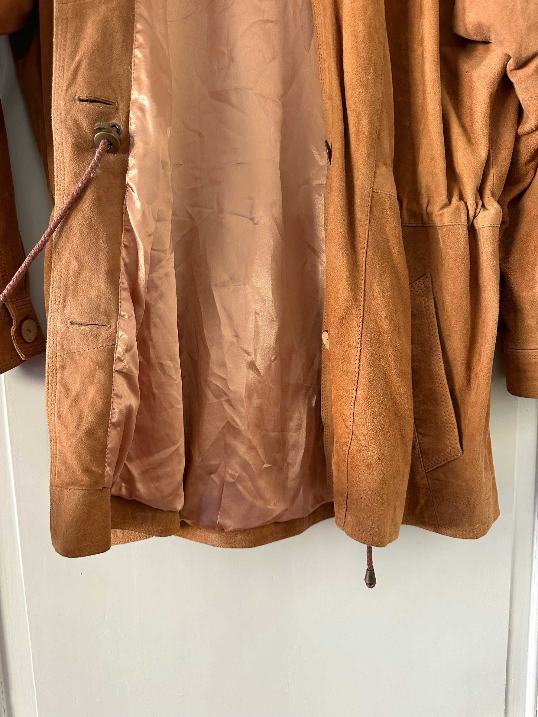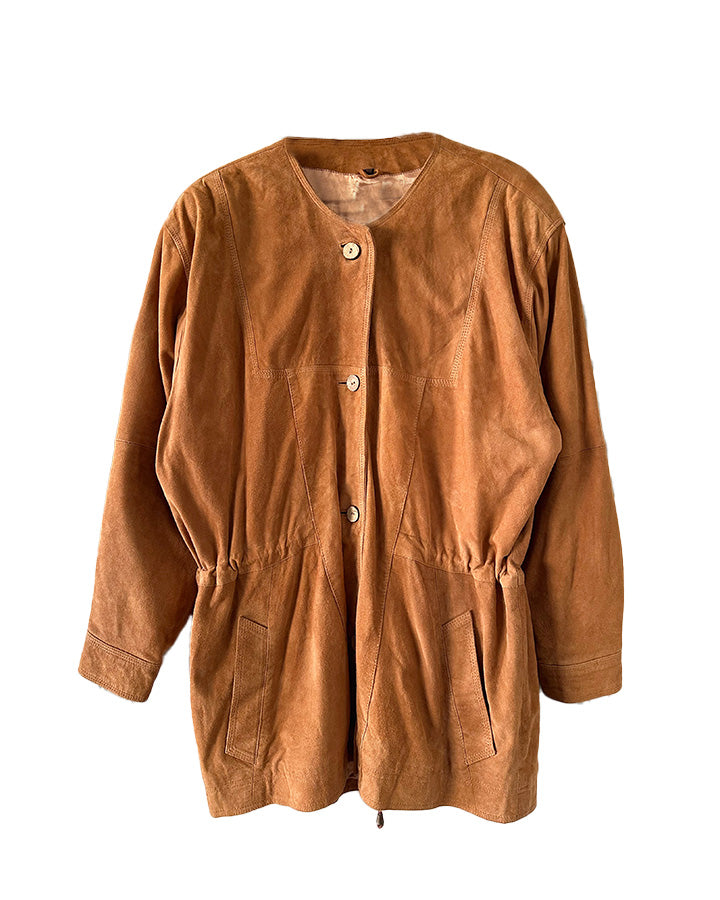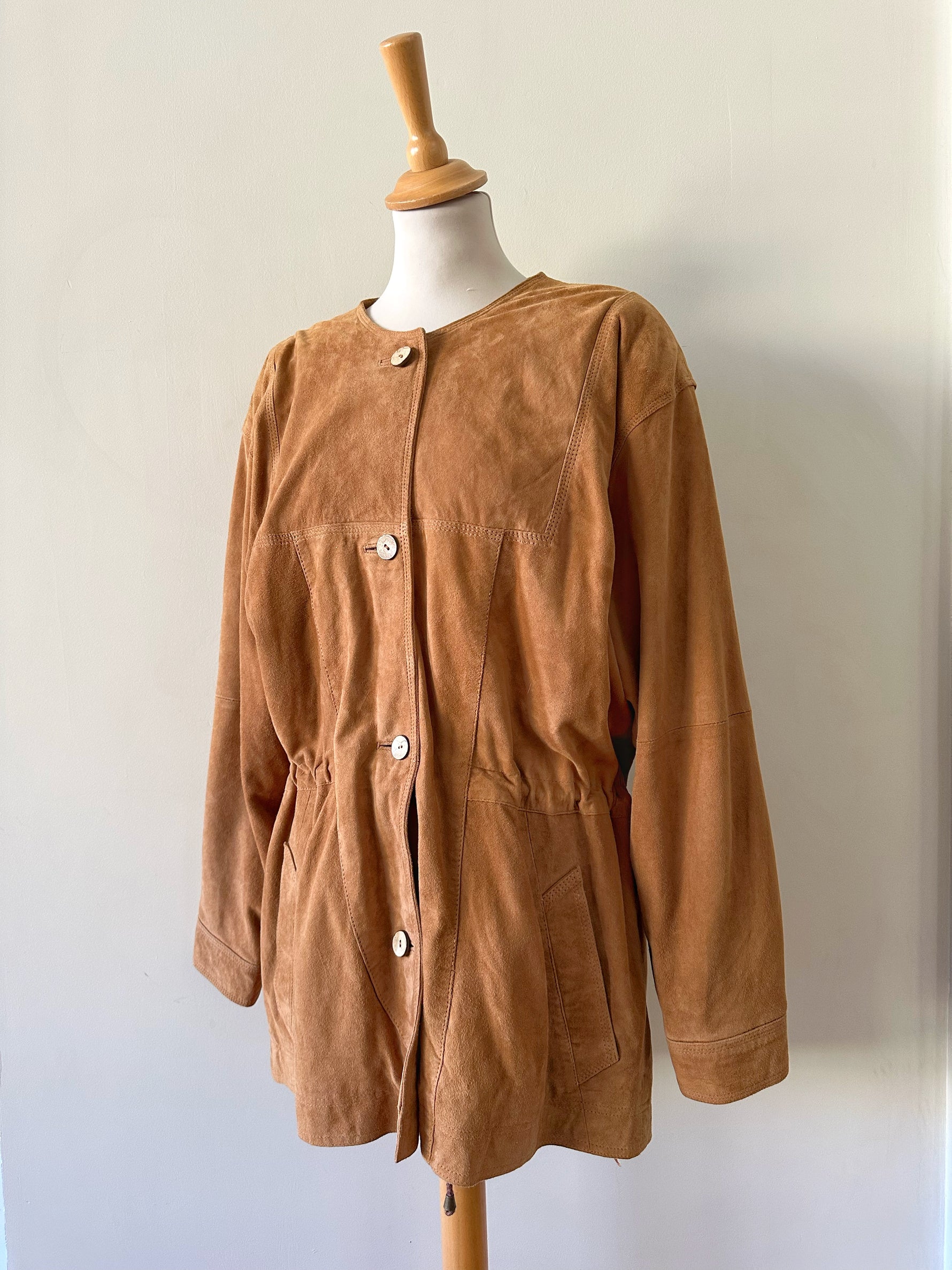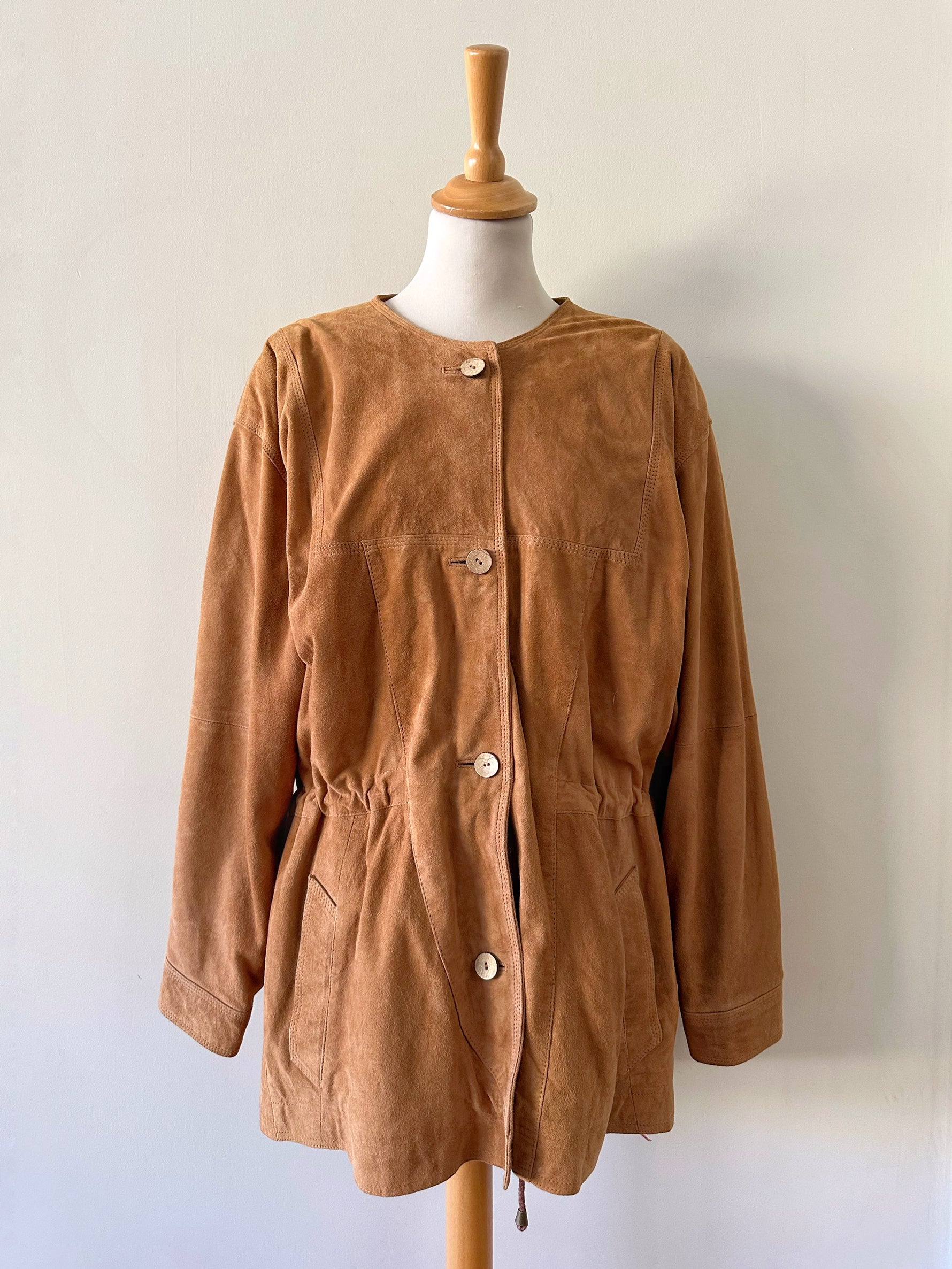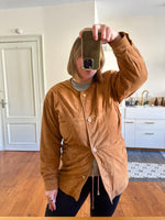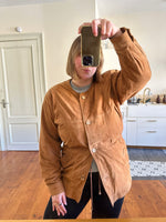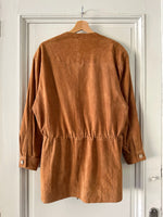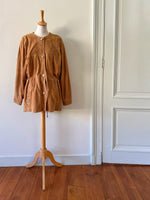 Prix unitaire parSaharienne en daim chèvre velours caramel, col rond, taille à resserrer et à froncer par des cordons intérieurs, boutonnée, fabriqué en Allemagne. Convient aux tailles 36 et 38 porté ici sur un mannequin T36 et serrée sur une personne T40. Aisselles 48cm Longueur 78cm