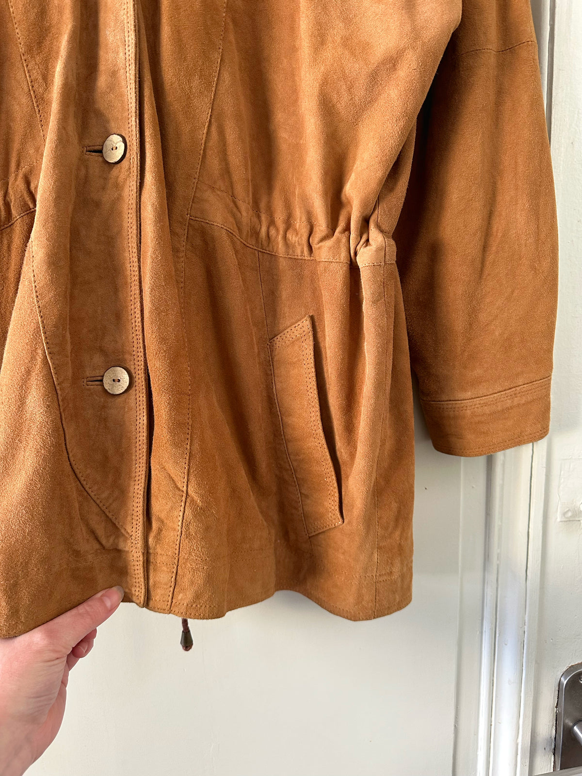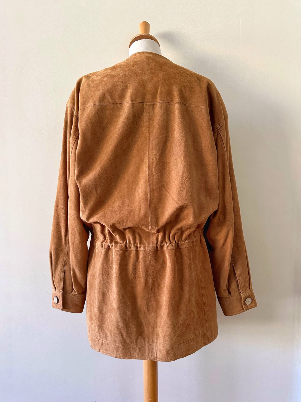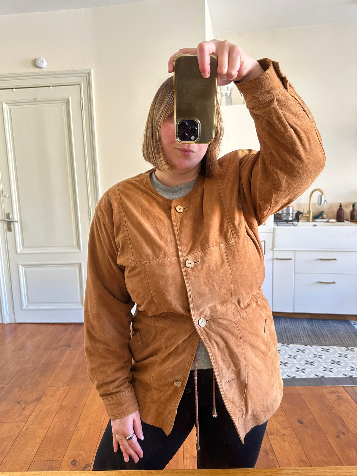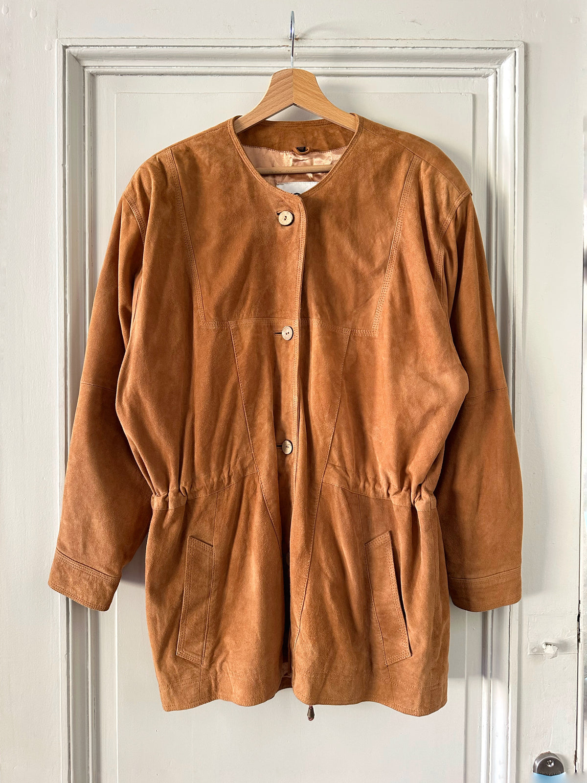 Prix unitaire parSaharienne en daim chèvre velours caramel, col rond, taille à resserrer et à froncer par des cordons intérieurs, boutonnée, fabriqué en Allemagne. Convient aux tailles 36 et 38 porté ici sur un mannequin T36 et serrée sur une personne T40. Aisselles 48cm Longueur 78cm