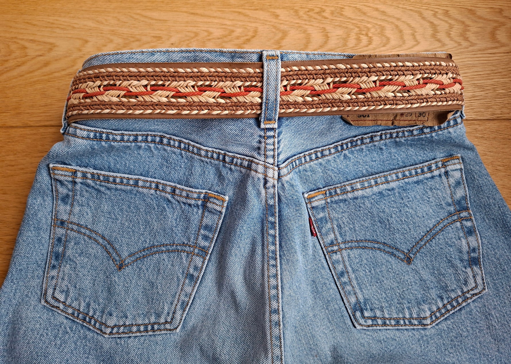 Prix unitaire parCeinture en cuir marron et textile Made in France. Boucle en métal argenté et embossé. Longueur totale 80cm Largeur 40mm.Convient aux tailles 34/36.
