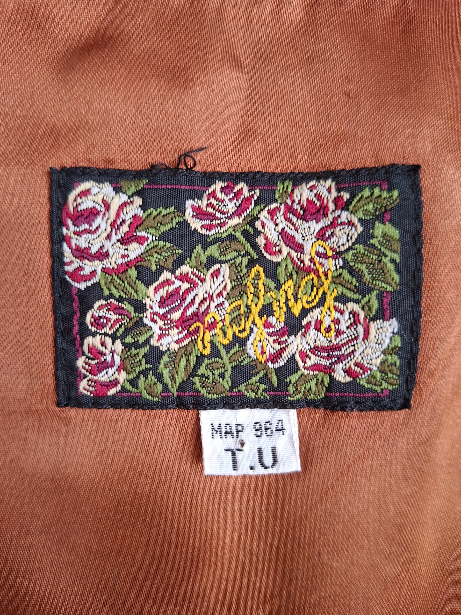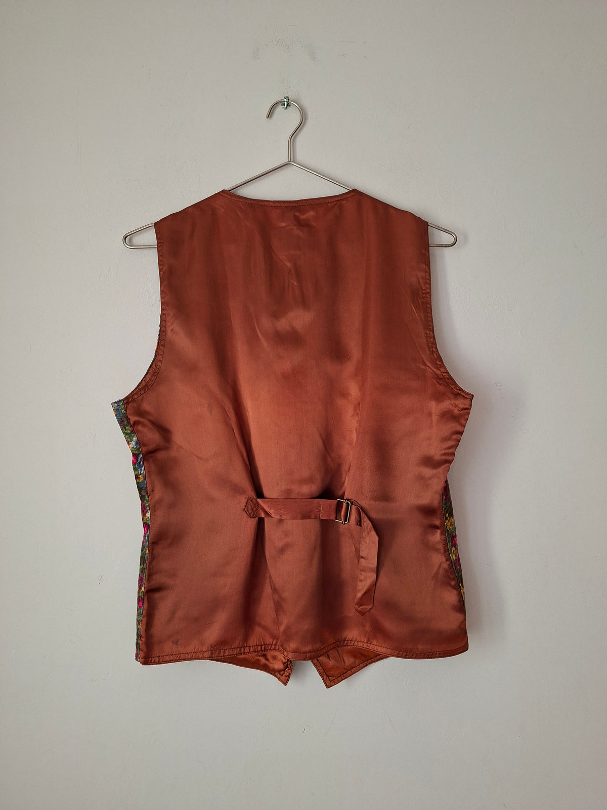 Prix unitaire parGilet en velours côtelé et à fleurs. Marque Nafnaf 90's. Dos en satin couleur cuivrée et martingale. Fermeture boutonnée. Porté par Patricia qui fait une taille 40.Les mesures à plat Épaules 38cm Aisselles 53cm Longueur 60cm (PAT31)