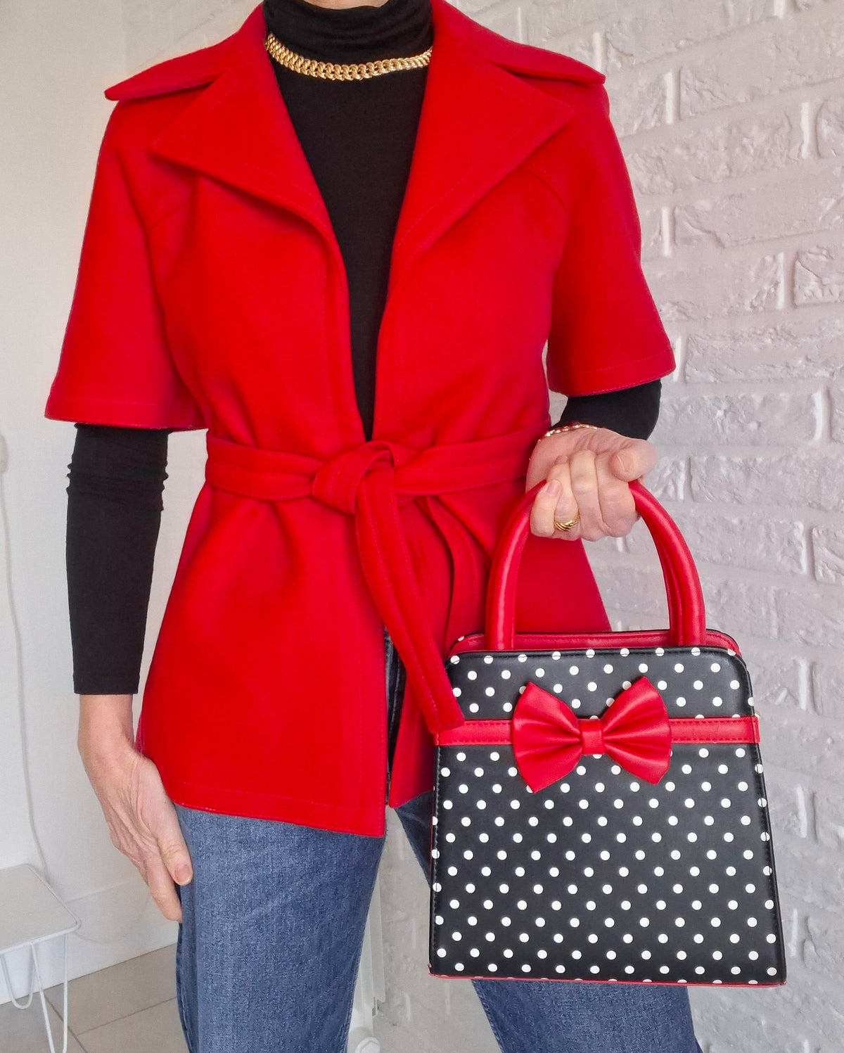 Prix unitaire parSaharienne en pure laine Made in France 70’s. A manches courtes et larges. Empiècements et emmanchures raglan. Ceinture assortie à nouer devant. A porter sur un top. Portée par Patricia qui fait une taille 40. Convient à une taille 38.Les mesures à plat : Épaules 42cm Aisselles 45cm.Longueur 65cm (PAT35)
