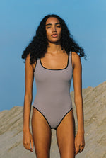 Maillot de bain une pièce à encolure carrée, dos nu et échancré.