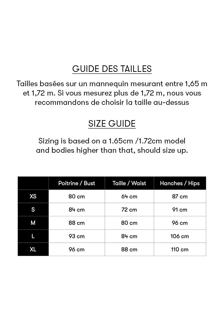 Mesurer un maillot de bain qui vous va bien dans votre placard et référer vous au guide des tailles.