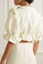 Notre blouse Angèle en tweed de coton écru, liens sur le devant, élastique à la taille, manches 3/4 bouffantes. Tissu provenant d’une maison de Couture française.