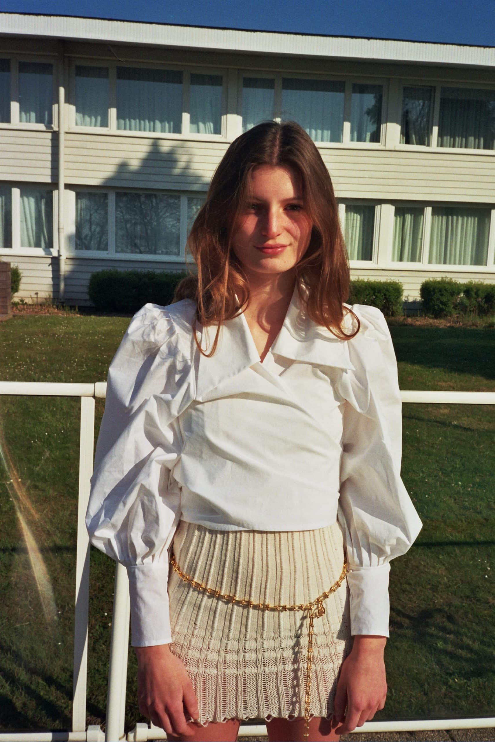 Blouse à porter de deux manières différentes, à nouer sur la poitrine ou dans le dos. Col pointu, larges manches bouffantes, larges poignets. 100% Coton.
